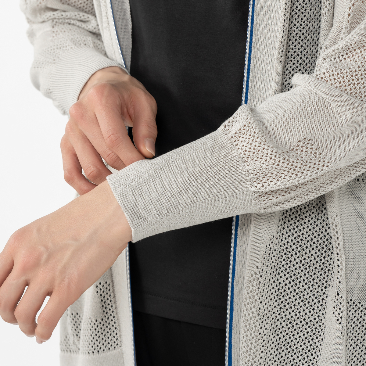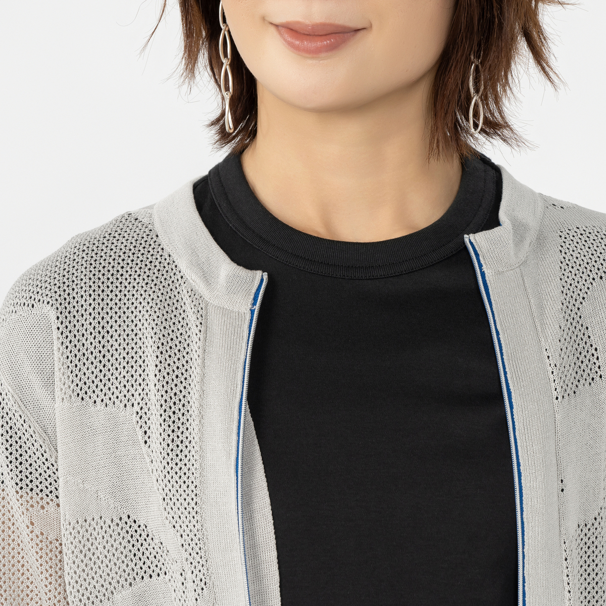 編地を変化させてイナズマを表現したニットカーディガンです。フロントジップで脱ぎ着しやすく、配色の衿ぐり裏がアクセントに。裾スリットが足捌きを良くし、スタイリッシュな着こなしを叶えます