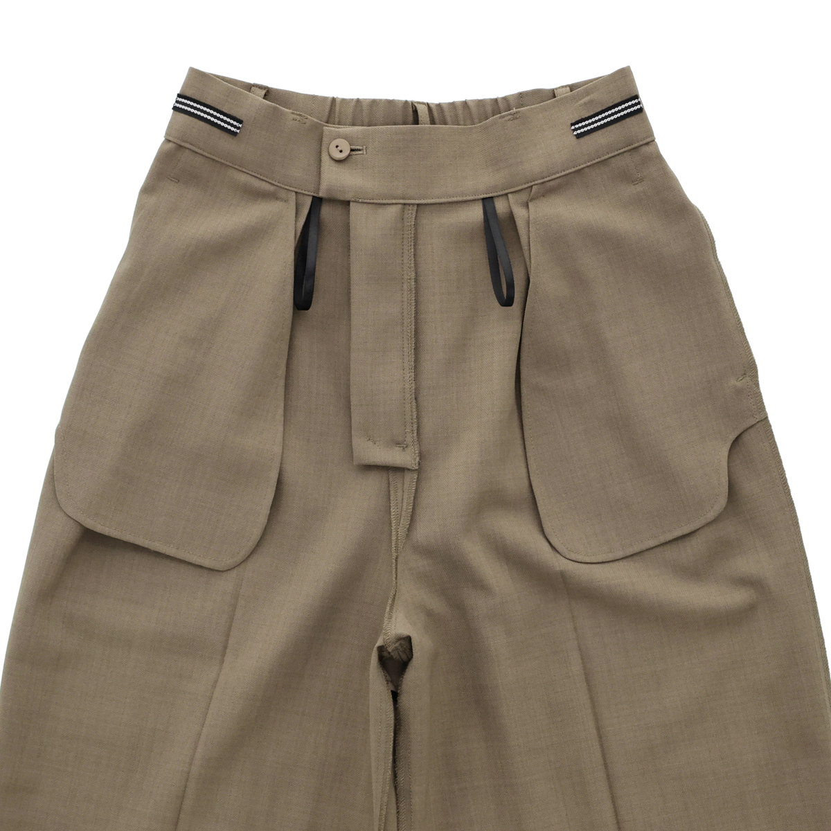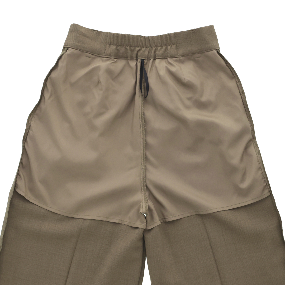 下着のラインが出ないように、ヒップ部分に透け防止の裏地を施しました。また、ウエスト二か所に滑り止めテープを取り付け、シャツをインしたスタイルでもずれにくく、安心して着用いただけます