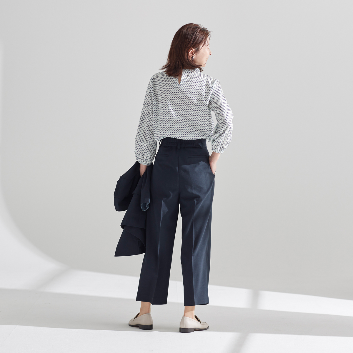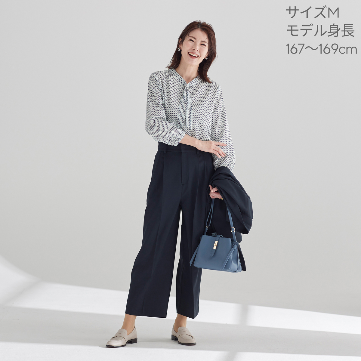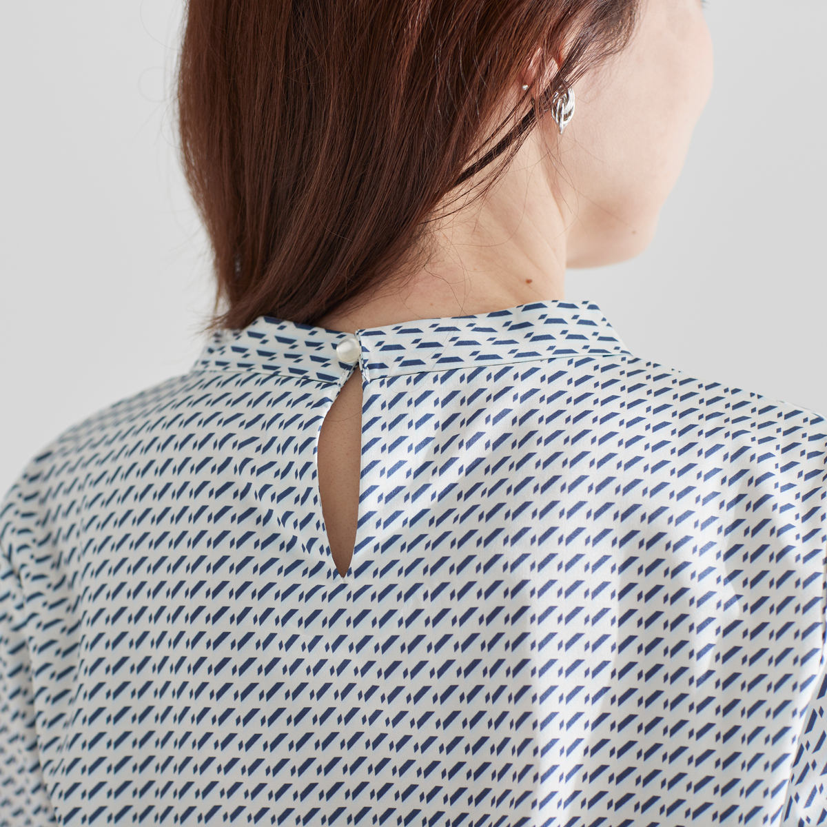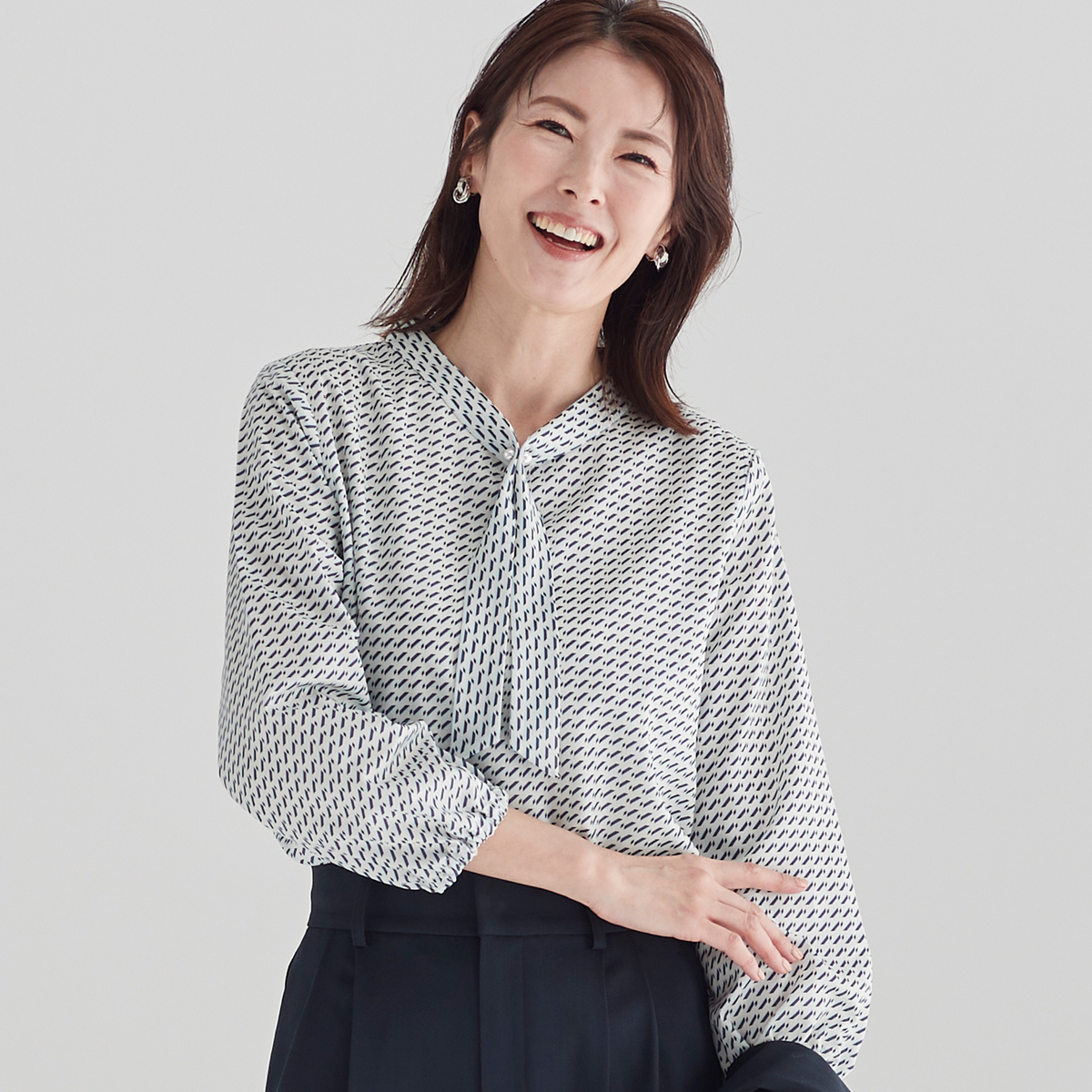 細かな柄が上品に映えるプリントブラウス。襟元のボウタイがさりげないアクセントになり、一枚ではもちろん、ジャケットのインにも活躍します。洗濯機洗い(ネット使用)可能で、扱いやすさも魅力の一着です