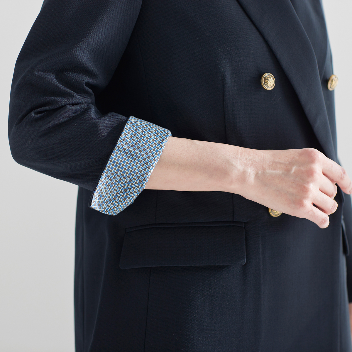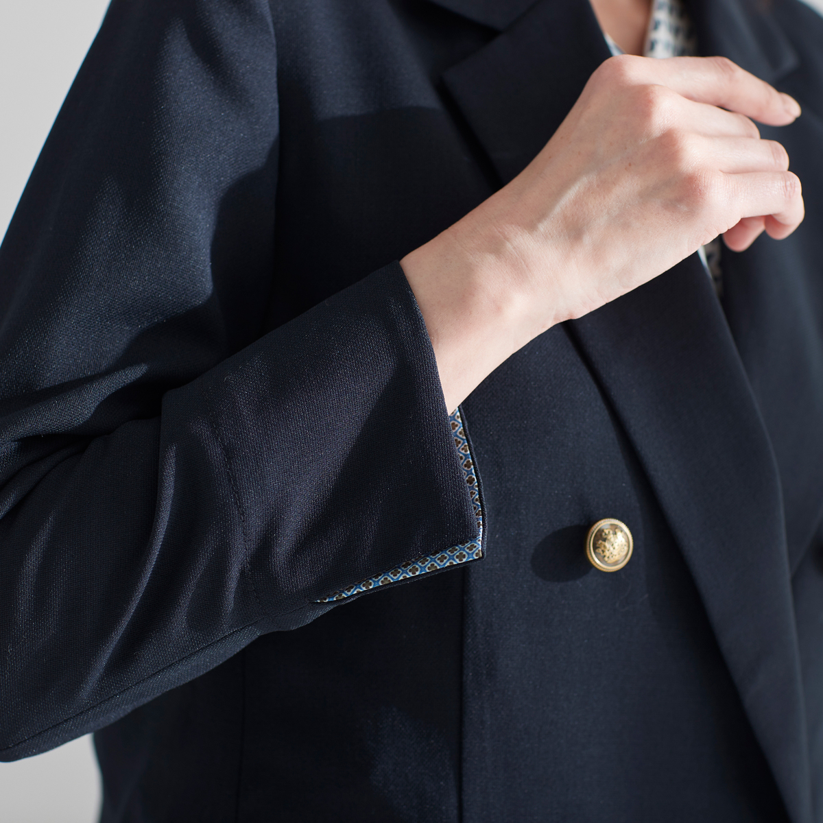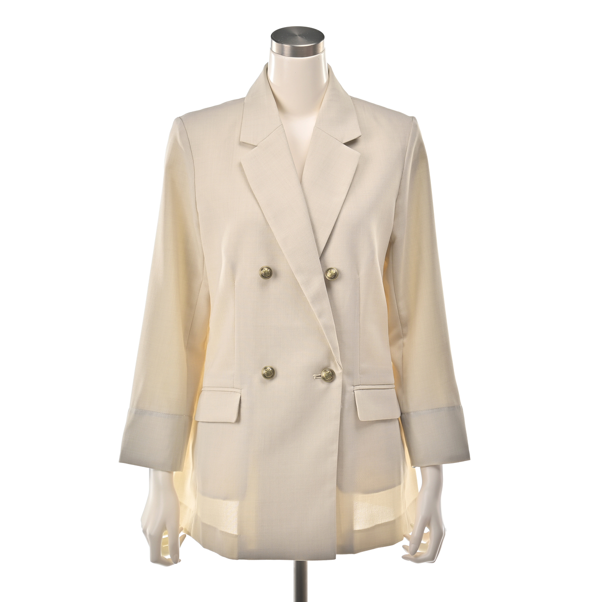 軽やかな素材を使用したダブルのジャケット。今風のシルエットに仕上げ、羽織るだけで旬の着こなしが楽しめます。袖口を折り返すとさりげなく柄が覗くデザインもポイントです