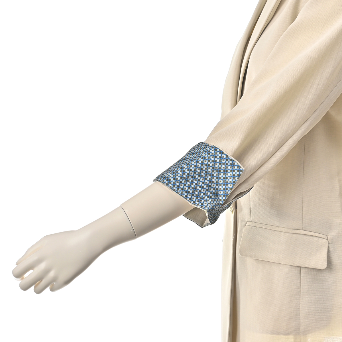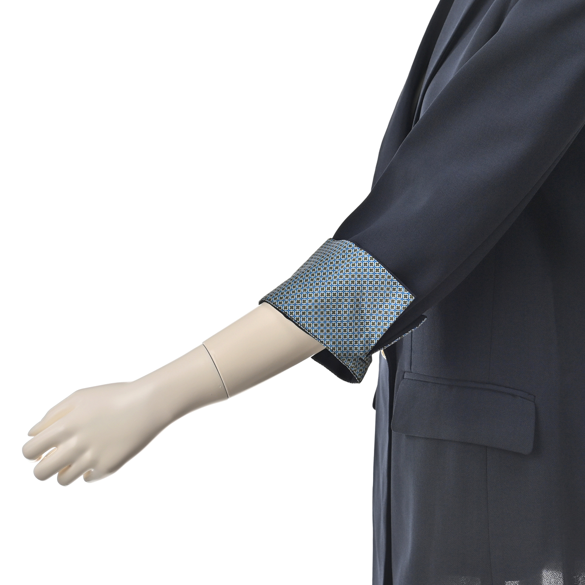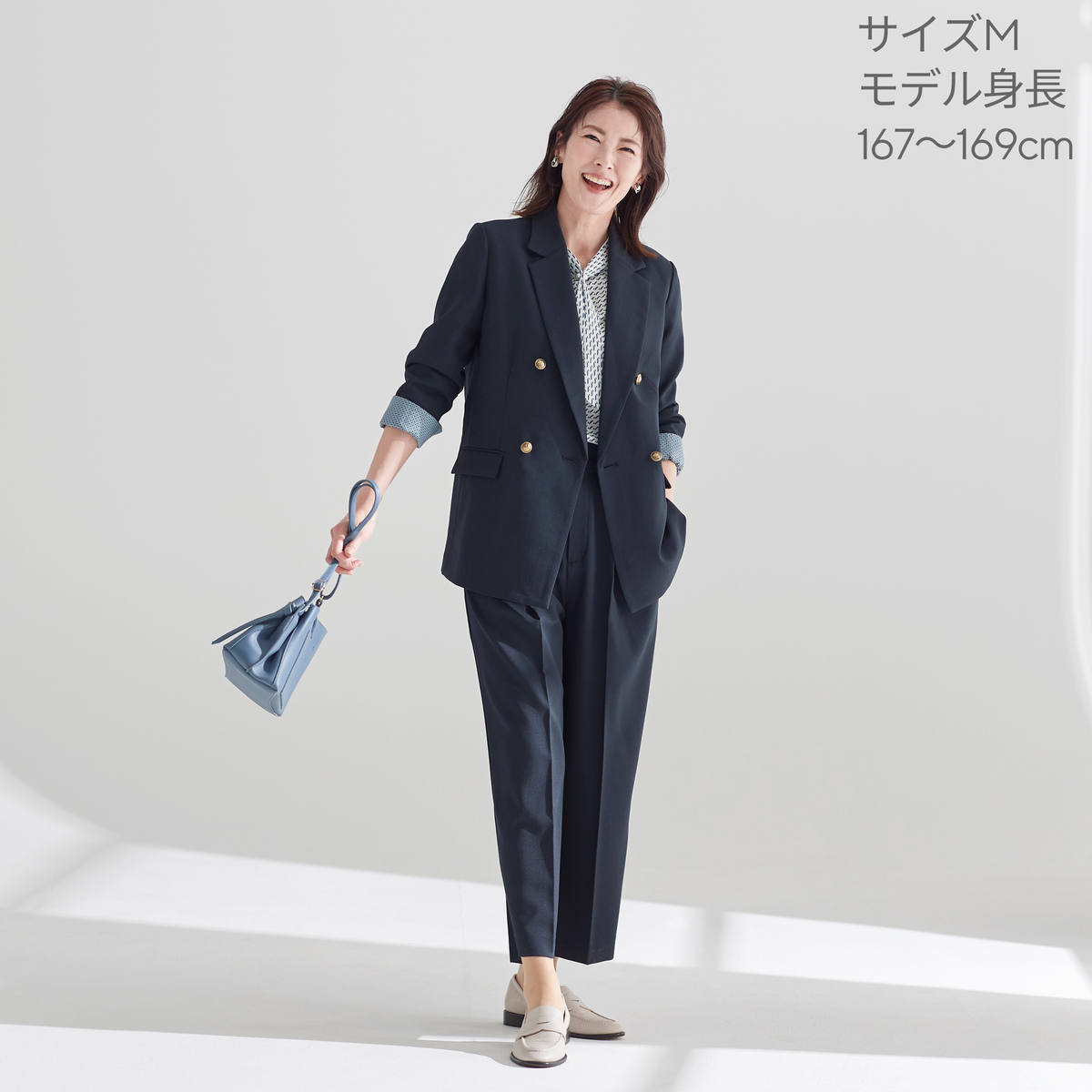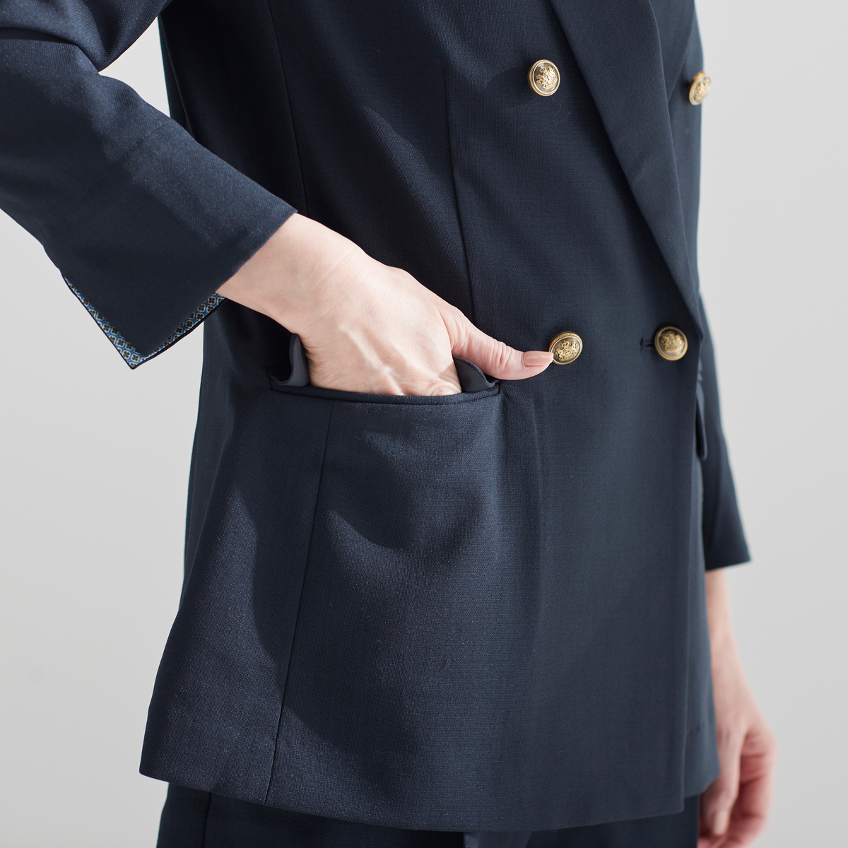 軽やかな素材を使用したダブルのジャケット。今風のシルエットに仕上げ、羽織るだけで旬の着こなしが楽しめます。袖口を折り返すとさりげなく柄が覗くデザインもポイントです