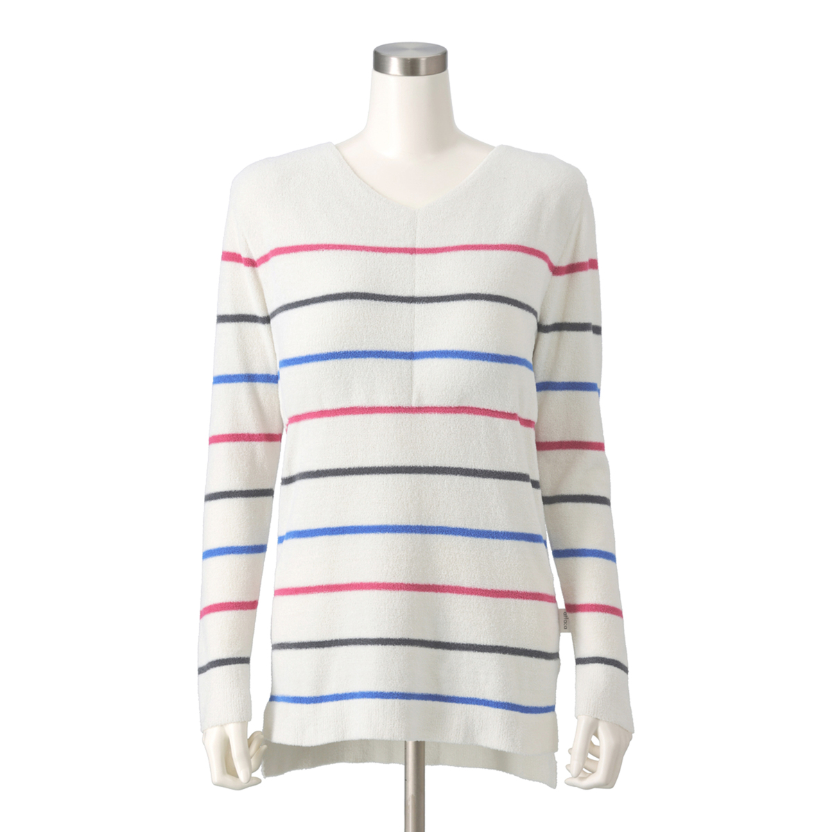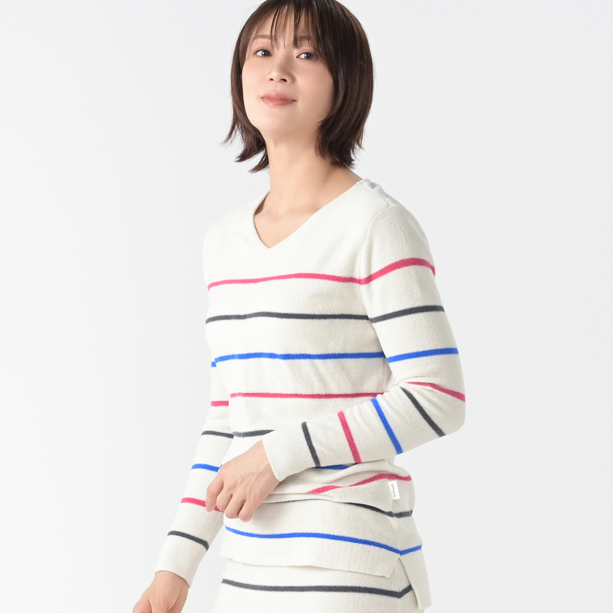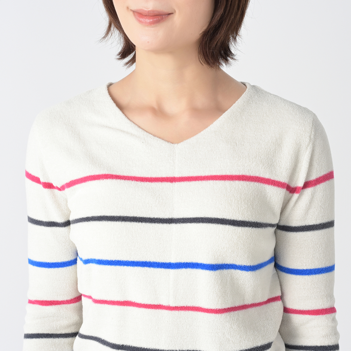 ふんわり暖かみのある素材のVネックプルオーバー。太すぎないボーダー柄でカジュアルすぎず、上品に着こなせます