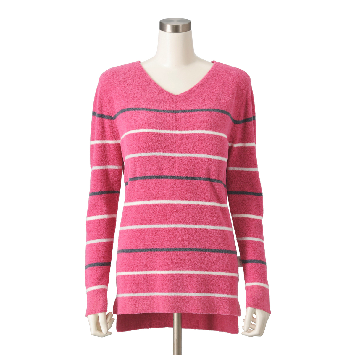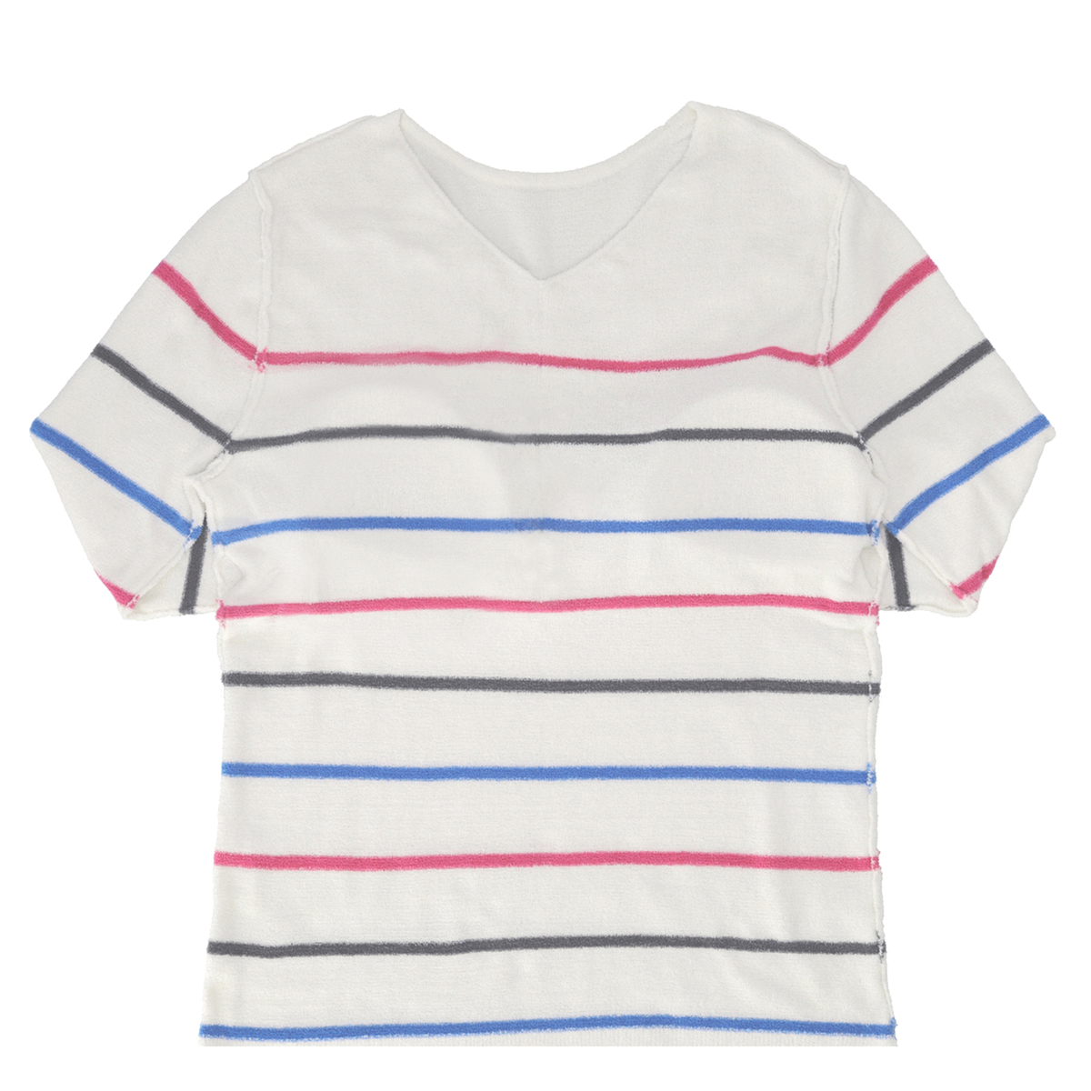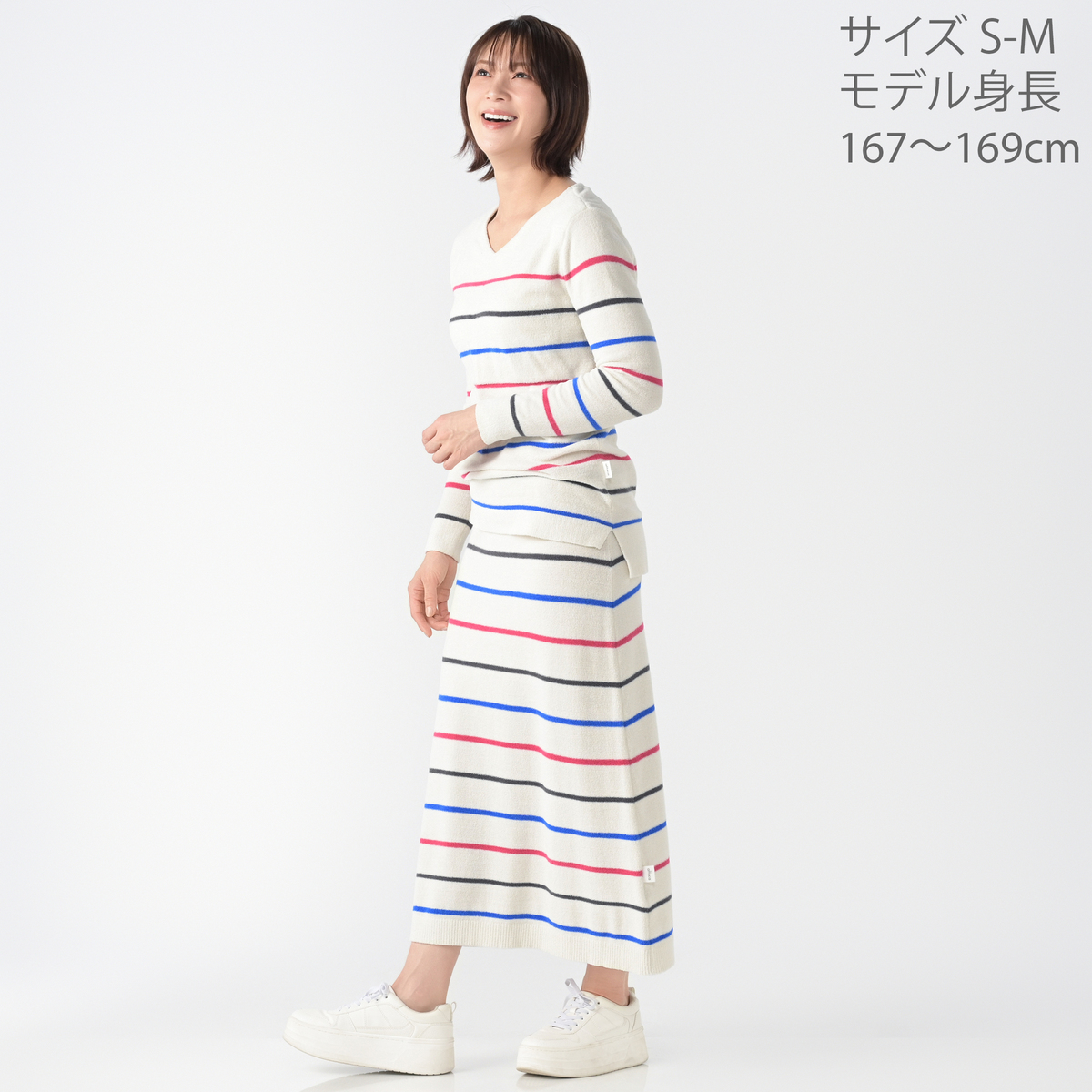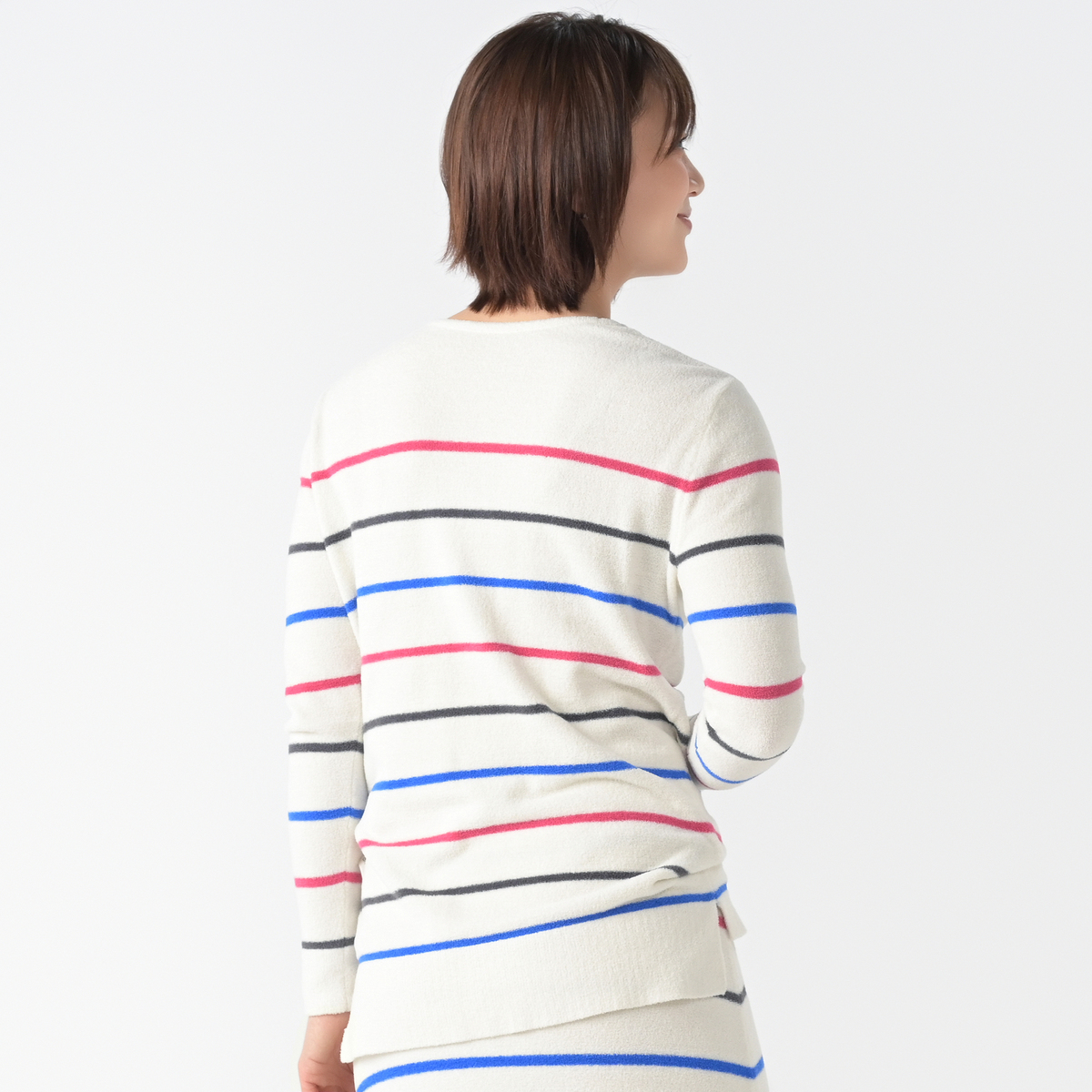 ふんわり暖かみのある素材のVネックプルオーバー。太すぎないボーダー柄でカジュアルすぎず、上品に着こなせます