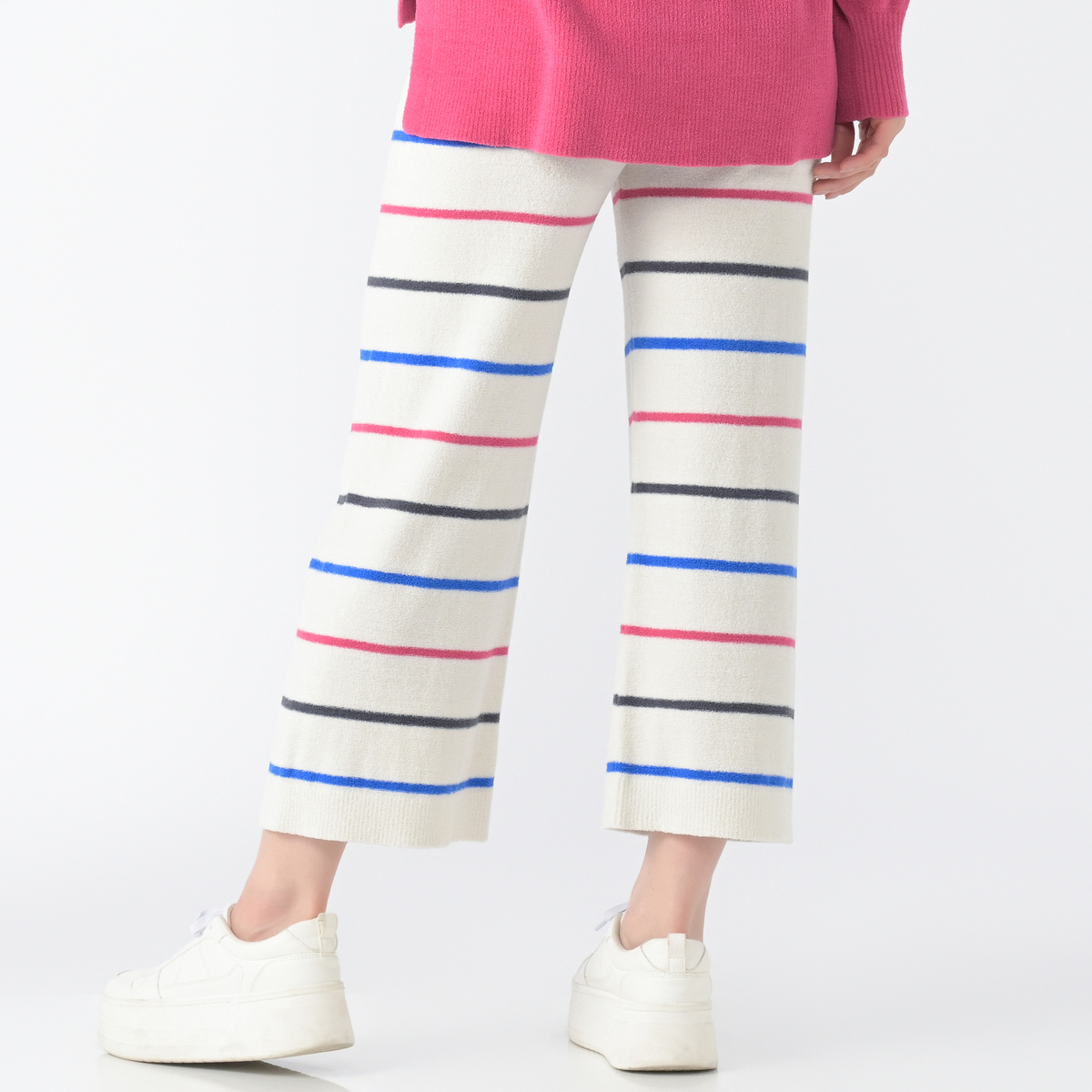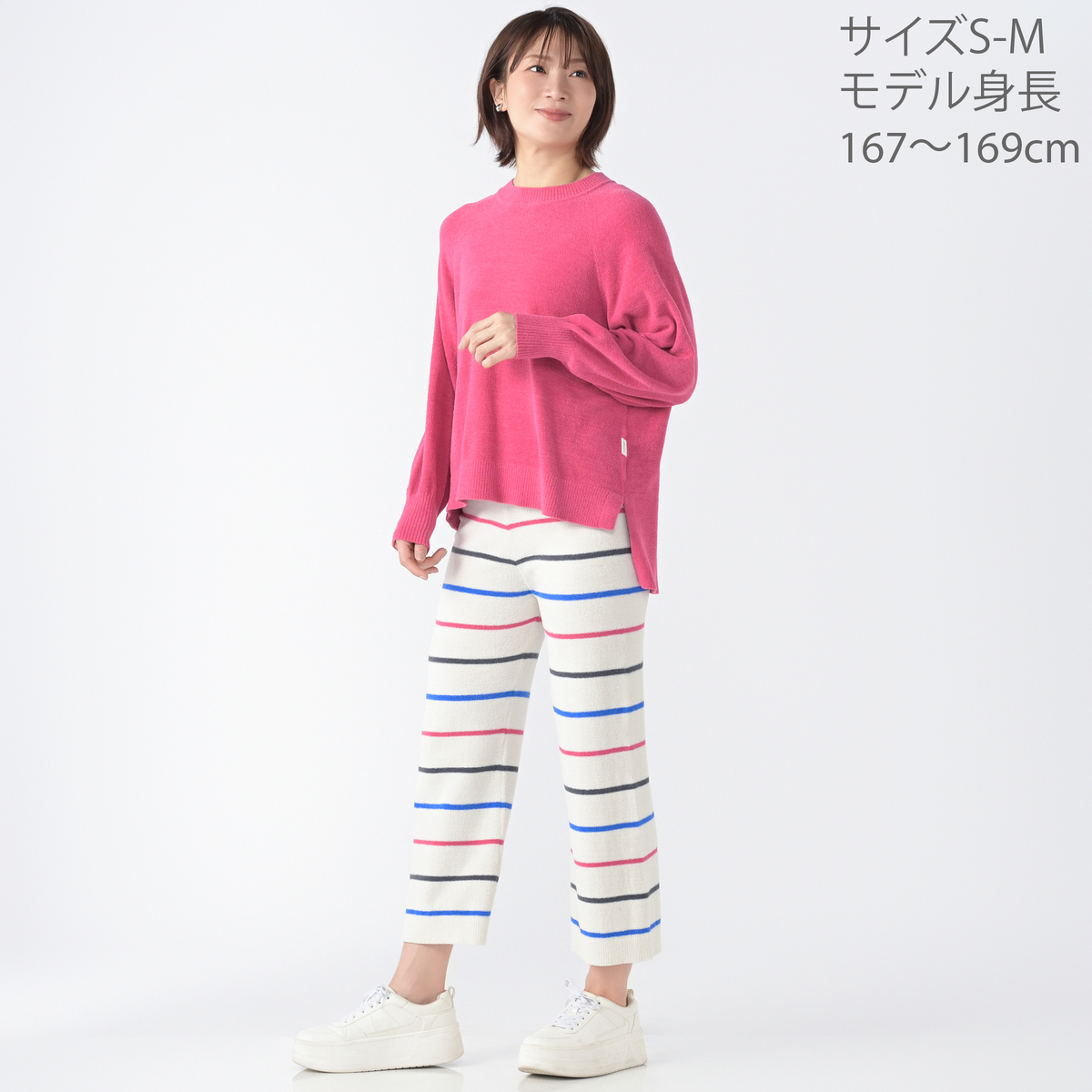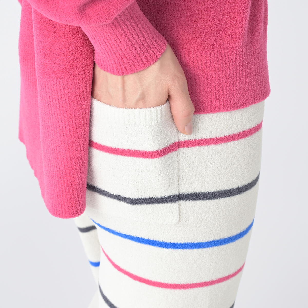 太すぎず落ち感のあるストンとした形で、腰から脚のラインを拾いにくく、自然に体型をカバーします。羽毛のような構造で柔らかいモールヤーンニットを使用し、空気を含みやすくふわふわとあたたかみがあり、締め付けを感じにくい着心地です