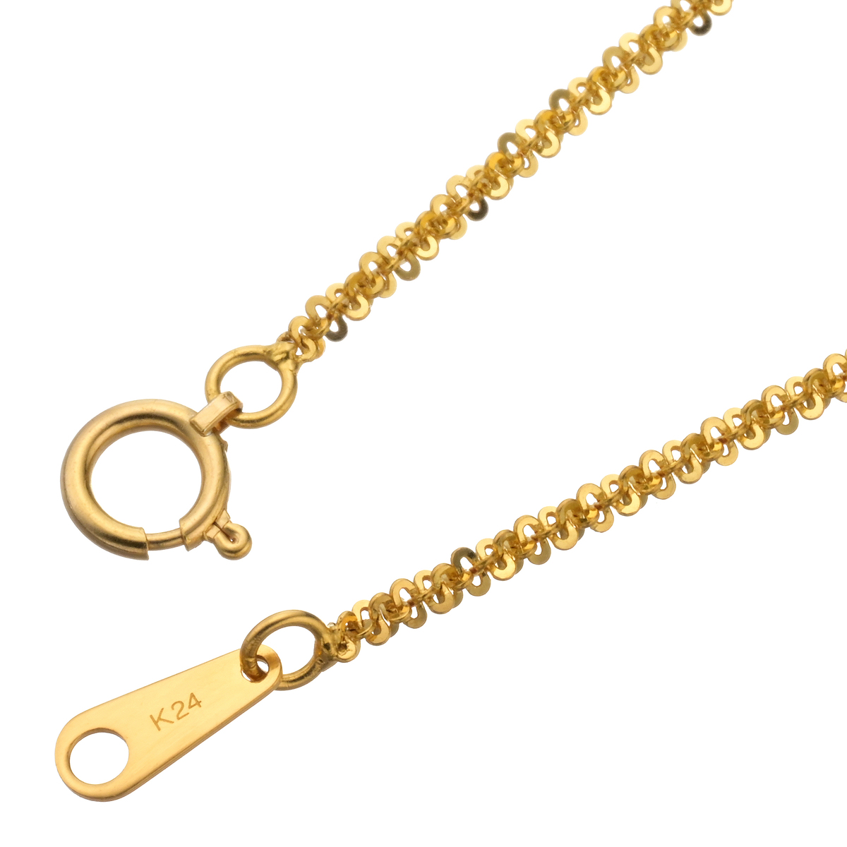 [地金] 24Kゴールド 総重量(約) 42cm:4.7g 60cm:6.6g 長さ(約) 42cm:42.0cm 60cm:60.0cm 幅(約) 1.8mm チェーンの形状 デザイン 留具の形状 引き輪 アジャスターの有無 無 留め具の受け側 最大幅×高さ 3.5×3.3mm ■受注発注商品のためデザイン・価値に影響のない範囲で仕様が変わる場合がございます ■素材の大きさ・形・色合い、製品のサイズは1点1点多少異なります 【本体・プレート:中国製、引き輪:日本製】