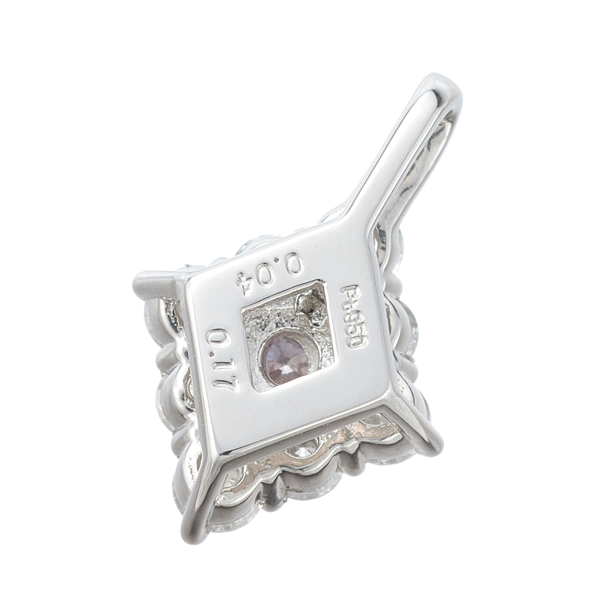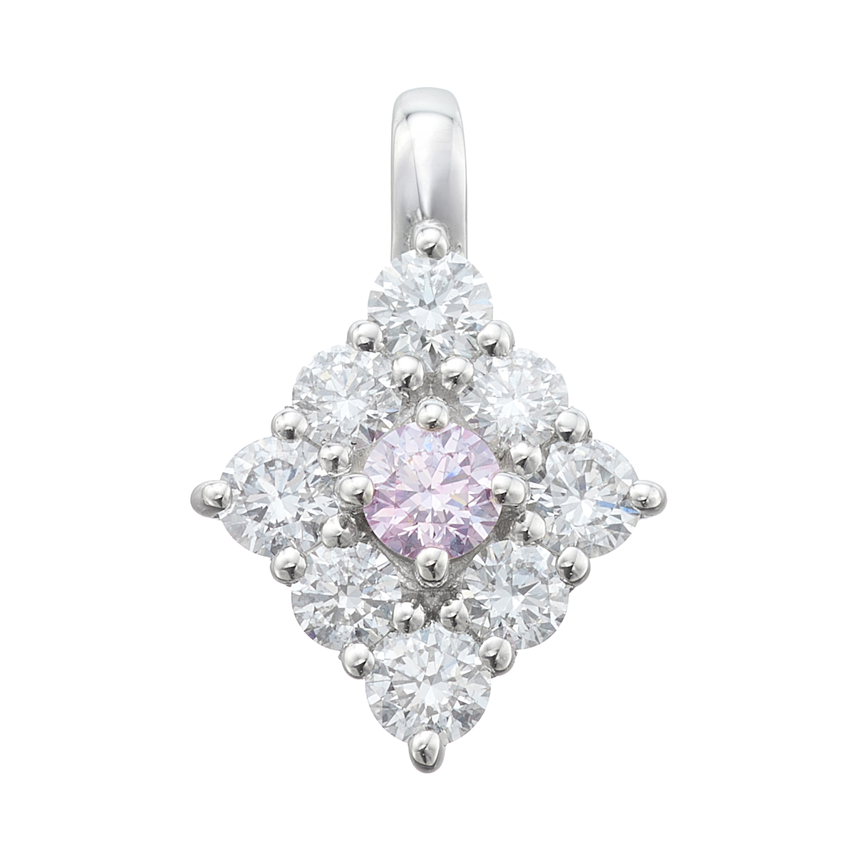 センターのピンクダイヤモンドを引き立てるようにDカラーダイヤモンドをびっしりあしらった菱形のペンダントヘッド。2色のコントラストが楽しめる華やかなデザインです