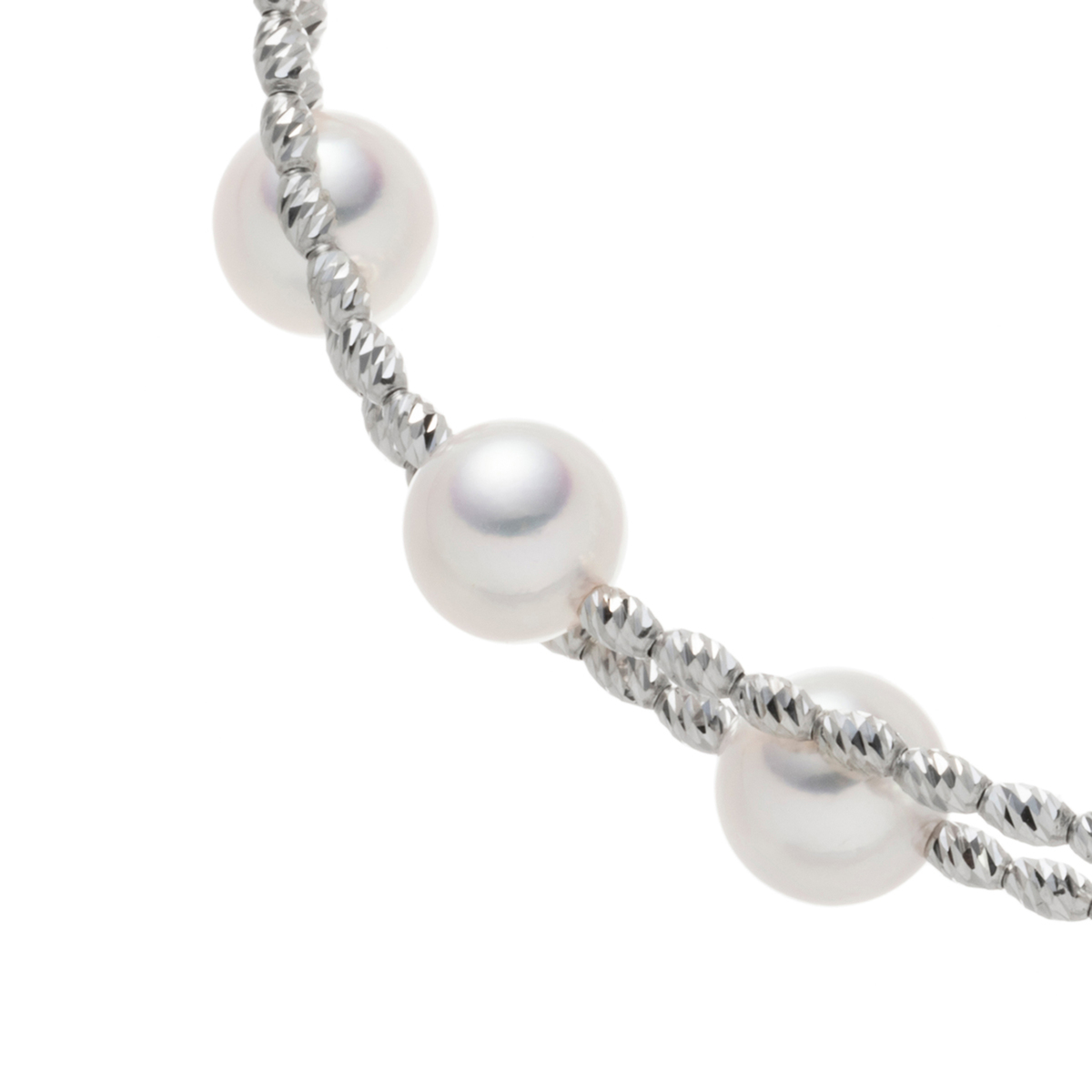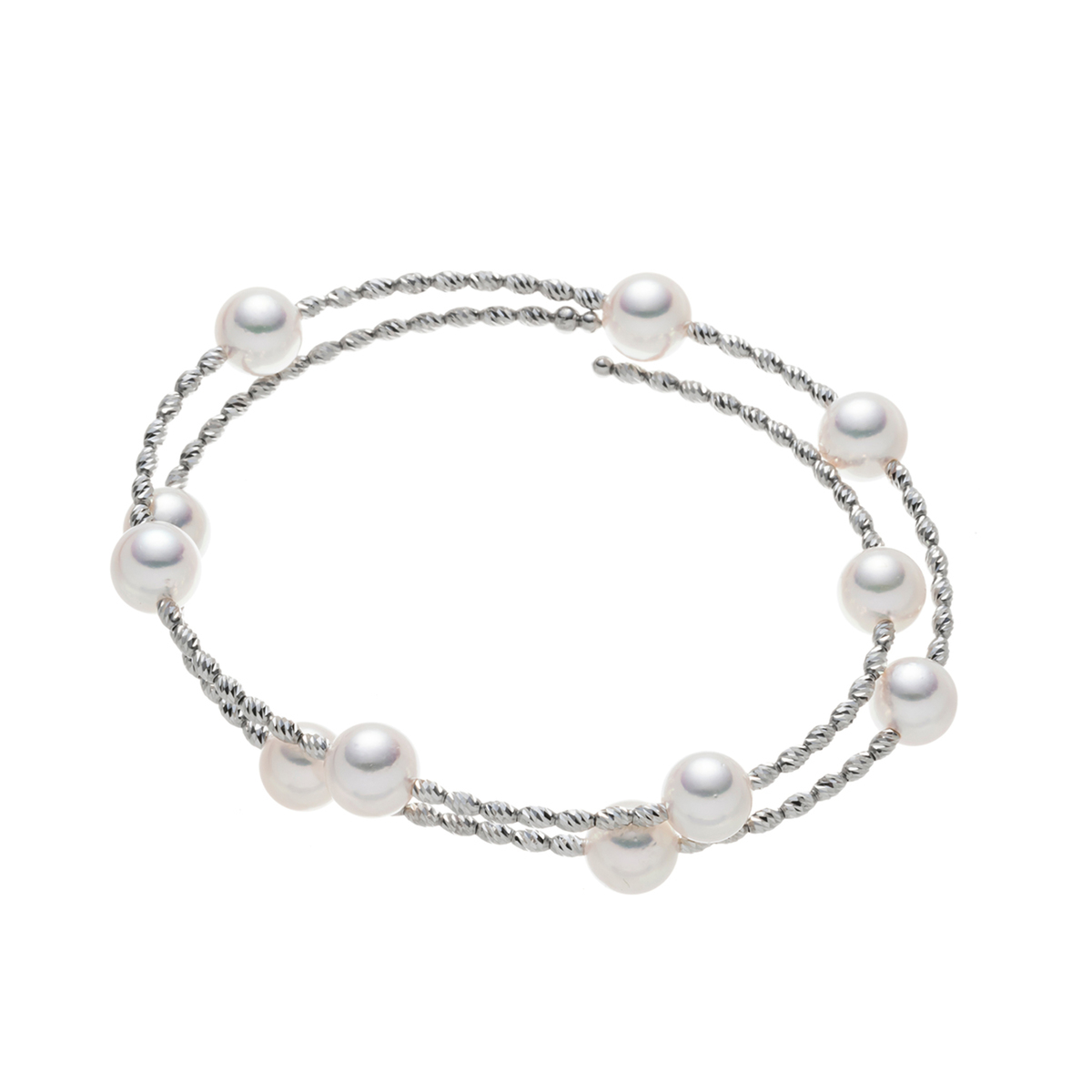 アコヤ真珠の花珠の中でも、真珠科学研究所が特に高品質と認めた"天女"のバングル。7.0mmUP珠を11珠使い、煌びやかなパーツと組合せて華やかな雰囲気にお仕立てしました