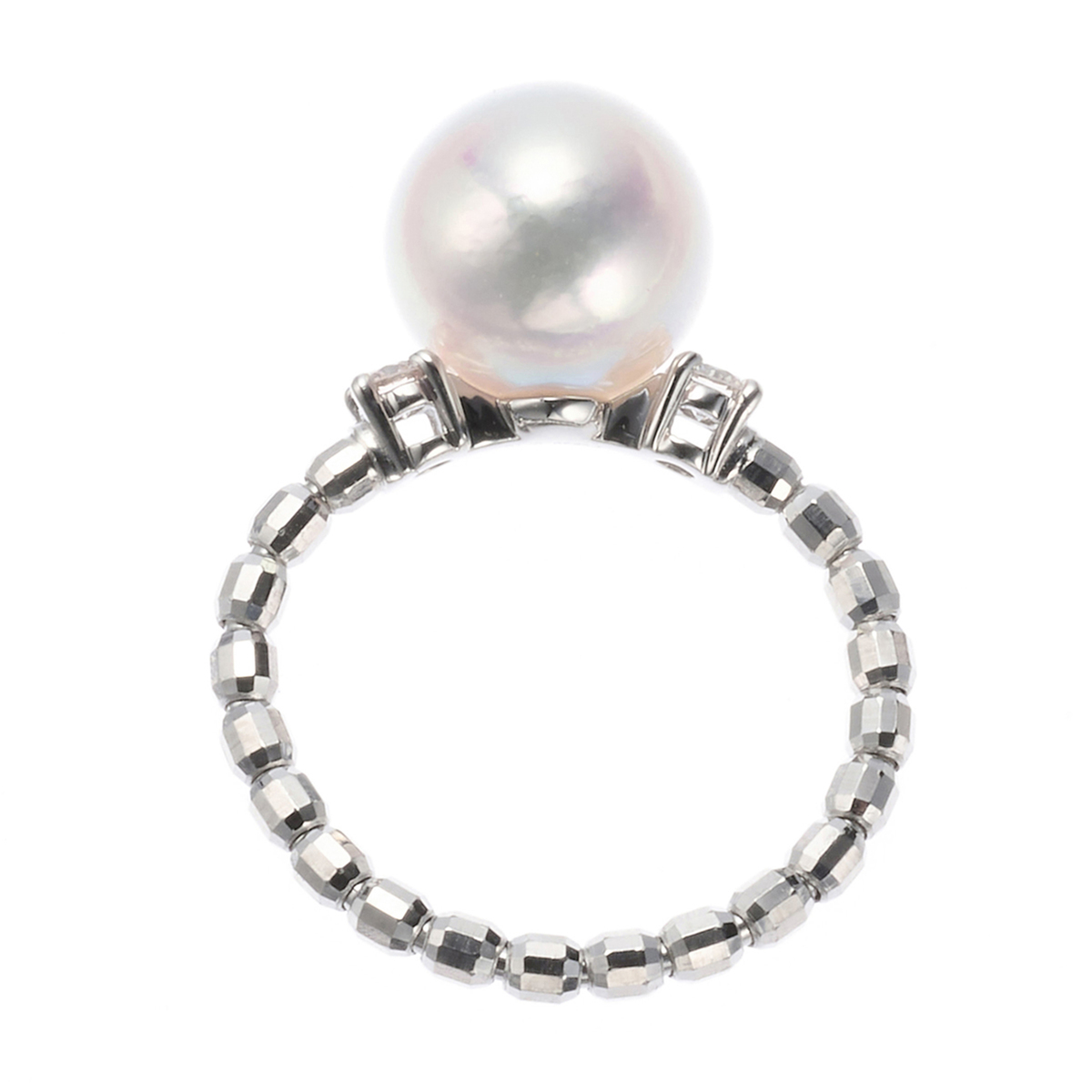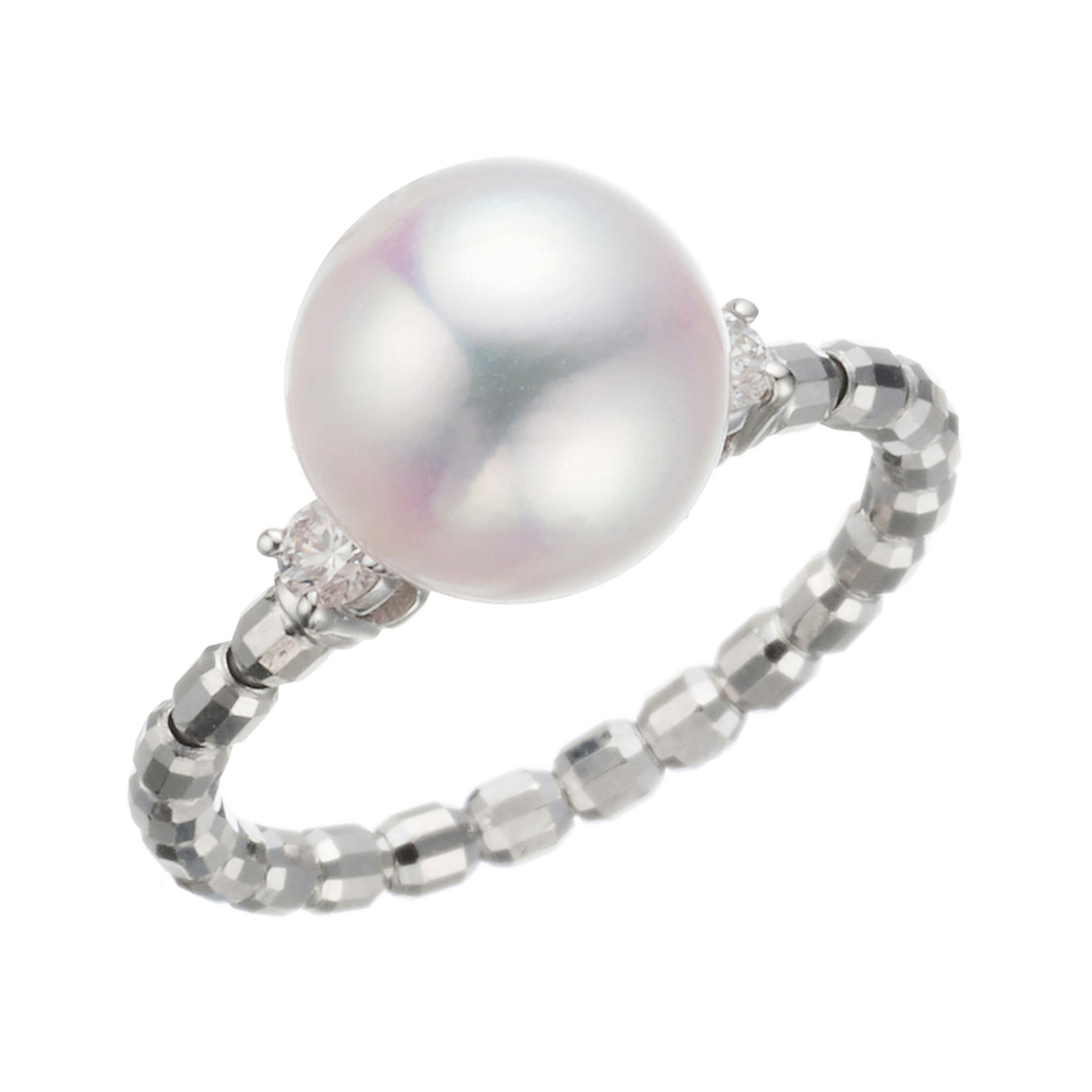 アコヤ真珠の花珠の中でも、真珠科学研究所が特に高品質と認めた「天女」を使用したリングです。テリの美しい9.0mmUP珠の両脇にダイヤモンドを配し、大人にふさわしいジュエリーに仕立てました
