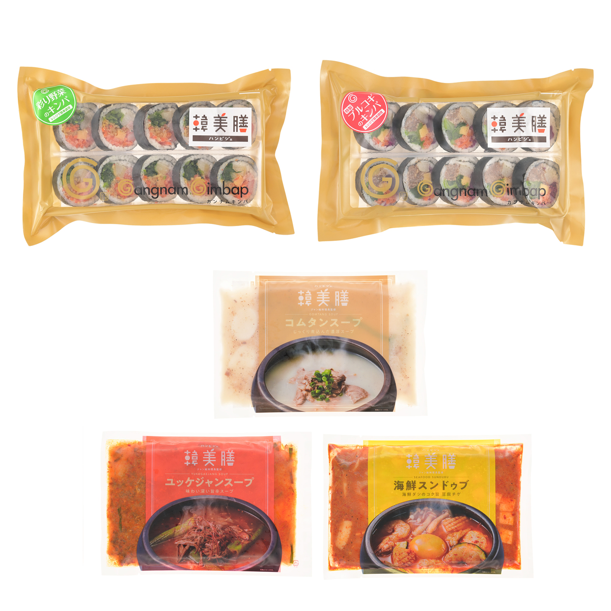 韓美膳のキンパ2種と、3種のスープを詰め合わせたセット。韓美膳ジャン総料理長監修の商品です。電子レンジで温めるだけで、手軽に美味しくお召し上がりいただけます