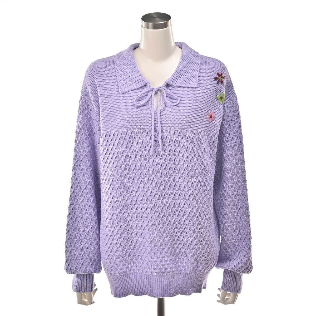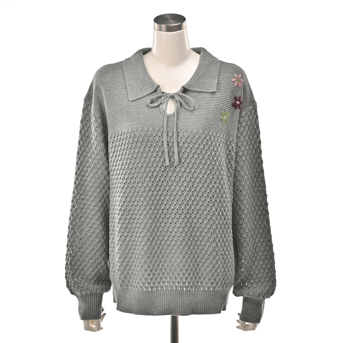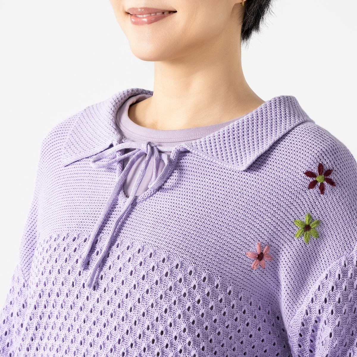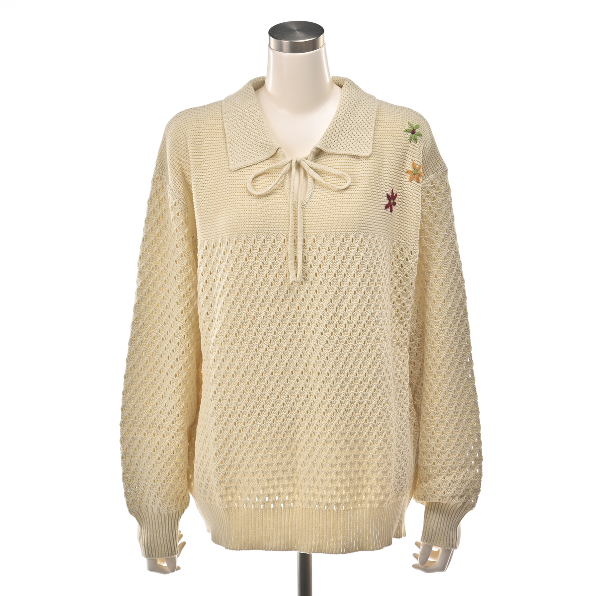 ふんわりとした風合いが心地よいセーター。スキッパー衿の抜け感が軽さを添え、透かし編みに花刺繍を合わせた編み地が程よいアクセントに。ゆったりとした着心地で、手持ちのボトムスとも組合せやすく、日常の装いに優しく馴染む一枚です