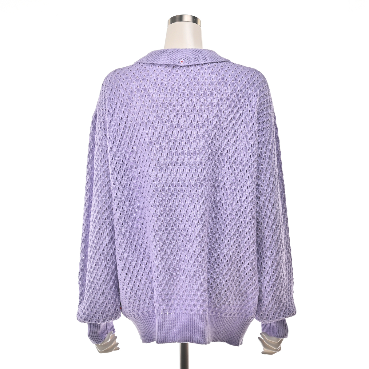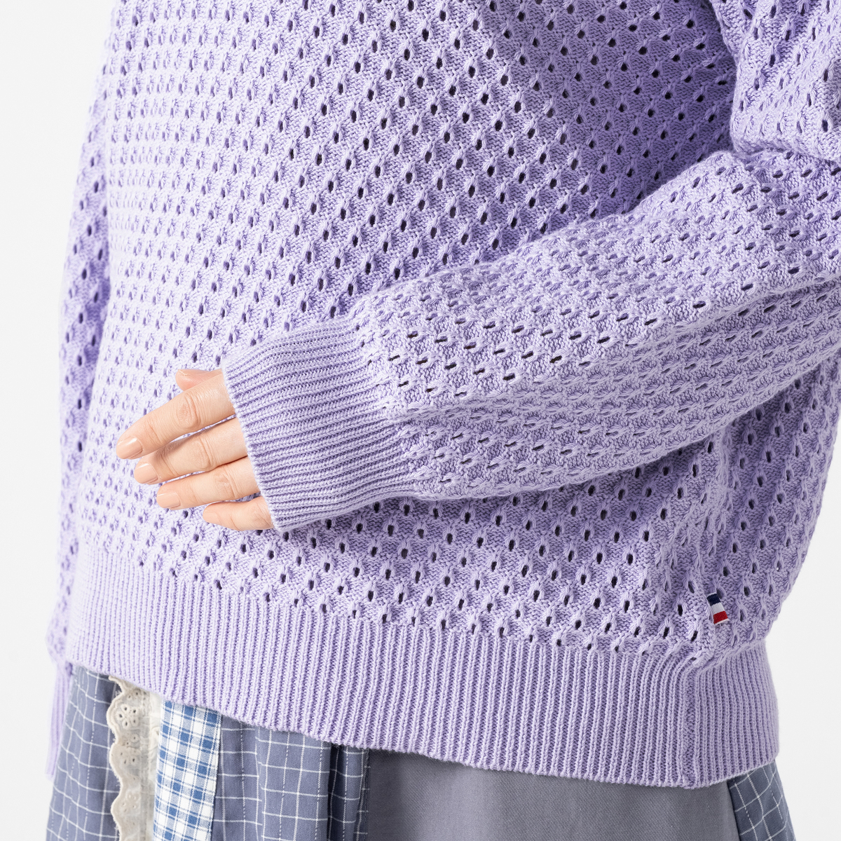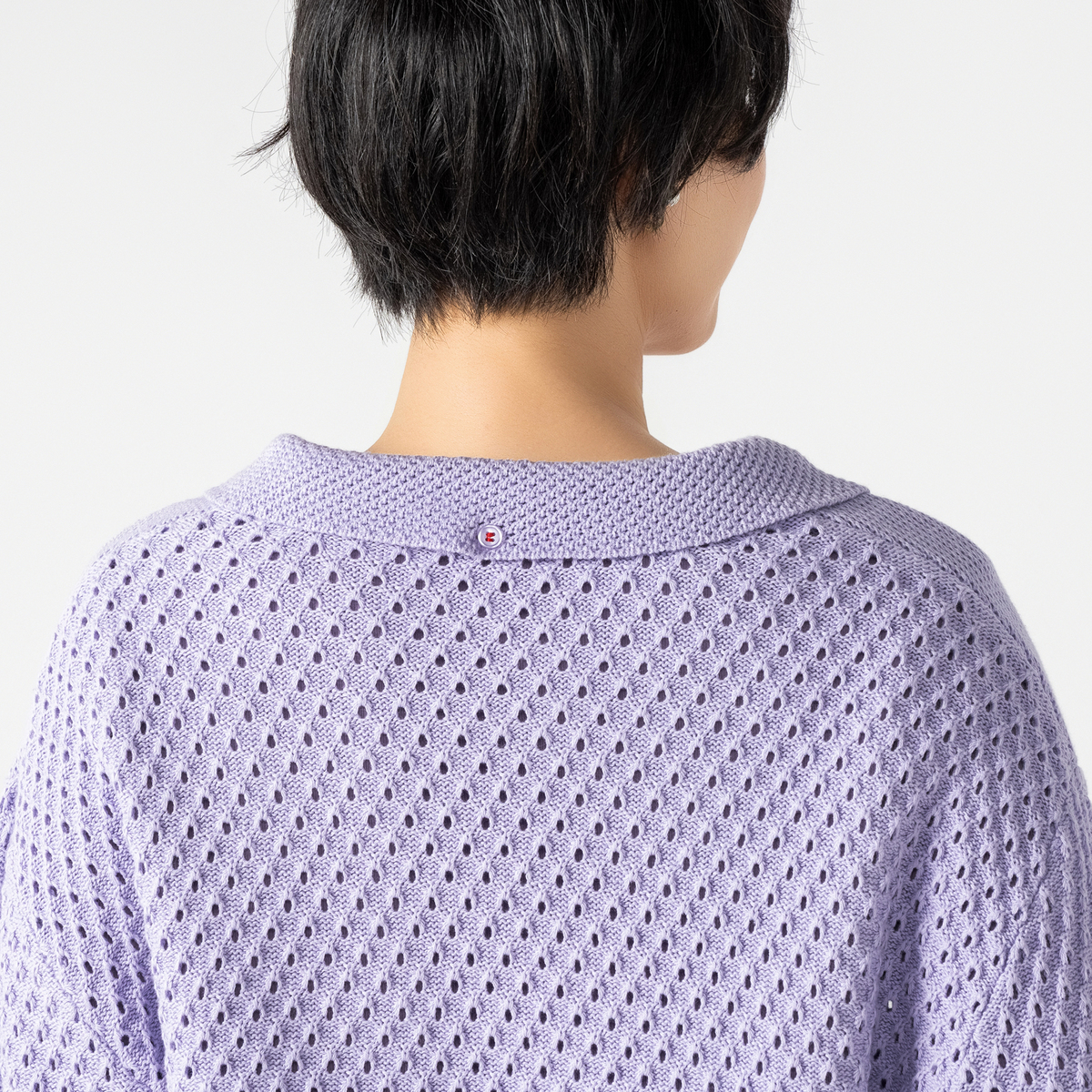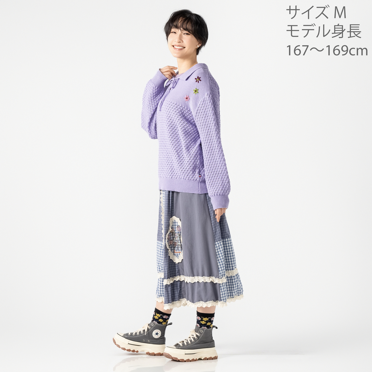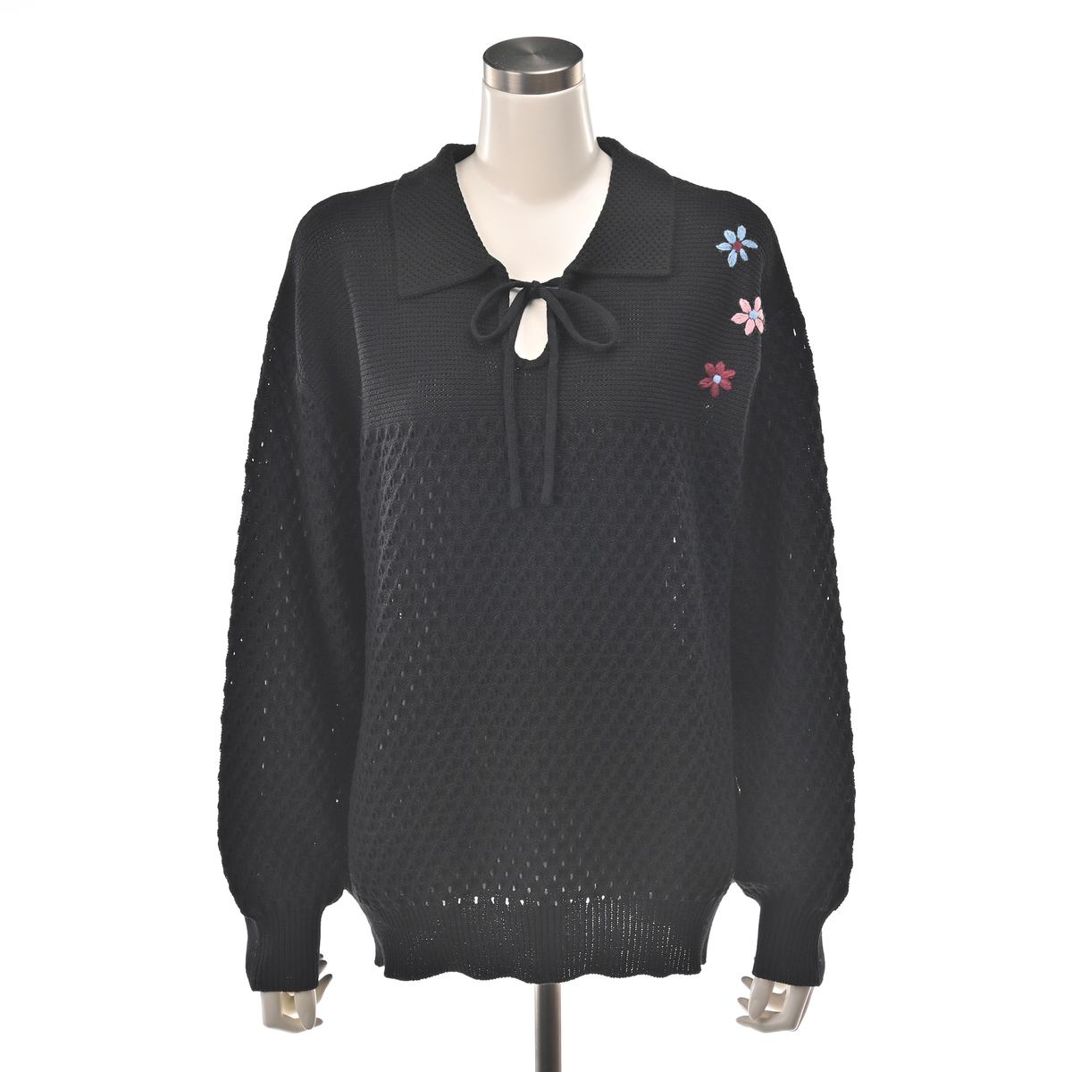 ふんわりとした風合いが心地よいセーター。スキッパー衿の抜け感が軽さを添え、透かし編みに花刺繍を合わせた編み地が程よいアクセントに。ゆったりとした着心地で、手持ちのボトムスとも組合せやすく、日常の装いに優しく馴染む一枚です