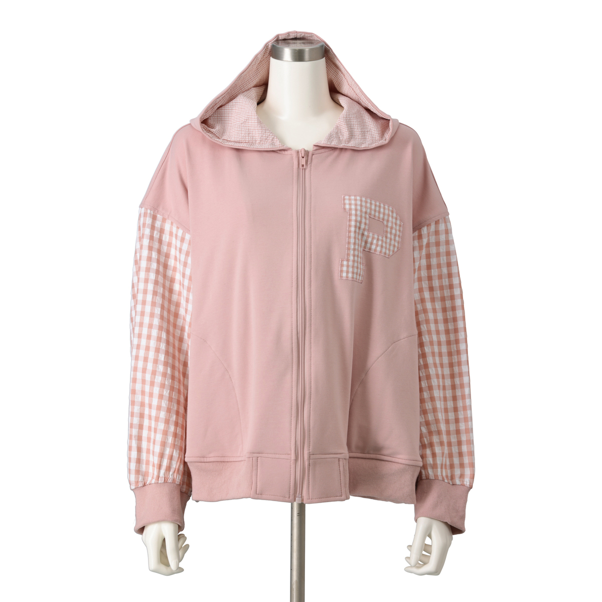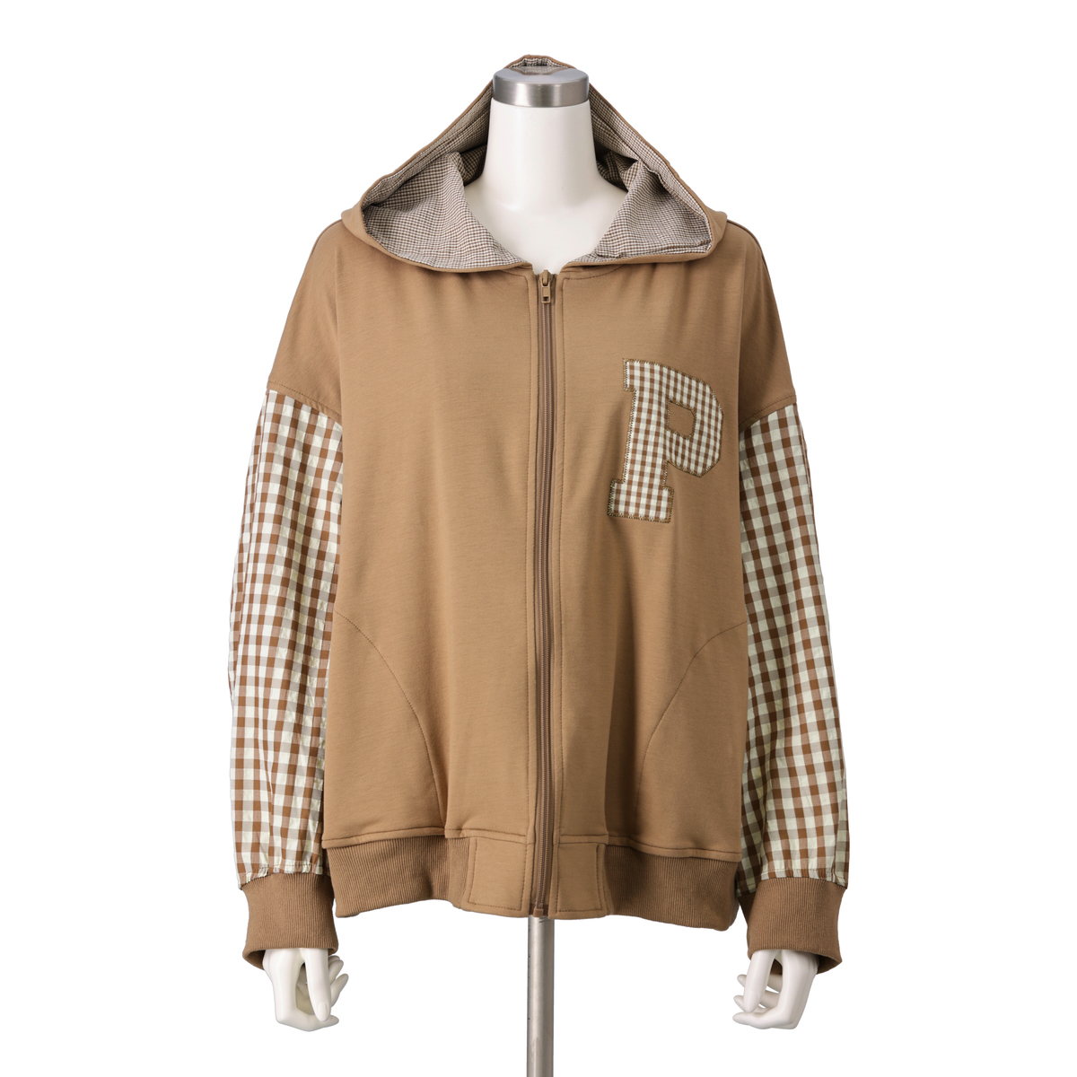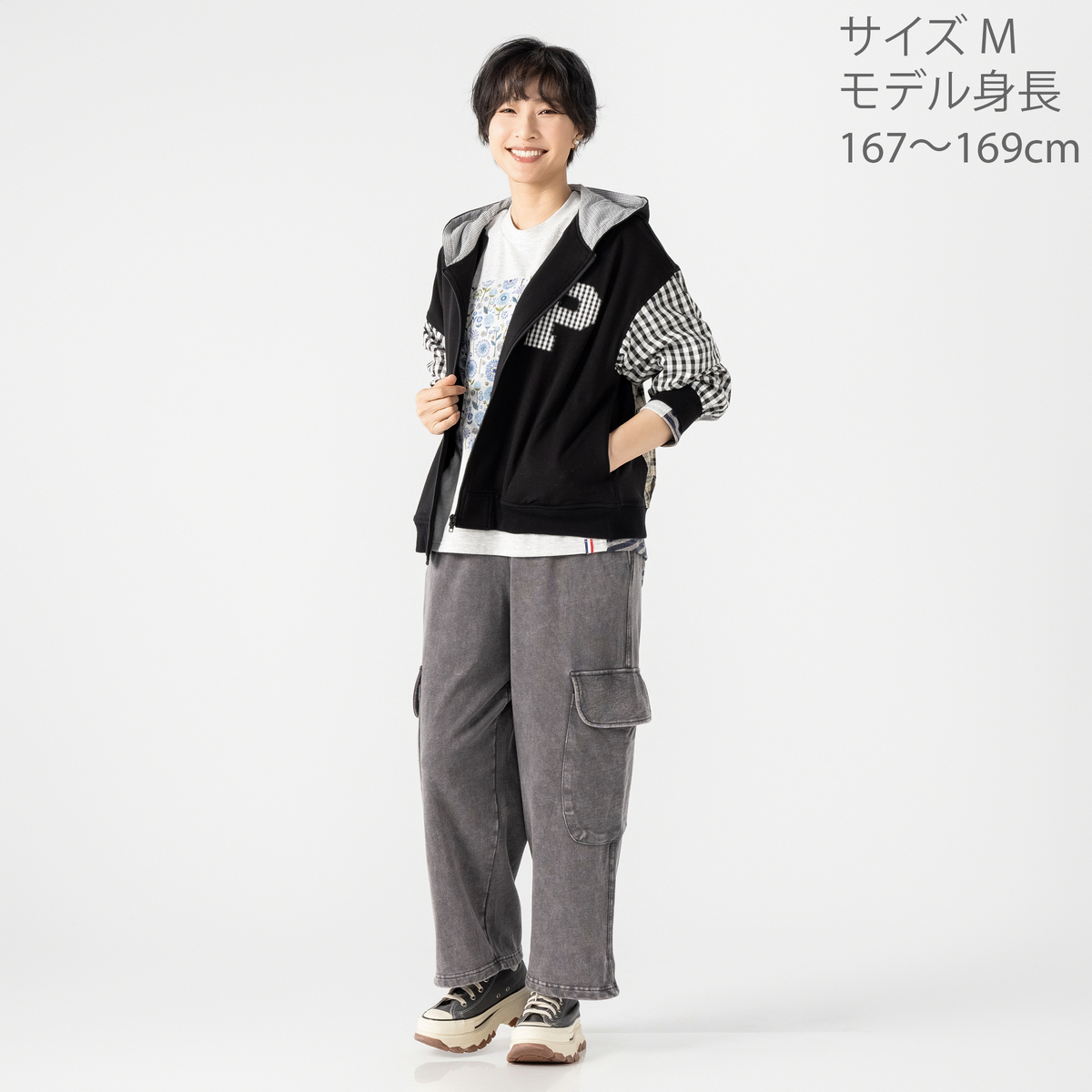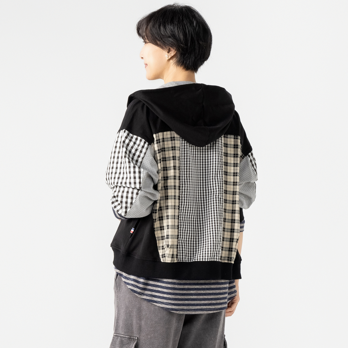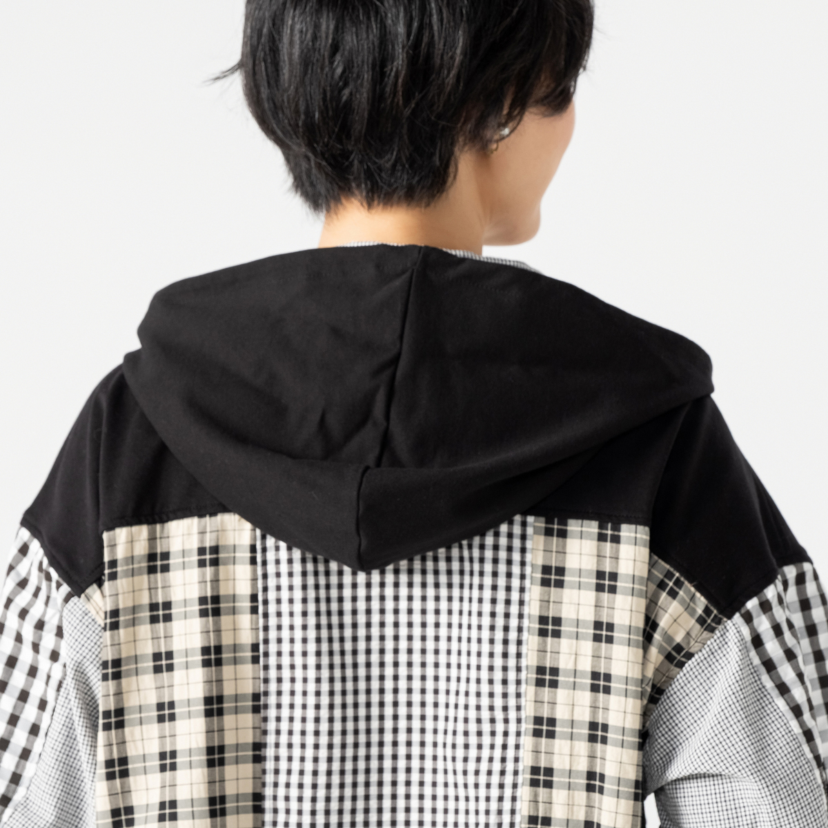 異素材の組合せが目を引くブルゾン。裏毛素材に大小さまざまなチェック生地を合わせ、軽やかな着心地に仕上げています。同色系でまとめているため着こなしやすく、羽織るだけでコーデにほどよい華やかさをプラス。薄手で扱いやすく、季節の変わりめにも活躍します