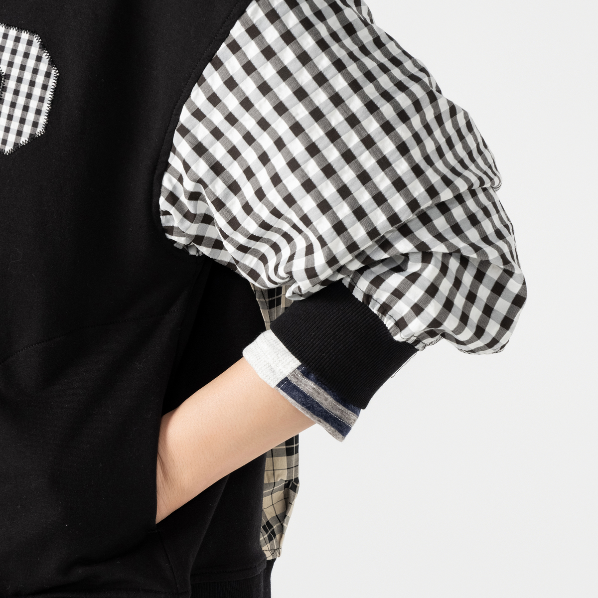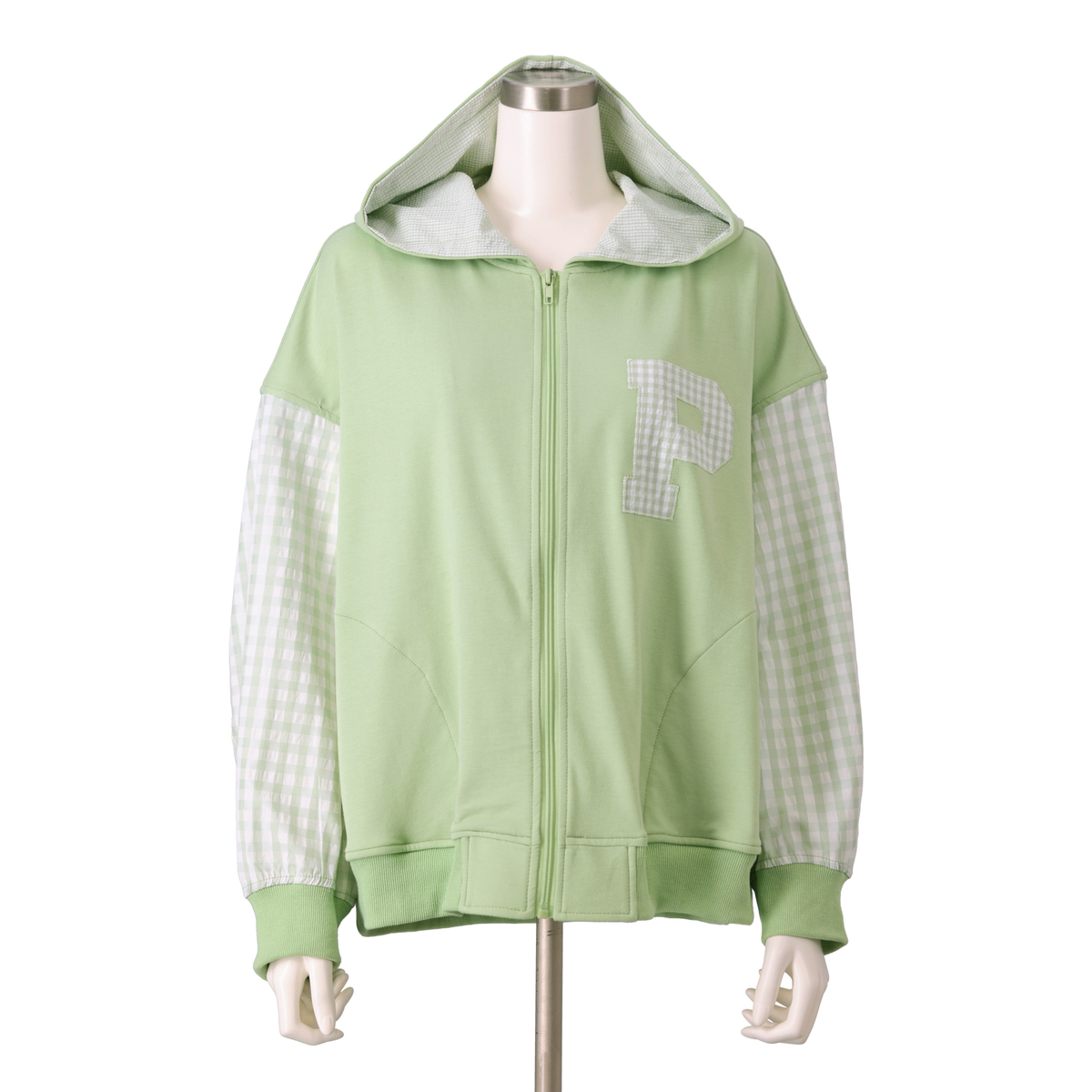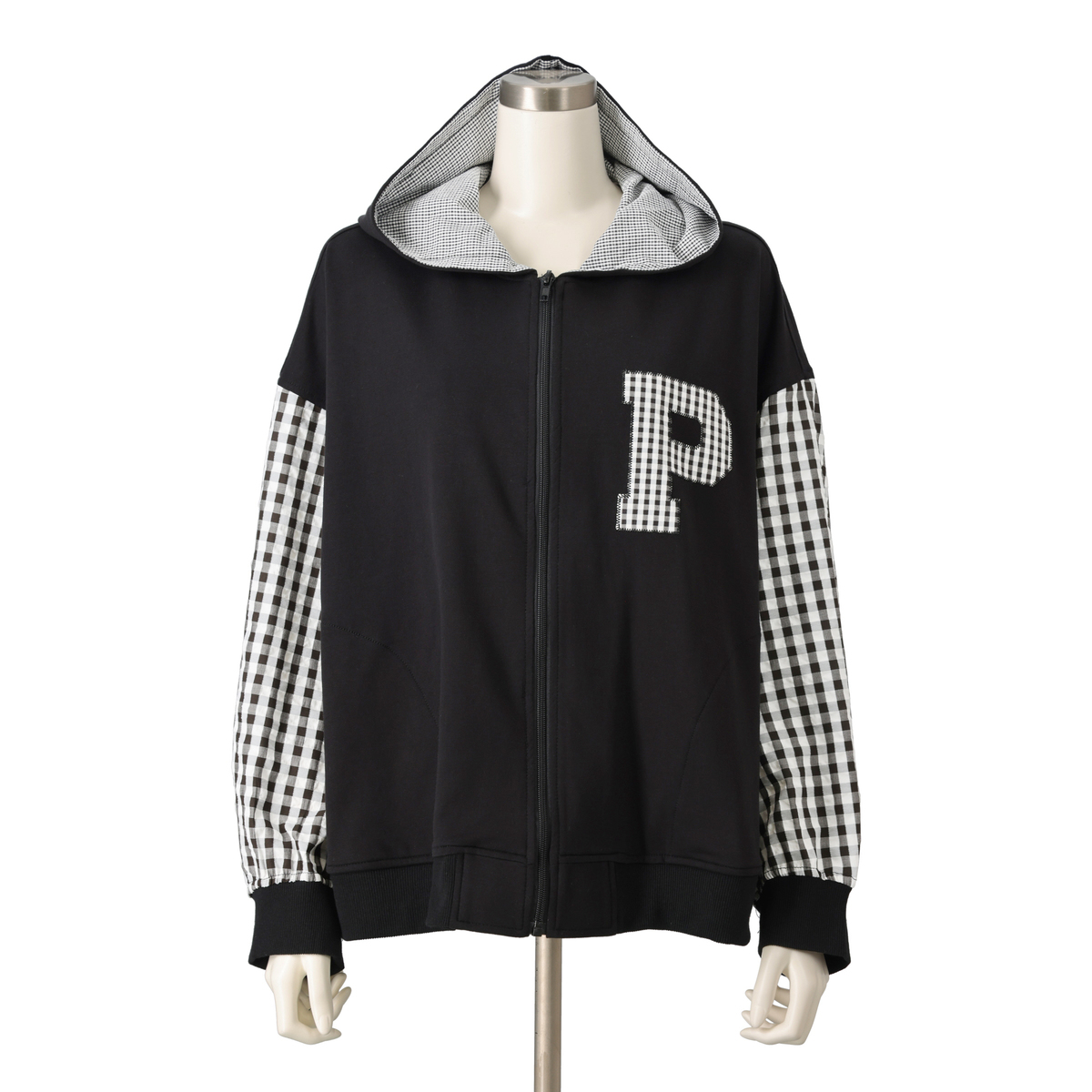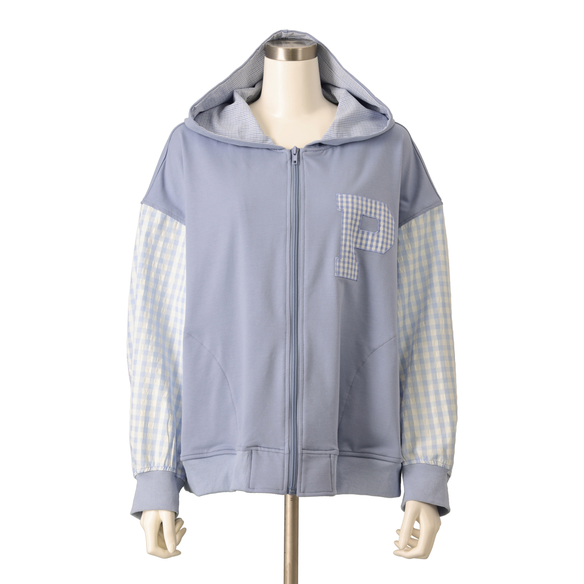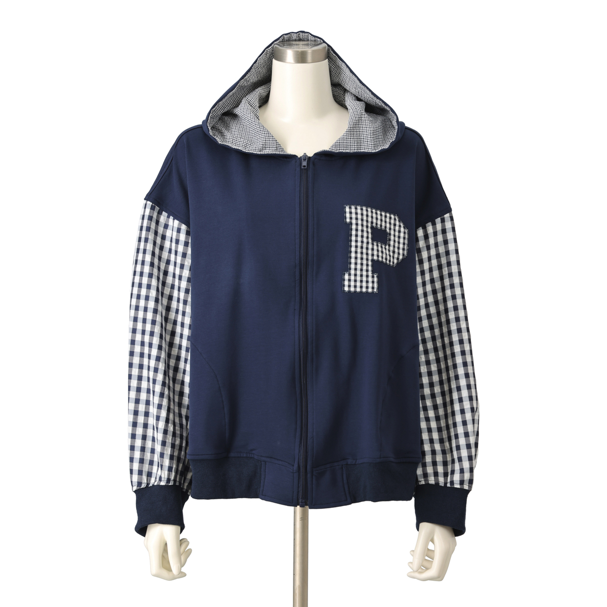 異素材の組合せが目を引くブルゾン。裏毛素材に大小さまざまなチェック生地を合わせ、軽やかな着心地に仕上げています。同色系でまとめているため着こなしやすく、羽織るだけでコーデにほどよい華やかさをプラス。薄手で扱いやすく、季節の変わりめにも活躍します