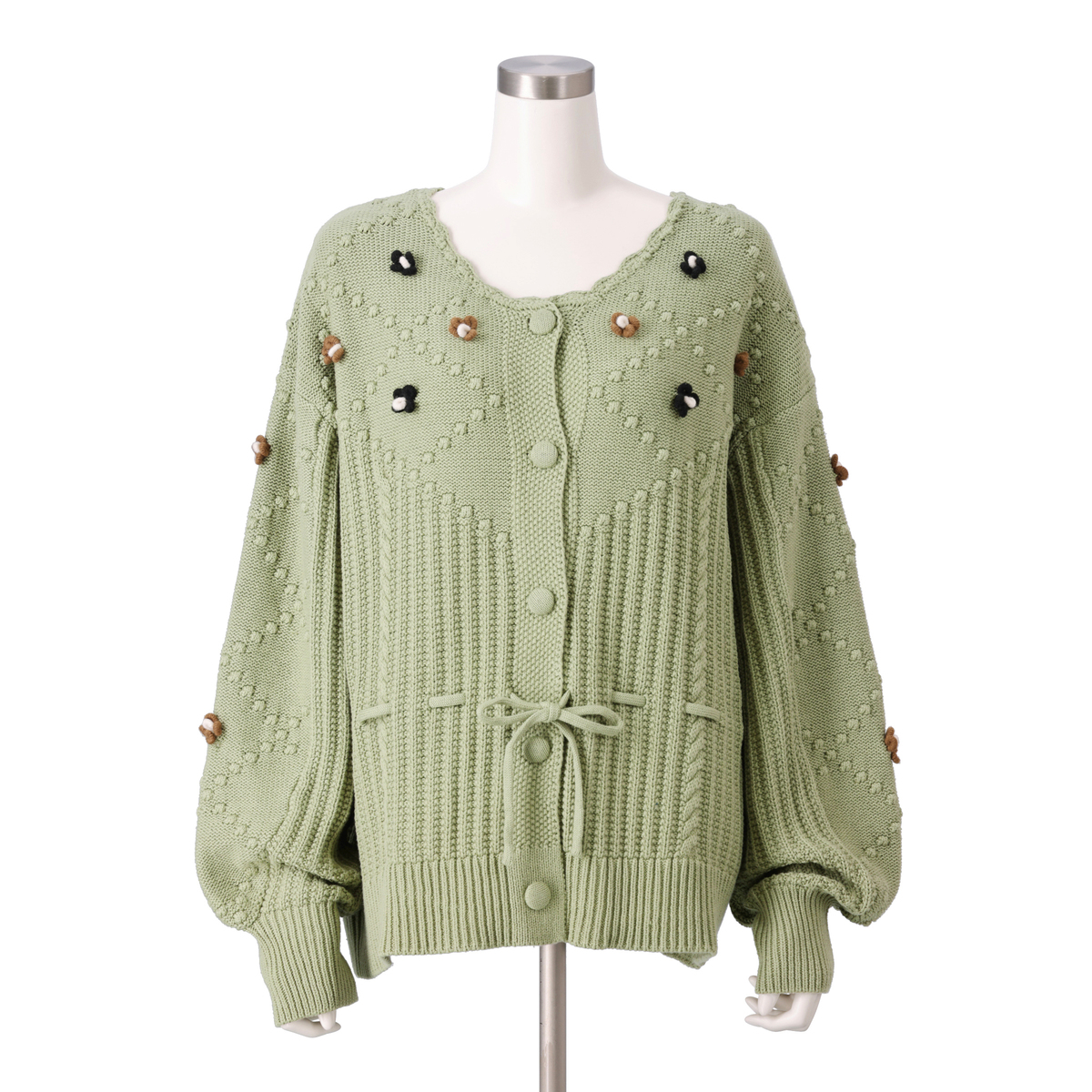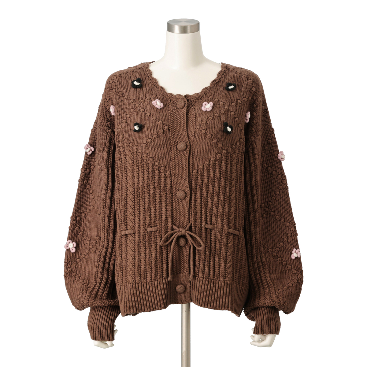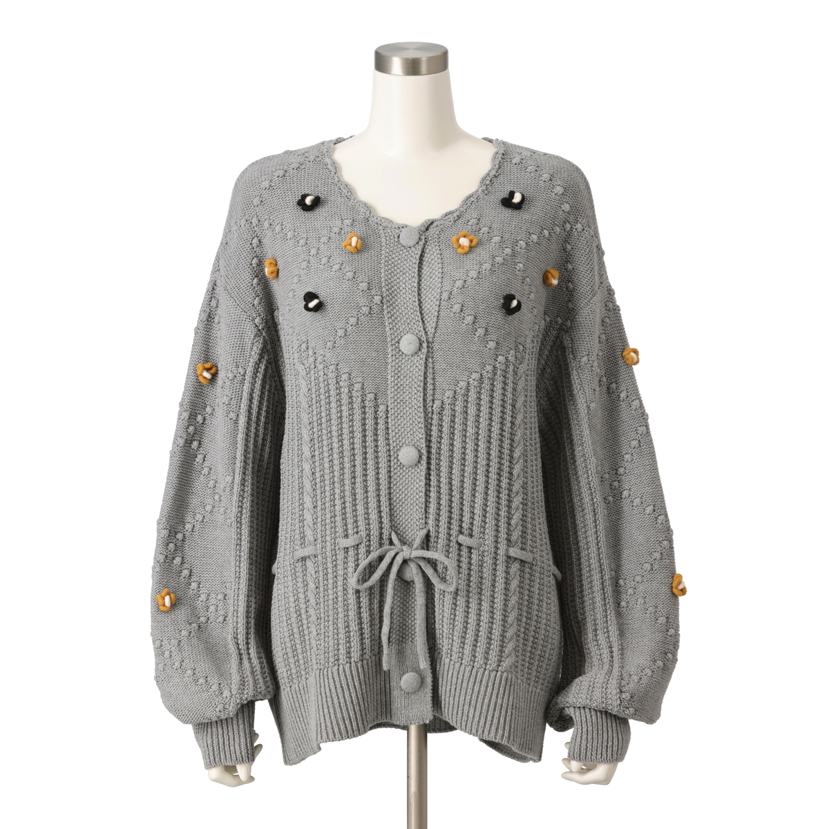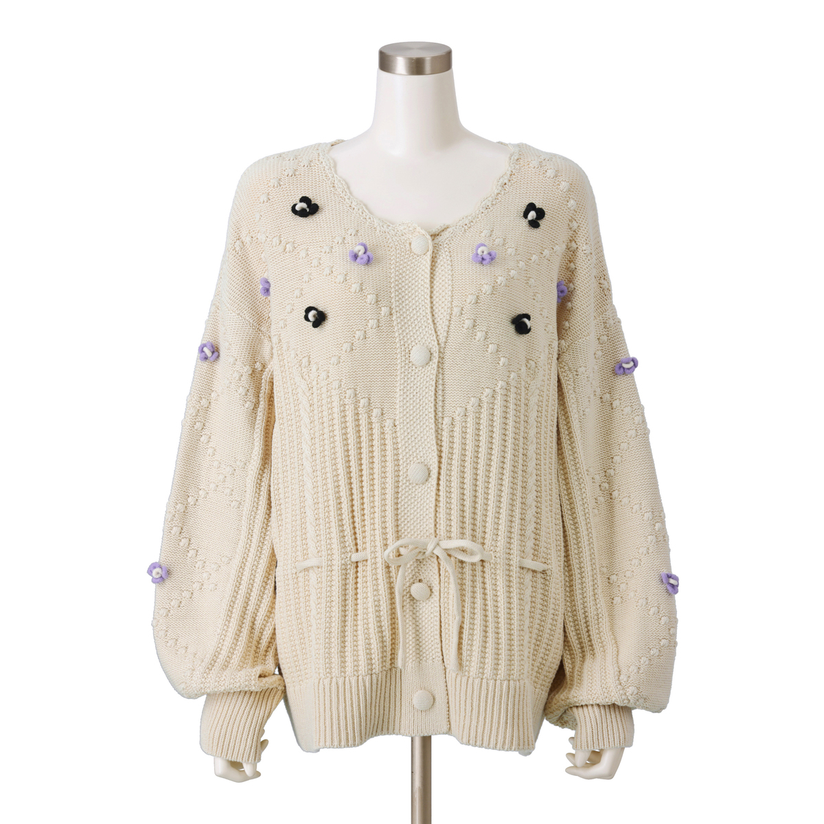 家庭機編みのような風合いを意識したヴィンテージ感のあるカーディガン。シェル編みやケーブル編みを織り交ぜた、立体感のある編地が特徴です