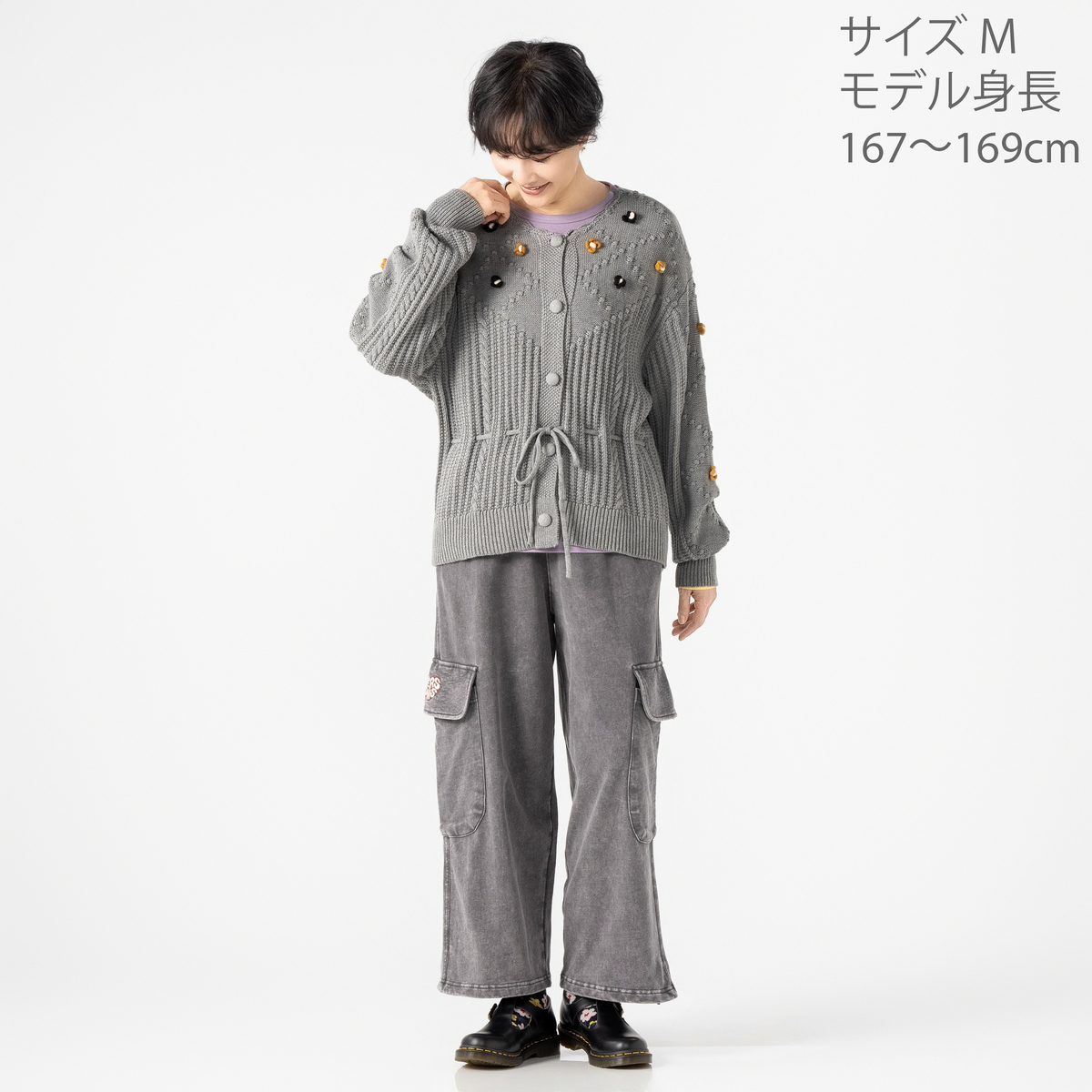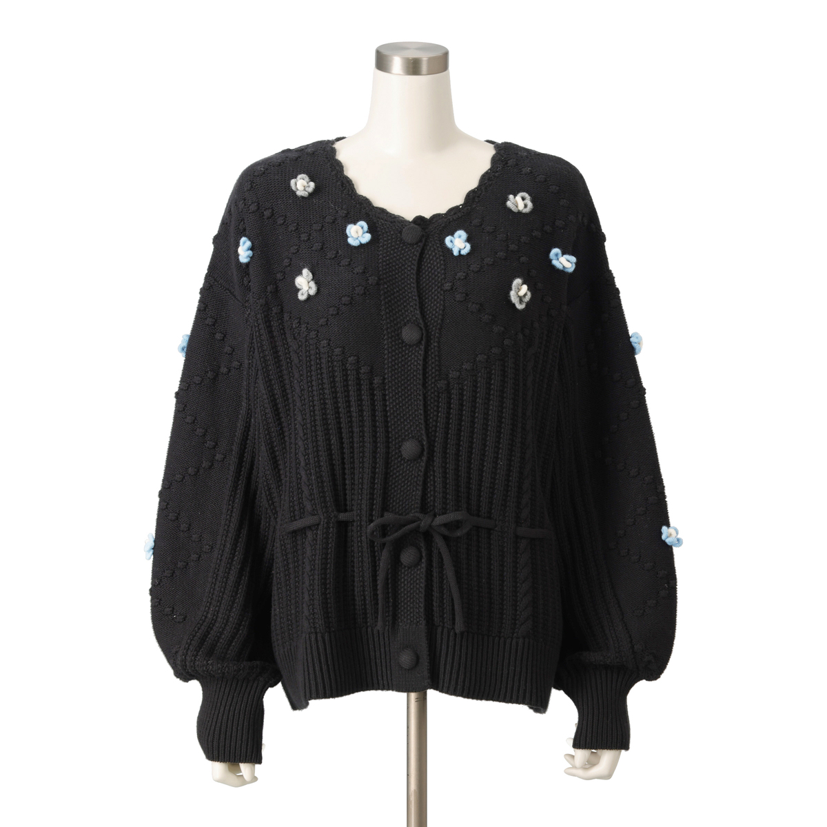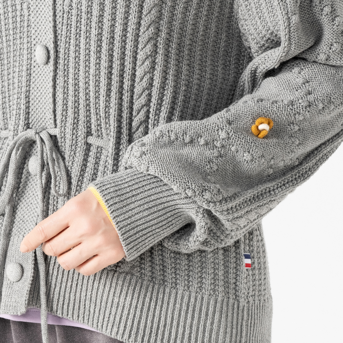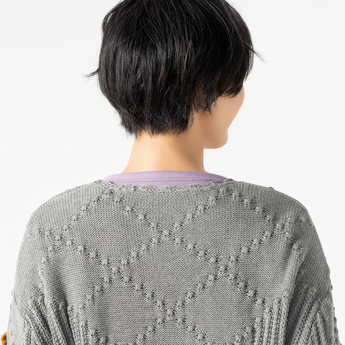 家庭機編みのような風合いを意識したヴィンテージ感のあるカーディガン。シェル編みやケーブル編みを織り交ぜた、立体感のある編地が特徴です