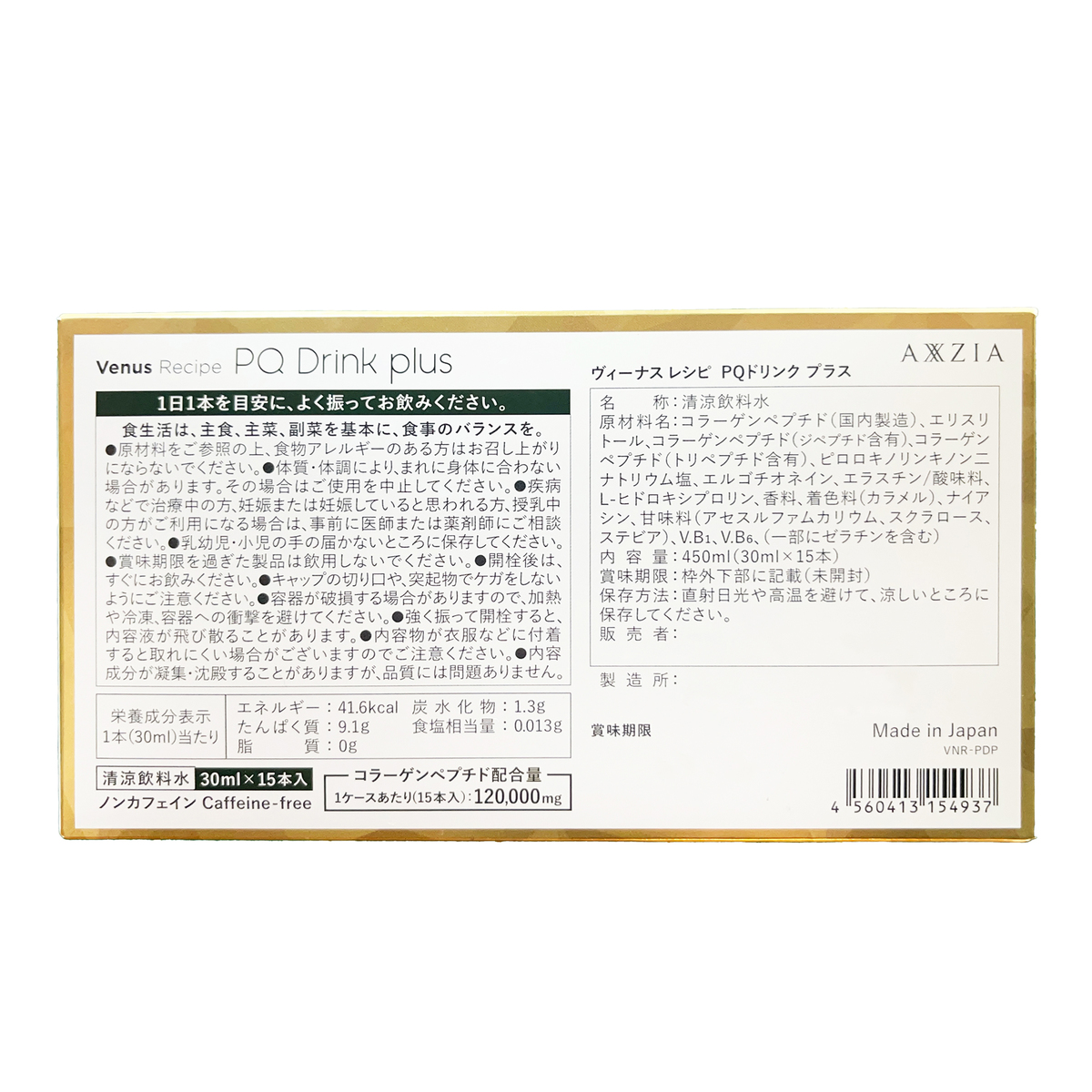 [アレルギー物質特定原材料8品目] なし [内容量] 30ml×15本 [目安量] 1日1本 [お召し上がり方] 1日1本を目安に、よく振ってお飲みください [保存方法] 直射日光・高温多湿を避けて涼しい所に保管してください [栄養成分表示 1本(30ml)当たり] エネルギー:41.6kcal たんぱく質:9.1g 脂 質:0g 炭水化物:1.3g 食塩相当量:0.013g [注意事項] ※原材料をご参照の上、食物アレルギーのある方はお召し上がりにならないでください ※体質・体調により、まれに身体に合わない場合があります。その場合はご使用を中止してください ※疾病などで治療中の方、妊娠または妊娠していると思われる方、授乳中の方がご利用になる場合は、事前に医師または薬剤師にご相談ください ※乳幼児・小児の手の届かないところに保存してください ※賞味期限を過ぎた製品は飲用しないでください ※開栓後は、すぐにお飲みください ※キャップの切り口や、突起物でケガをしないようにご注意ください ※容器が破損する場合がありますので、加熱や冷凍、容器への衝撃を避けてください ※強く振って開栓すると、内容液が飛び散ることがあります ※内容物が衣服などに付着すると取れにくい場合がございますのでご注意ください ※内容成分が凝集・沈殿することがありますが、品質には問題ありません [原料原産地] コラーゲンペプチド(国内製造) [原産国] 日本 [原材料] コラーゲンペプチド(国内製造)、エリスリトール、コラーゲンペプチド(ジペプチド含有)、コラーゲンペプチド(トリペプチド含有)、ピロロキノリンキノン二ナトリウム塩、エルゴチオネイン、エラスチン/酸味料、L-ヒドロキシプロリン、香料、着色料(カラメル)、ナイアシン、甘味料(アセスルファムカリウム、スクラロース、ステビア)、V.B1、V.B6、(一部にゼラチンを含む)