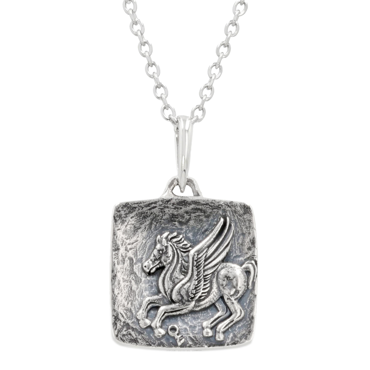 シルバーの重厚感と相まった、甘さを抑えた洗練されたデザイン。ギリシャ神話に登場する天馬ペガサスと英雄ベレロポン。この伝説的な組合わせは、困難に立ち向かう勇気と未知への冒険心の象徴とされている、ストーリー性のあるペンダントです
