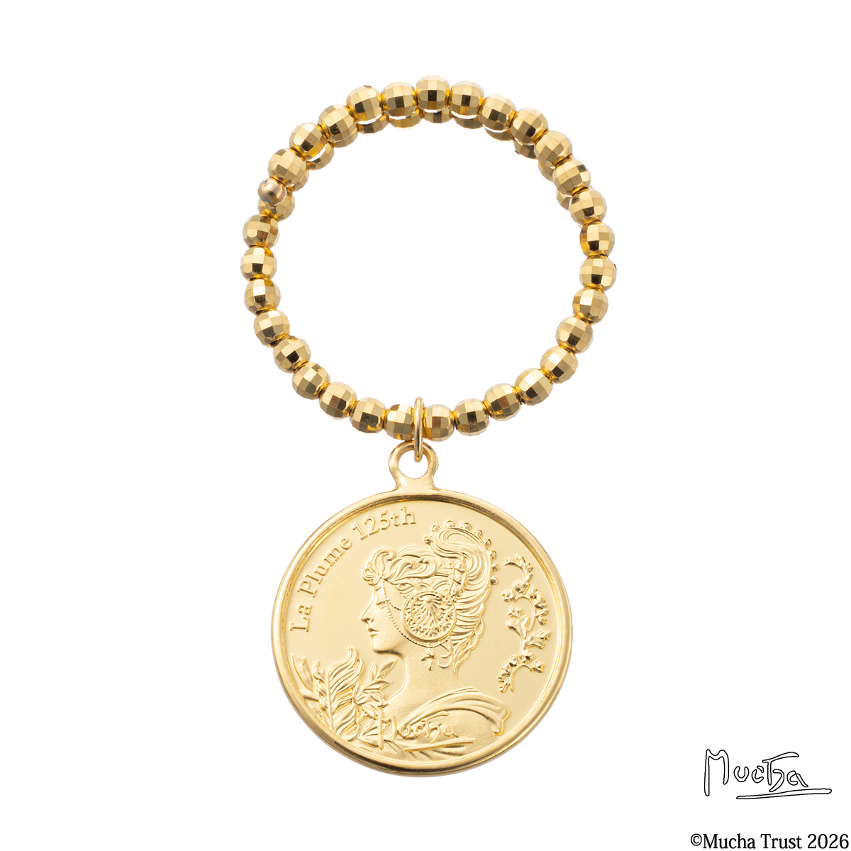 アール・ヌーヴォーを代表する画家の一人、アルフォンス・ミュシャの美しい作品『桜草と羽根』をモチーフにしたメダルを使用したリングです。ミュシャ財団より許諾された著作権使用契約を使用した正規ライセンス商品。ミュシャの芸術を価値ある純金の輝きとともにお楽しみください