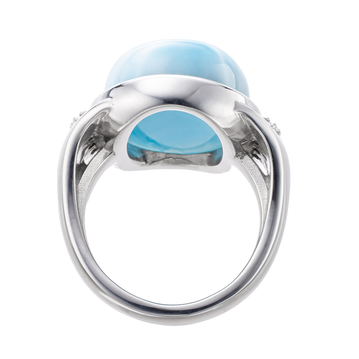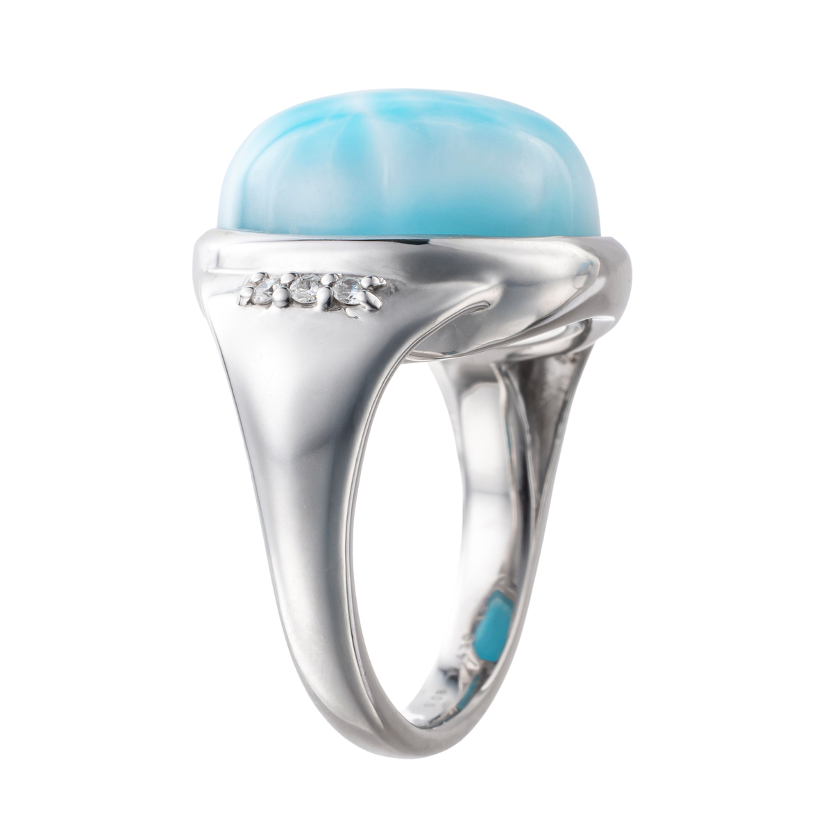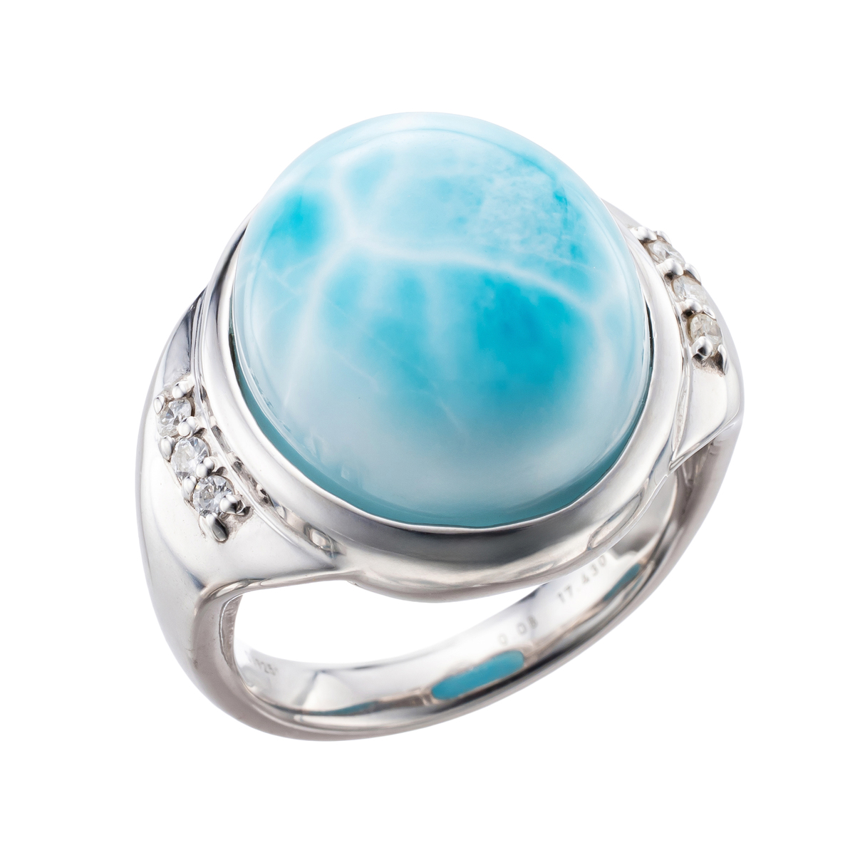 素材:[ラリマー] オーバルシェイプ・カボションカット ベゼルセッティング/接着 1石 14.00ctUP [ダイヤモンド] ラウンドシェイプ 爪留め 6石 合計0.08ctUP 最大幅(約) 18.5mm 最小幅(約) 3.0mm 総重量(約) 9.1g [地金]シルバー925 [メッキ]ロジウムメッキ [付属品]鑑別書 ■サイズ直し対象外 ■受注発注商品のためデザイン・価値に影響のない範囲で仕様が変わる場合がございます ■素材の大きさ・形・色合い、製品のサイズは1点1点多少異なります ■ラリマーは商業名で、鉱物名はペクトライトです 【日本製(ラリマーはドミニカ共和国バラオナ州産)】