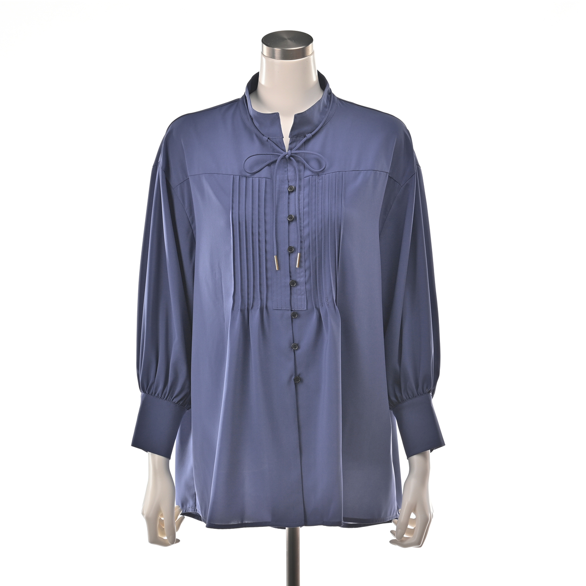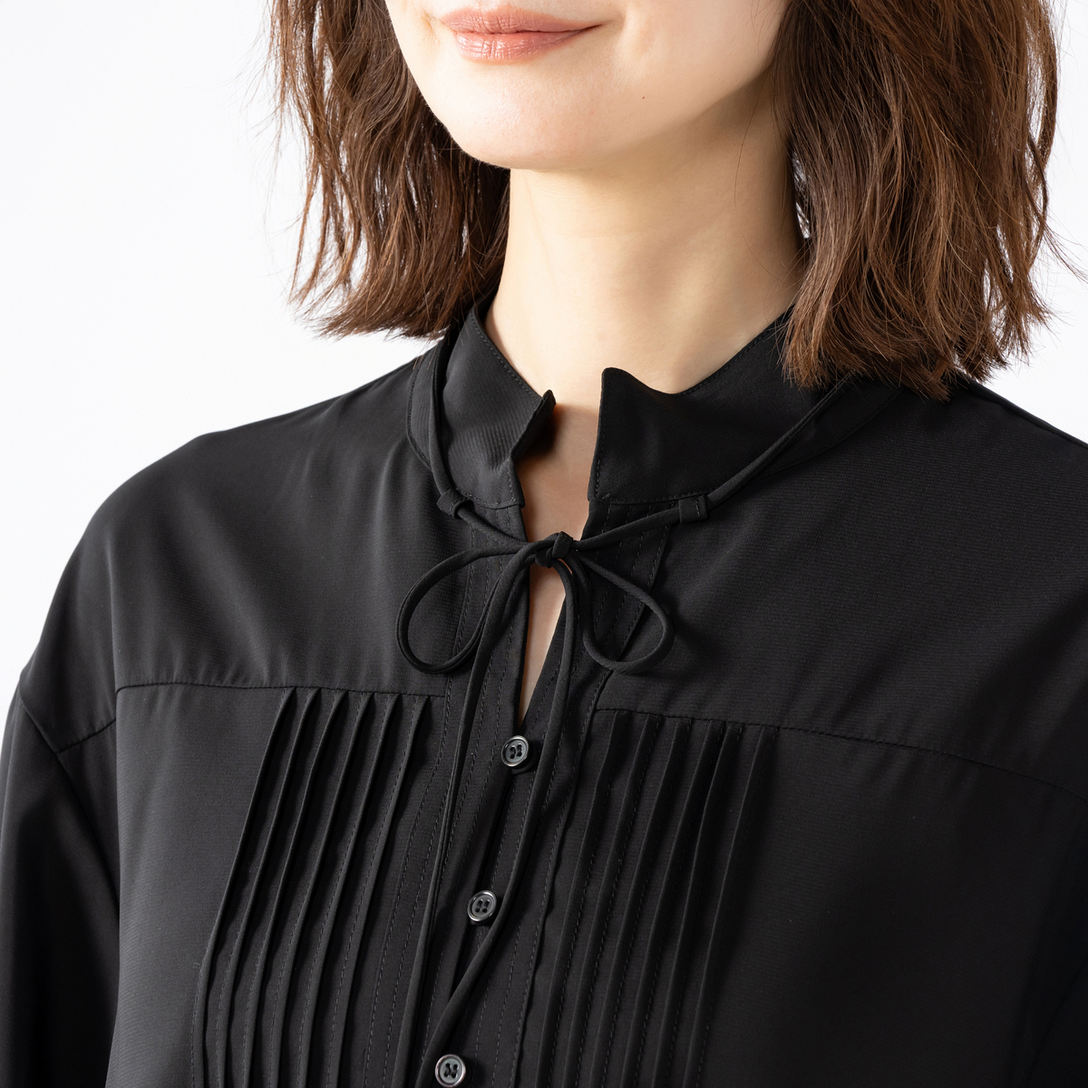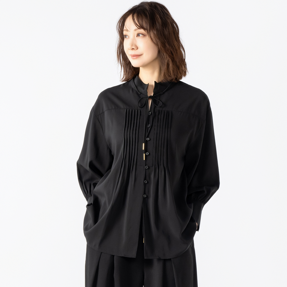 デニムなどにさらっと合わせるだけで上品に決まるブラウス。シャープな印象のハイネックデザインに、細かなピンタックと前たて部分のステッチがモダンな雰囲気を演出します