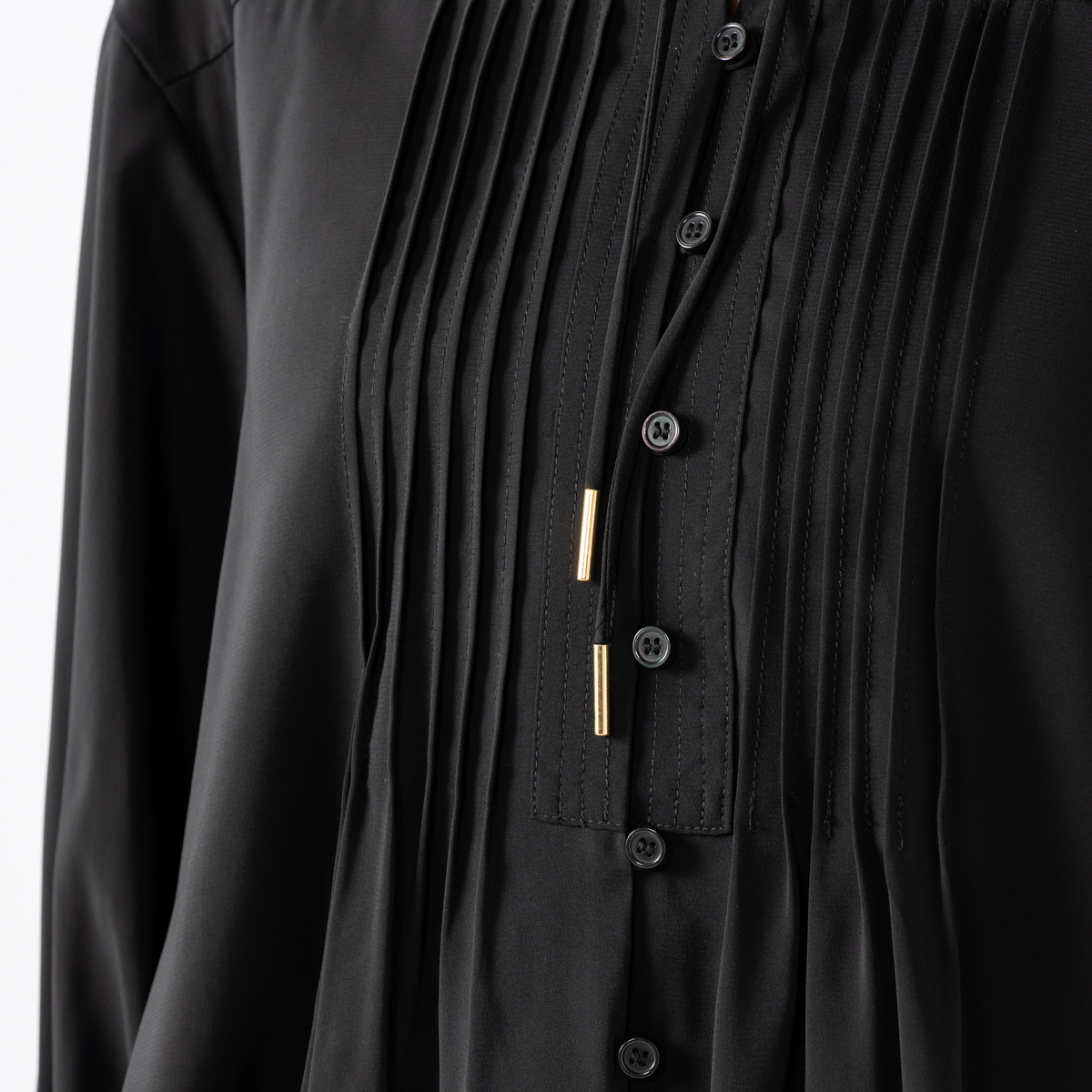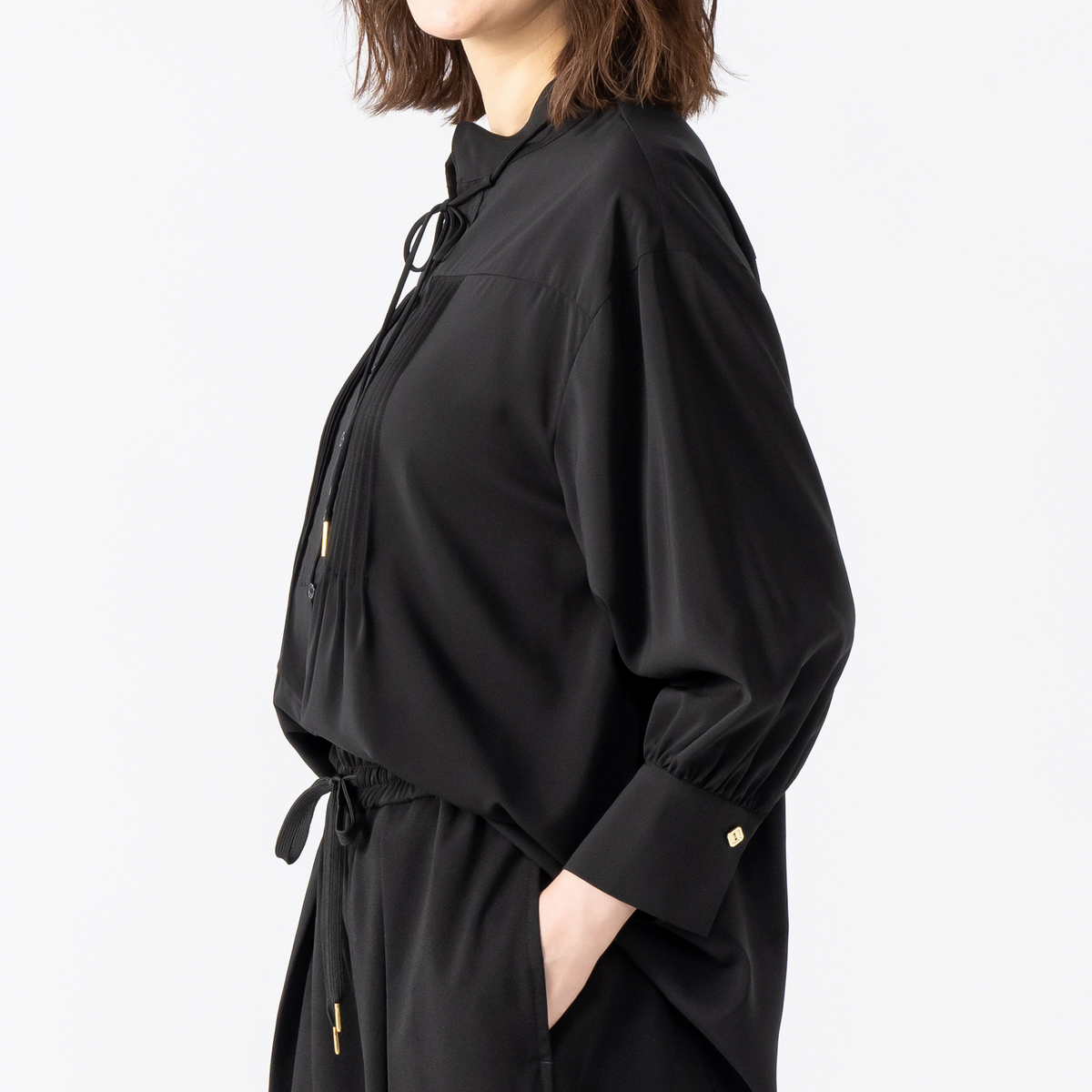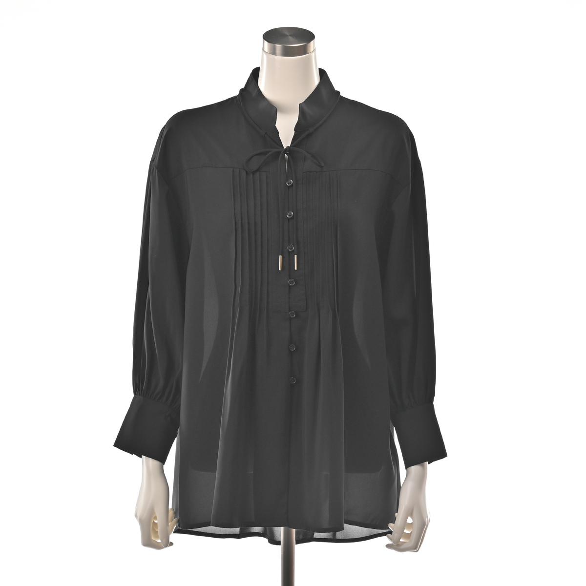 デニムなどにさらっと合わせるだけで上品に決まるブラウス。シャープな印象のハイネックデザインに、細かなピンタックと前たて部分のステッチがモダンな雰囲気を演出します