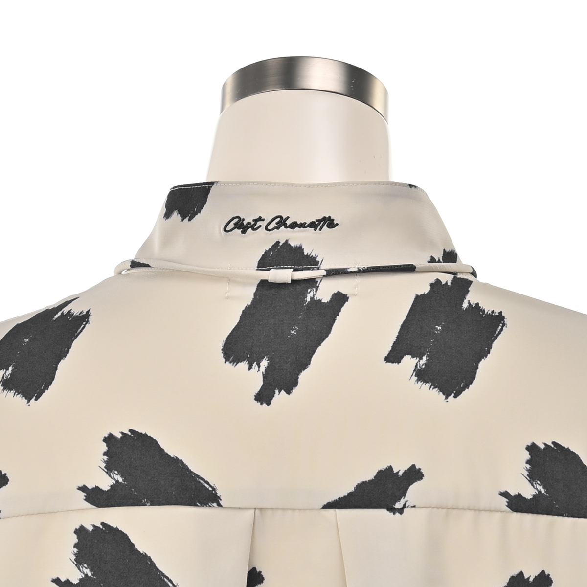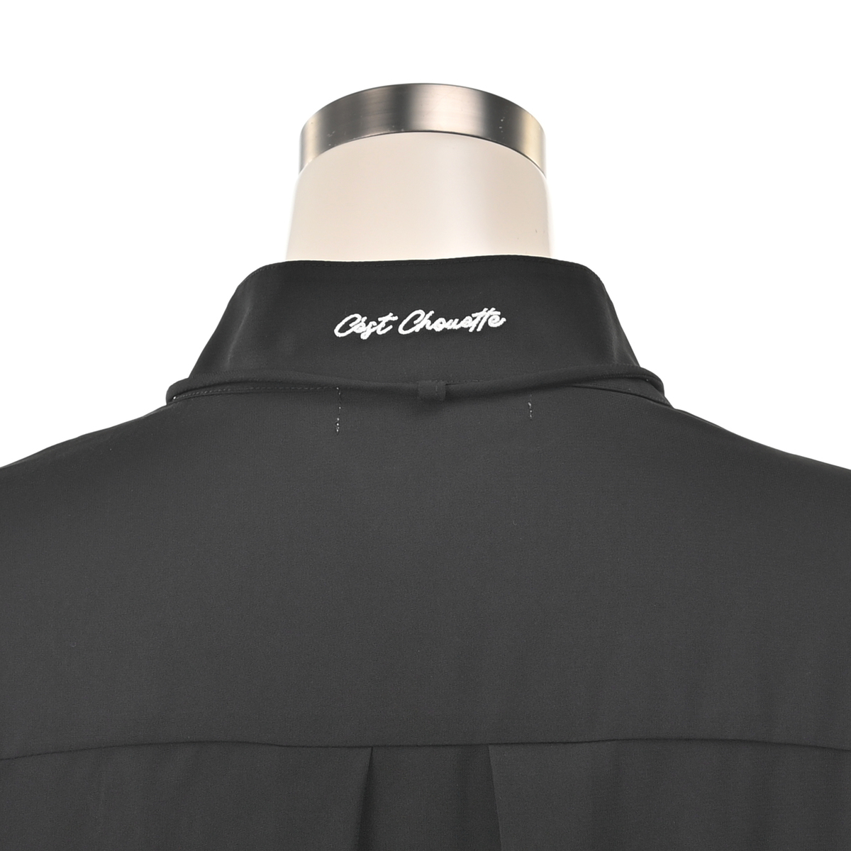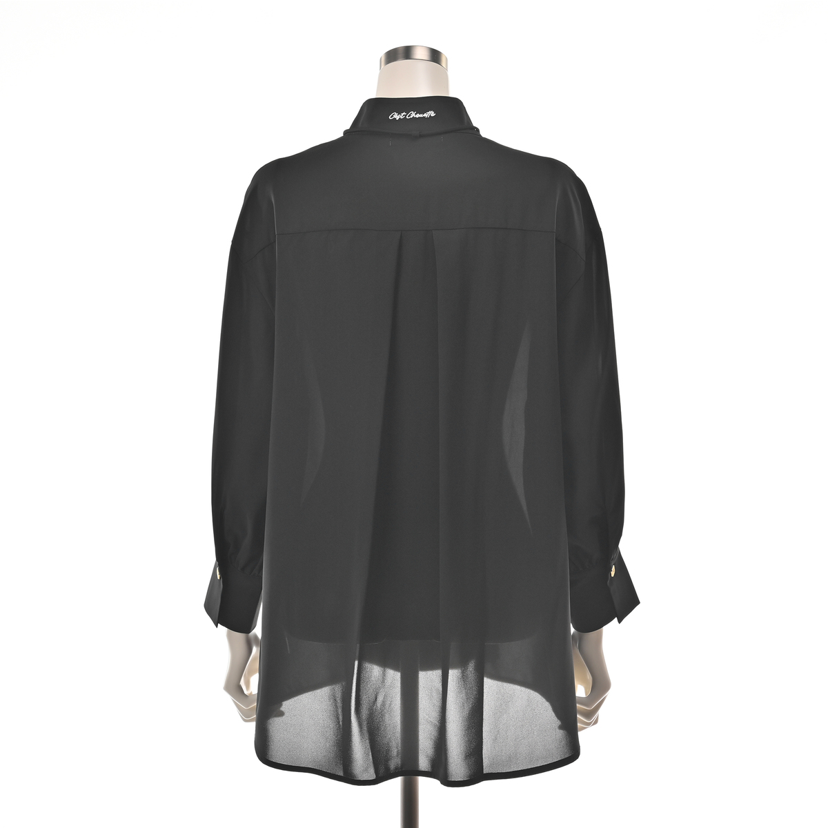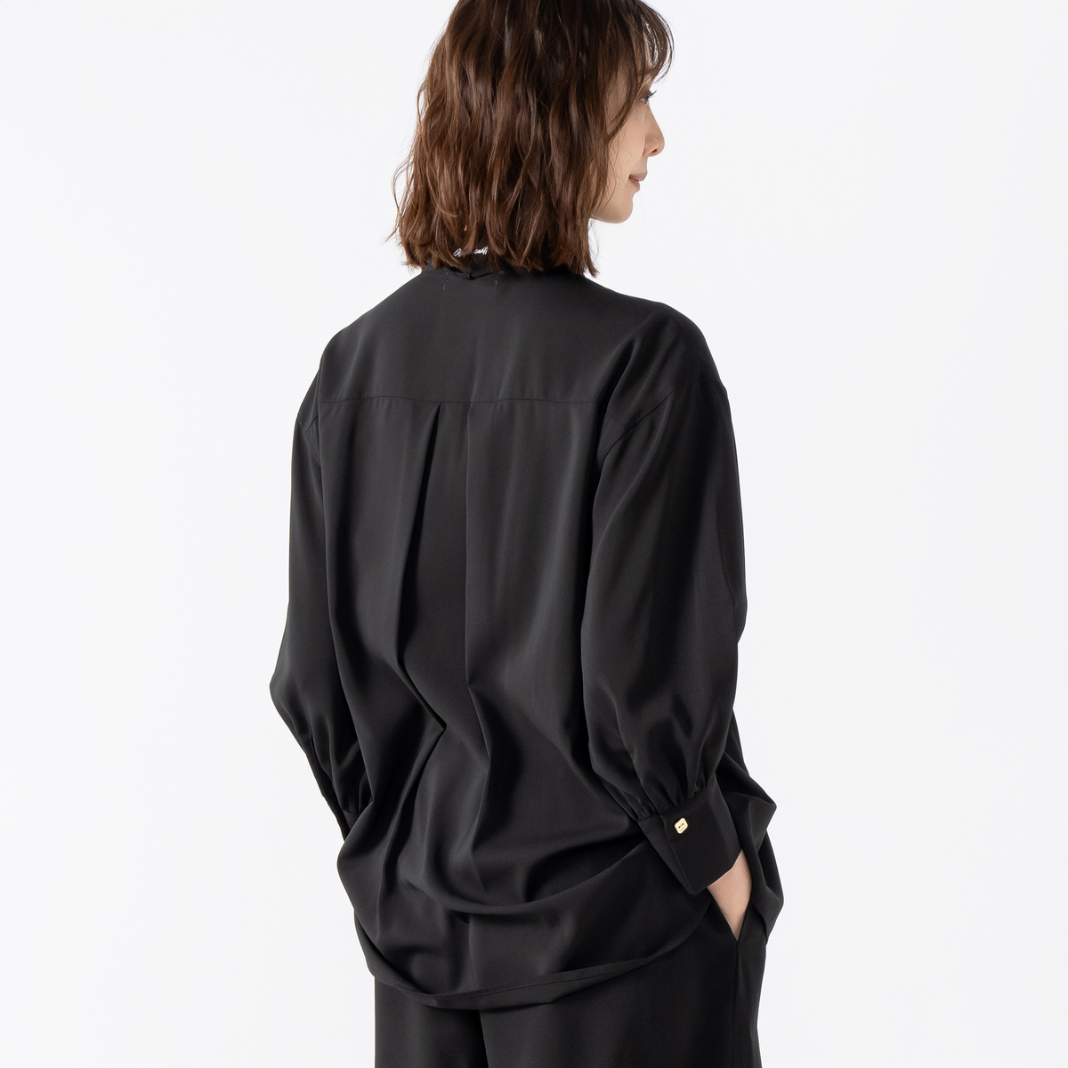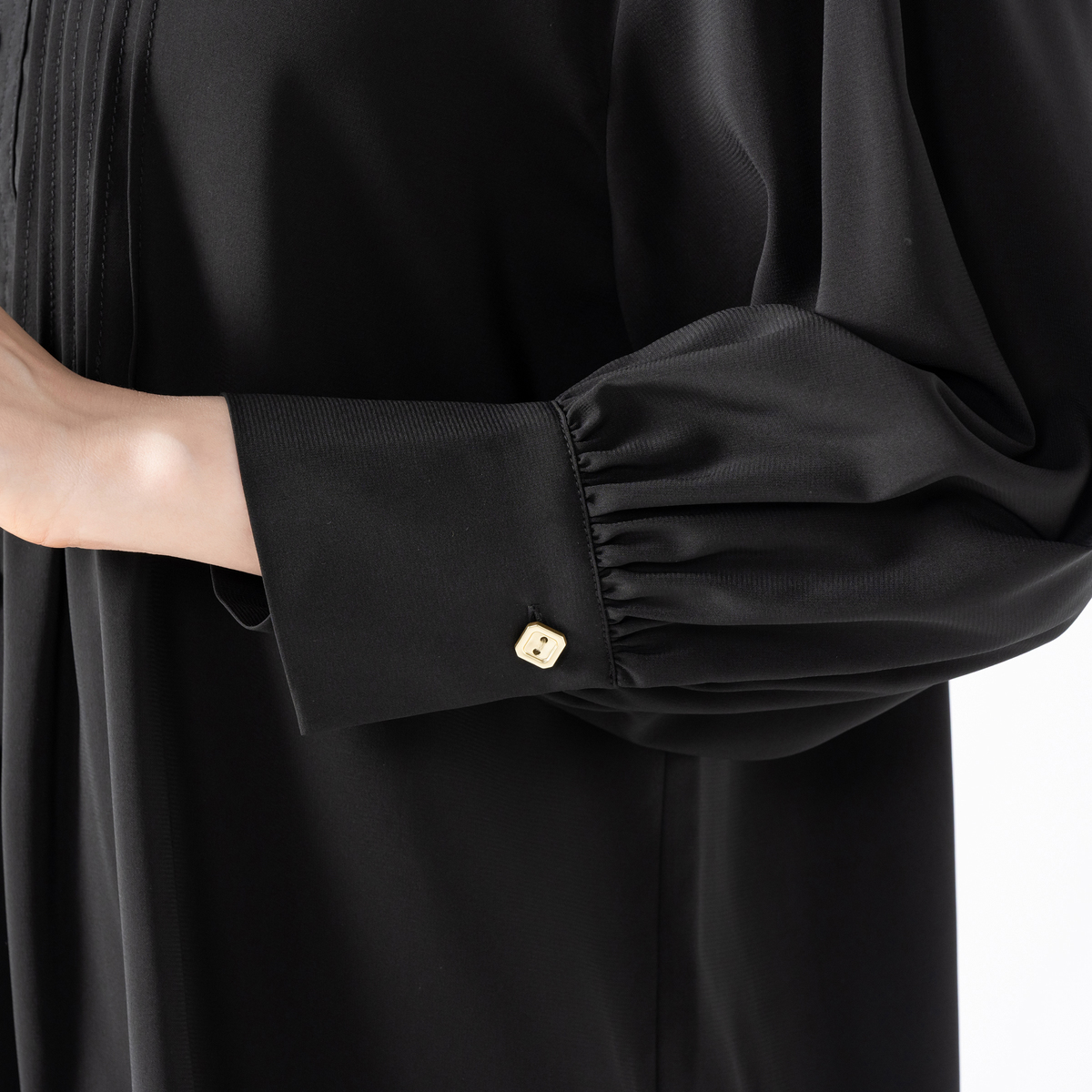 透けすぎず重すぎないポリエステルストレッチジョーゼット素材を使用。フロントは小さめのシェル風ボタン、袖口はメタル調ボタンをあしらいました