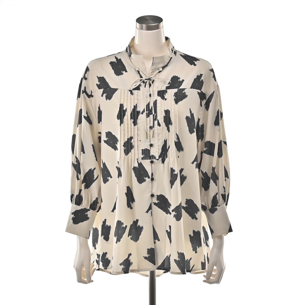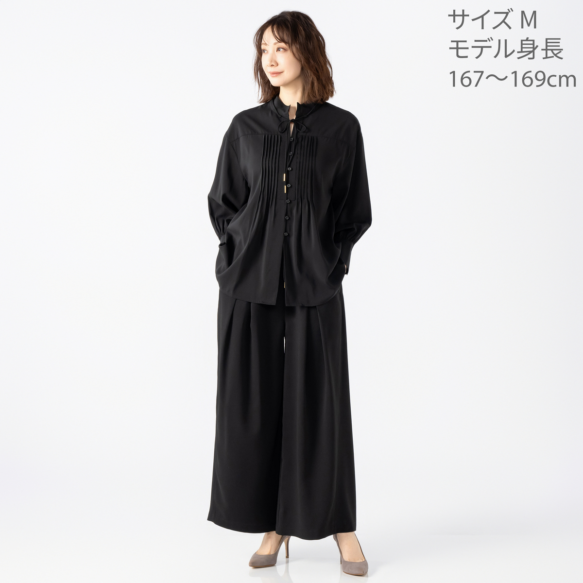 フロントのピンタックを活かした裾広がりのボリュームシルエット。落ち感のある素材で広がりすぎず、上品な印象に。襟元には細めの共布リボンをあしらいアクセントになっています