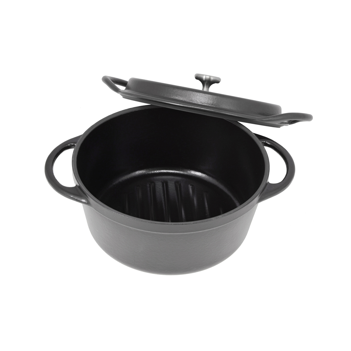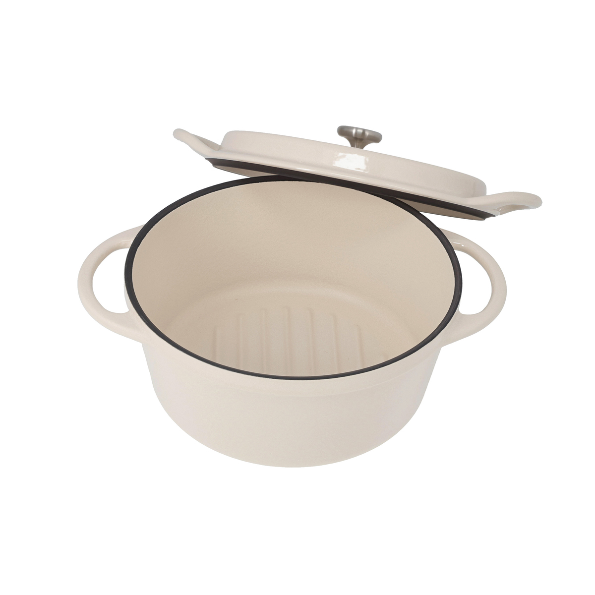 熱伝導と蓄熱性のある鉄鋳物が鍋全体を効率よく温め、食材の芯までじっくり熱を通します。食材から出た水分は鍋底で風味や旨みを含んだ蒸気となり、独自のテーパーエアタイト構造で鍋の中に閉じ込められ、蒸気はフタの流線型形状により対流し、食材の旨みをまとめながら外側からじんわり加熱します