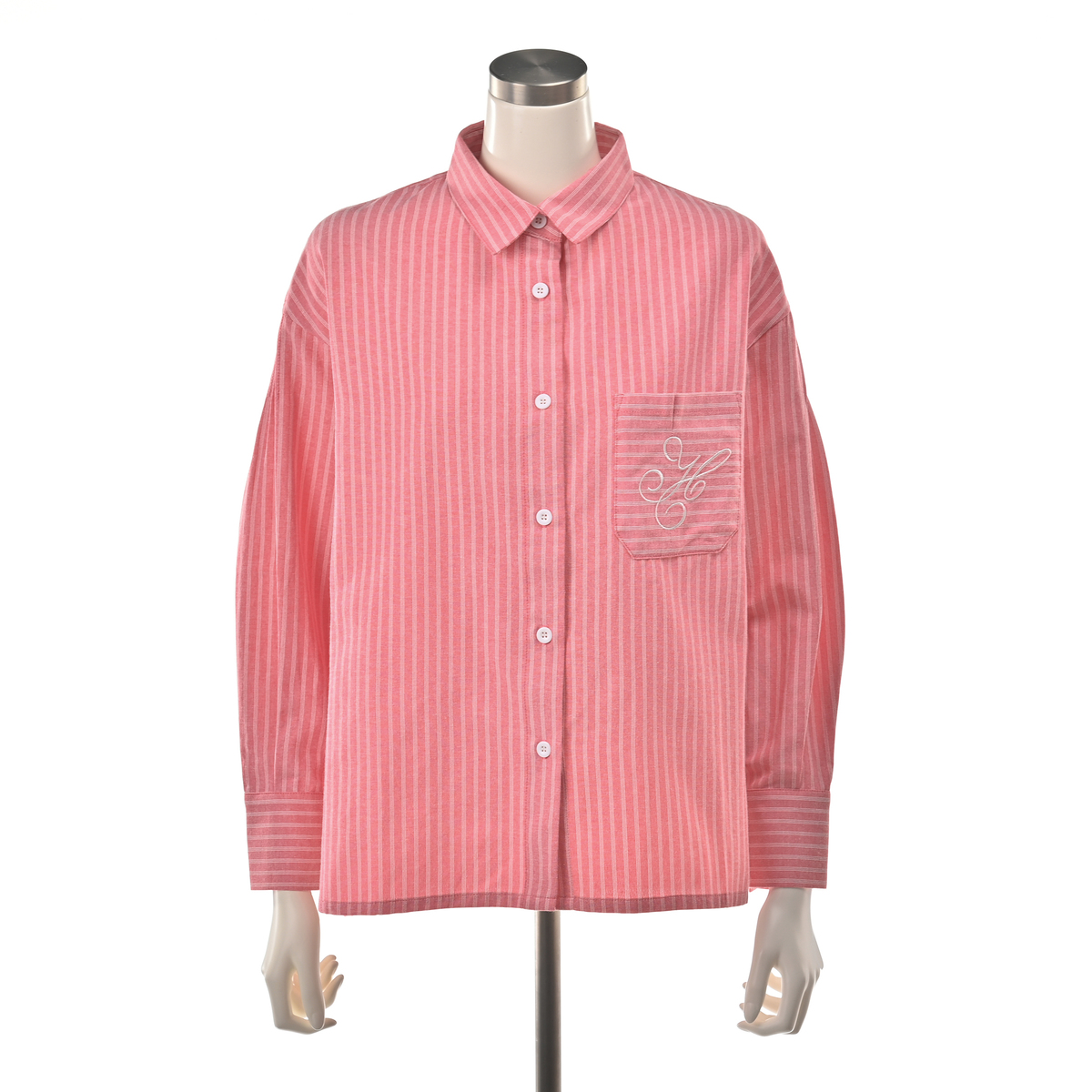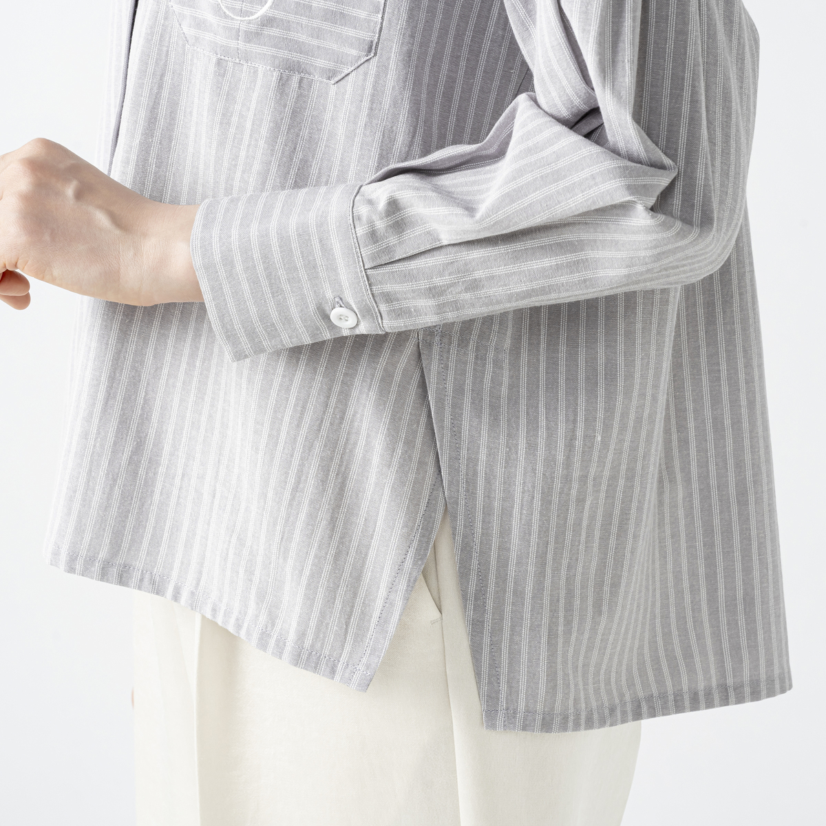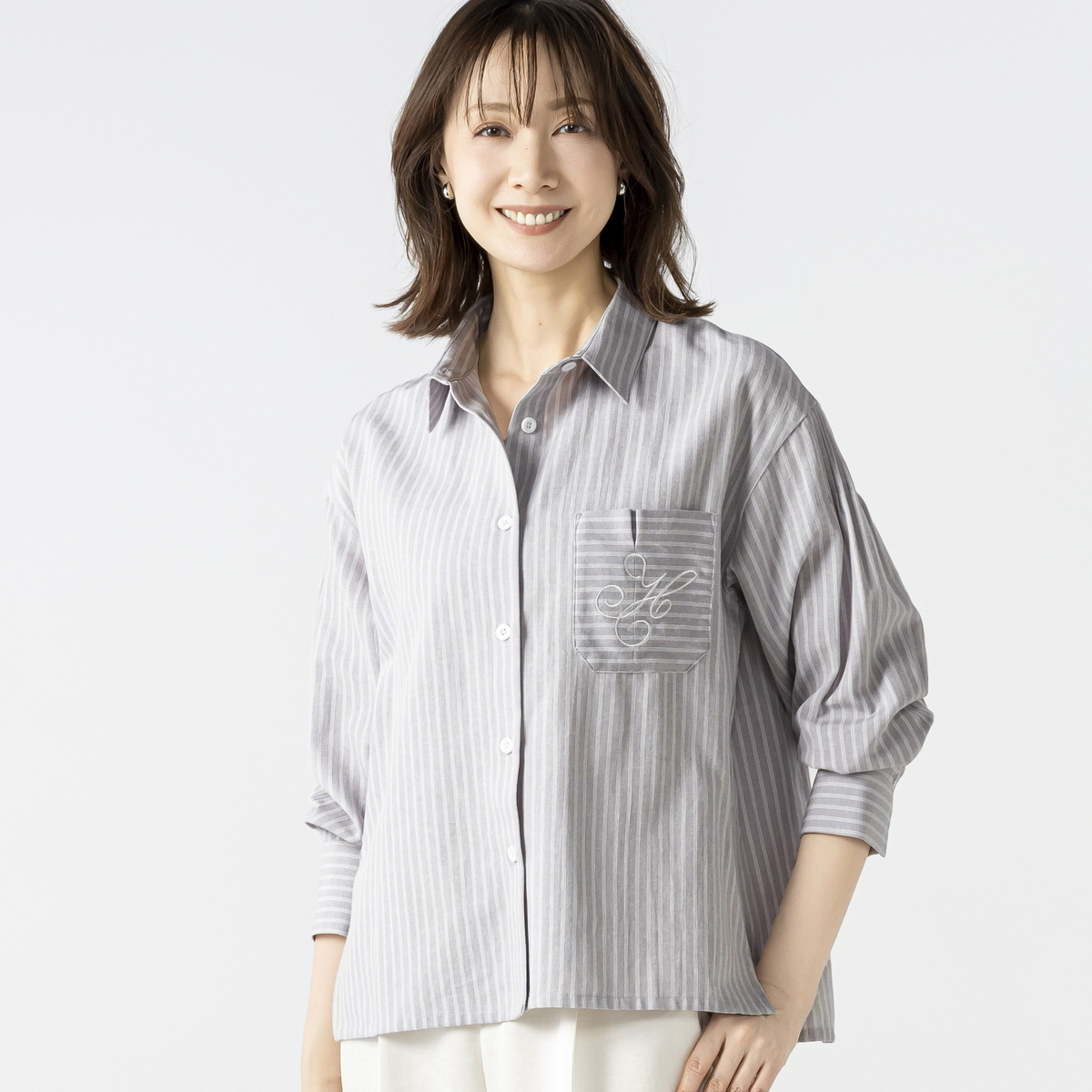 上品なストライプのシャツジャケット。シャツとしてはもちろん、羽織りとしてもお使いいただけます