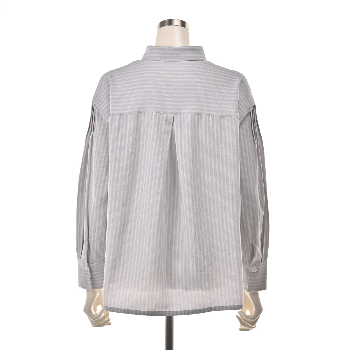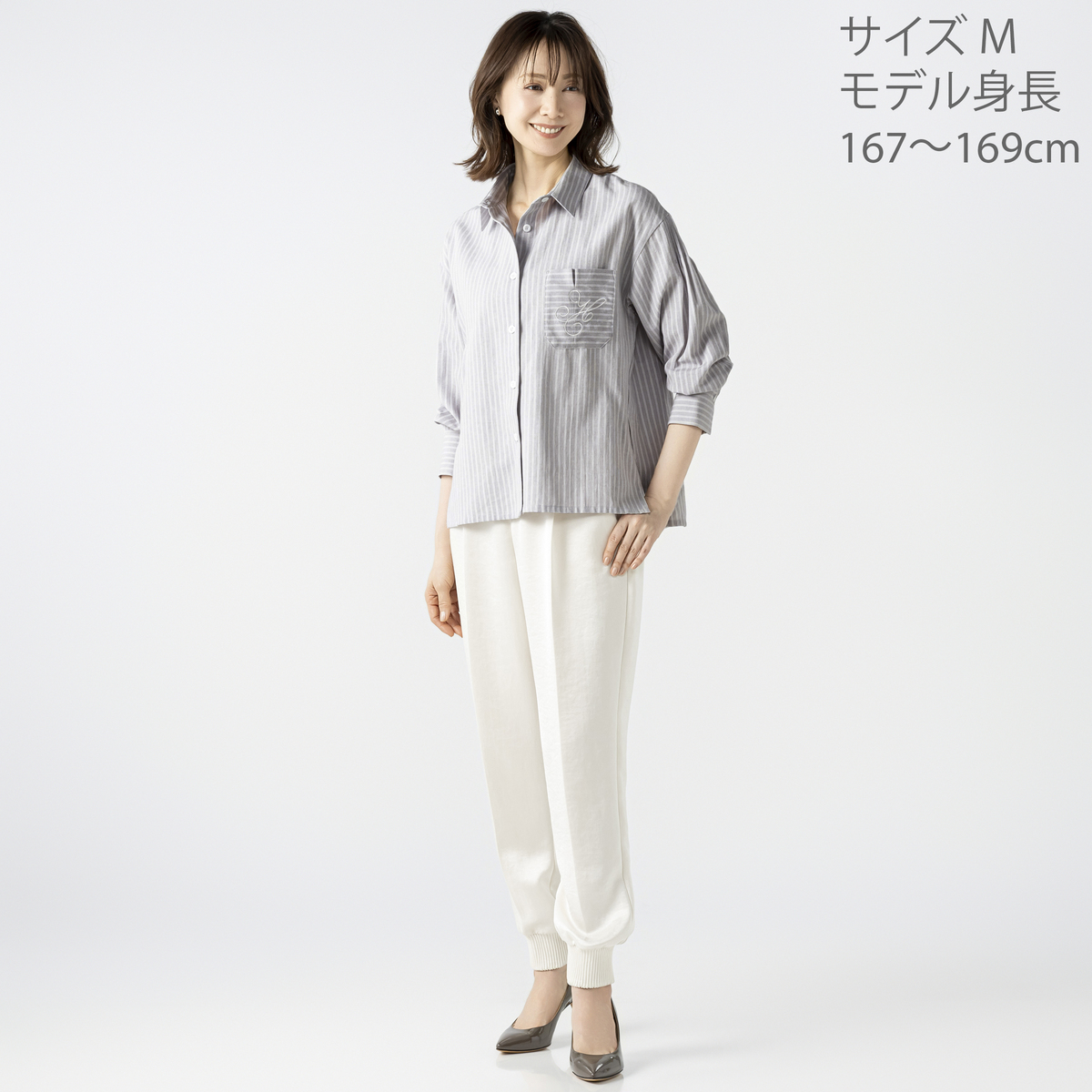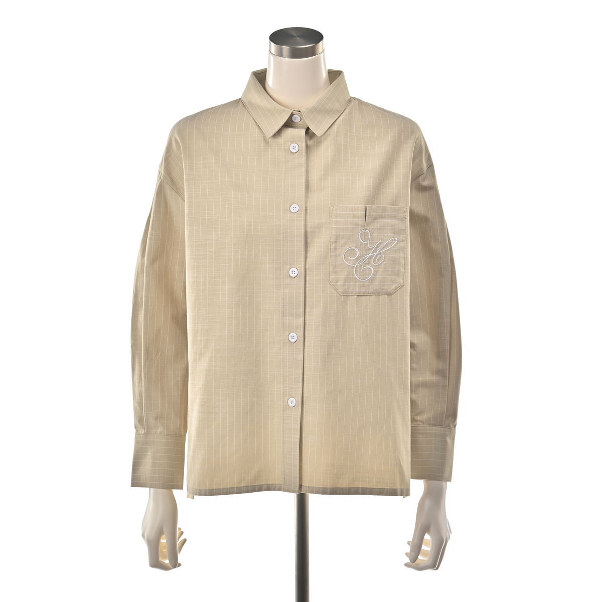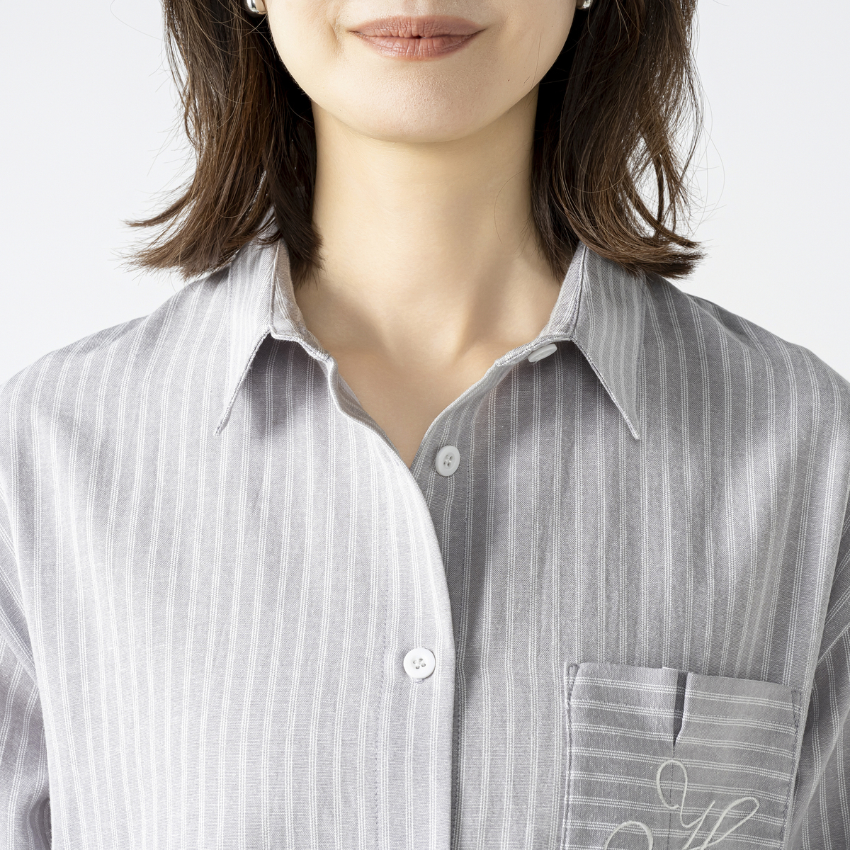 上品なストライプのシャツジャケット。シャツとしてはもちろん、羽織りとしてもお使いいただけます