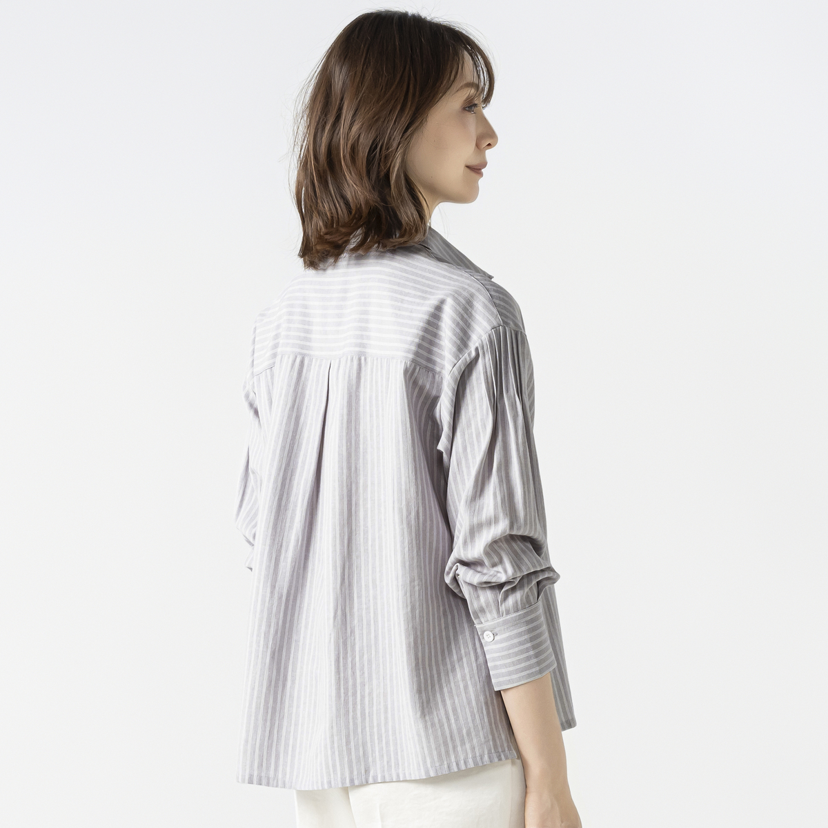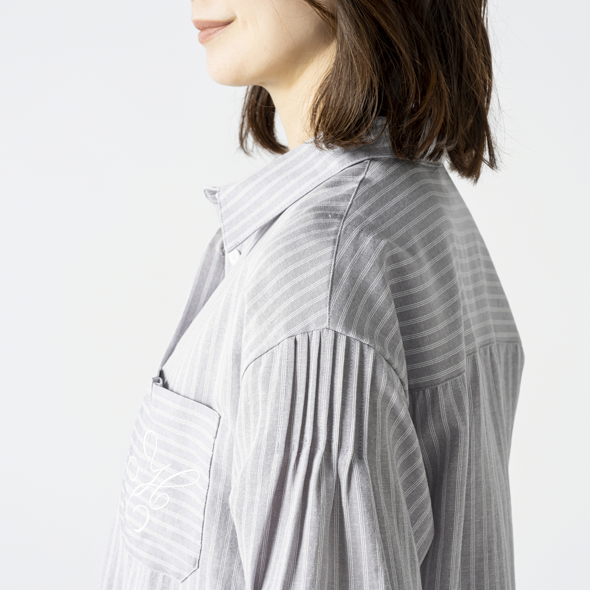脇のデザインベンツや袖山のピンタックが特徴。胸ポケットにはタックと刺繍をあしらいアクセントになっています