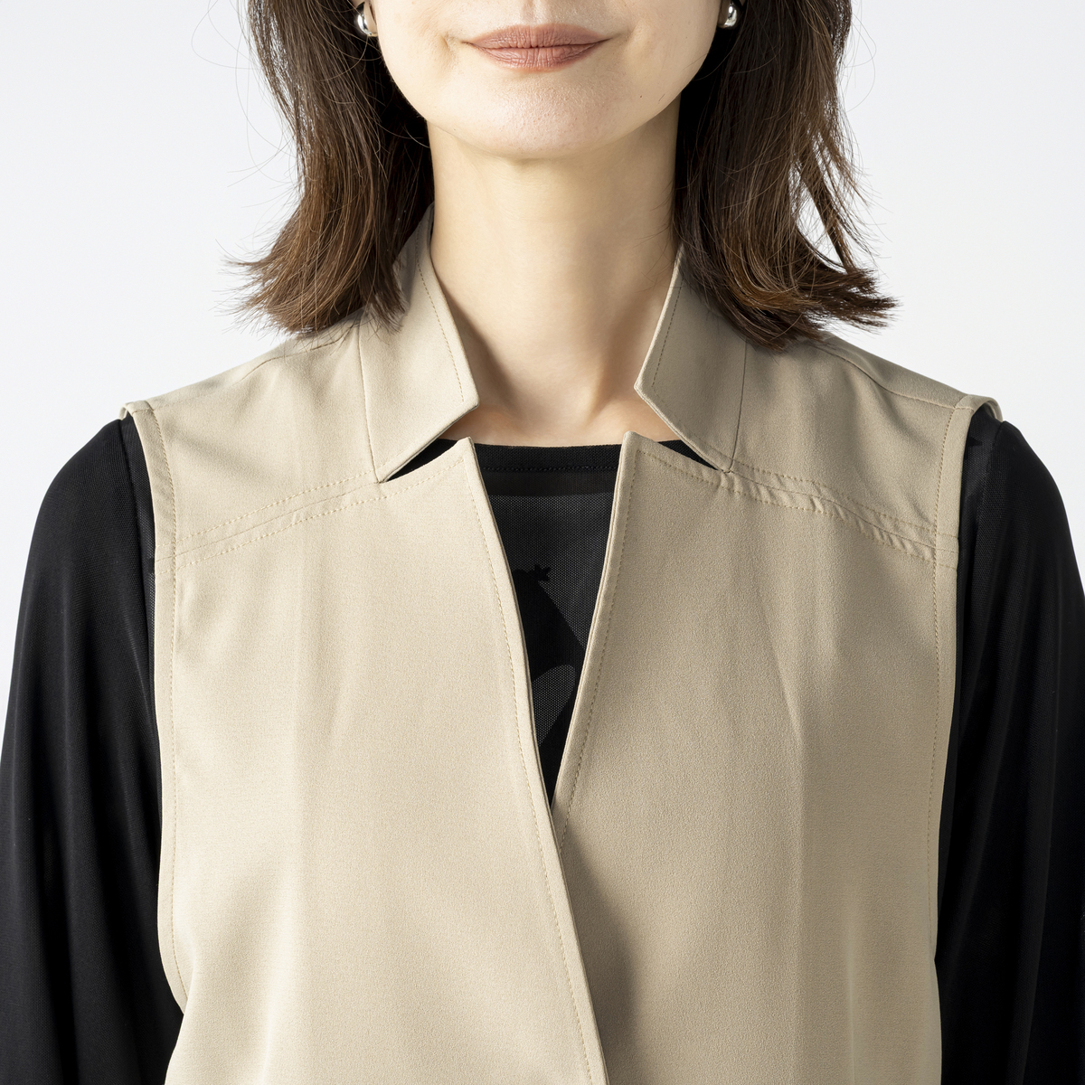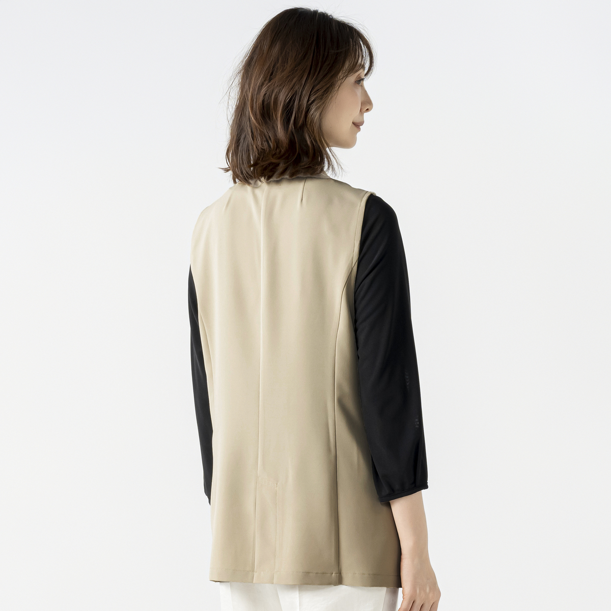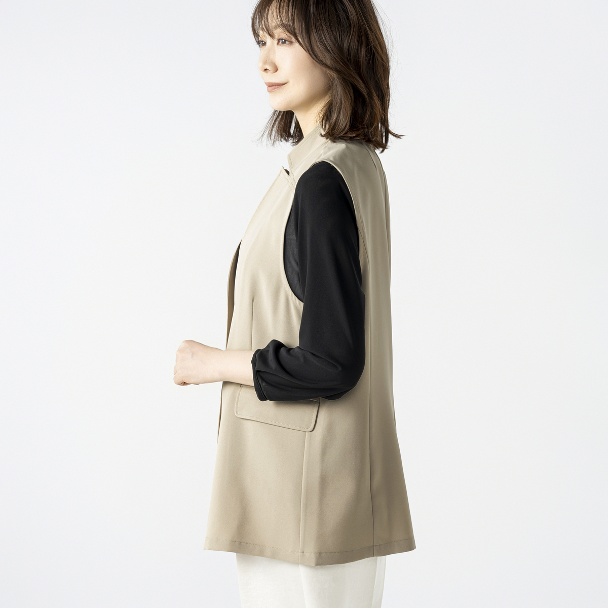 刻み衿のアクセントが都会的な雰囲気を演出するショートジレです。ゆとりを持たせながら、メリハリのあるシルエットに。コーディネートに取り入れるだけで洗練されたスタイルに仕上がります
