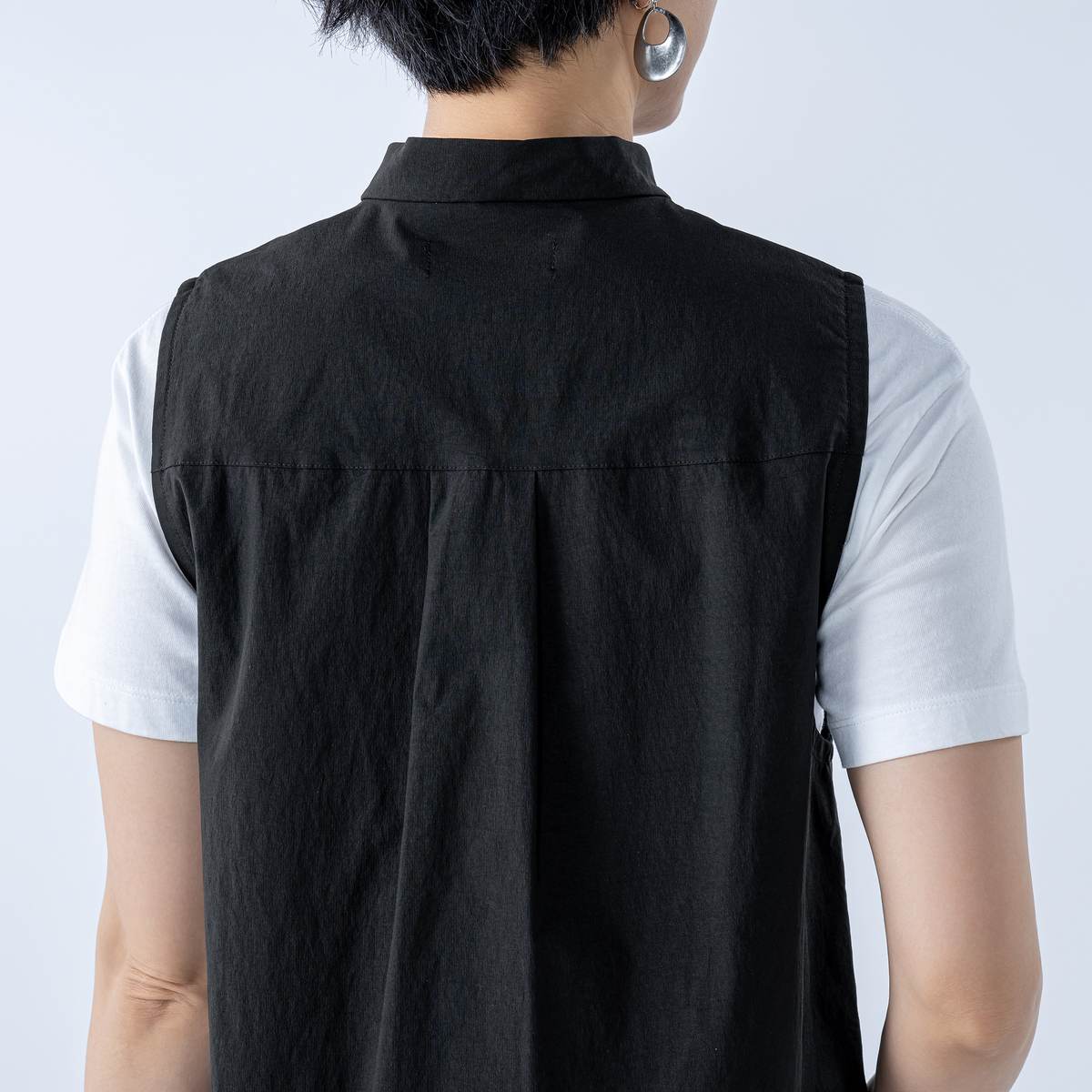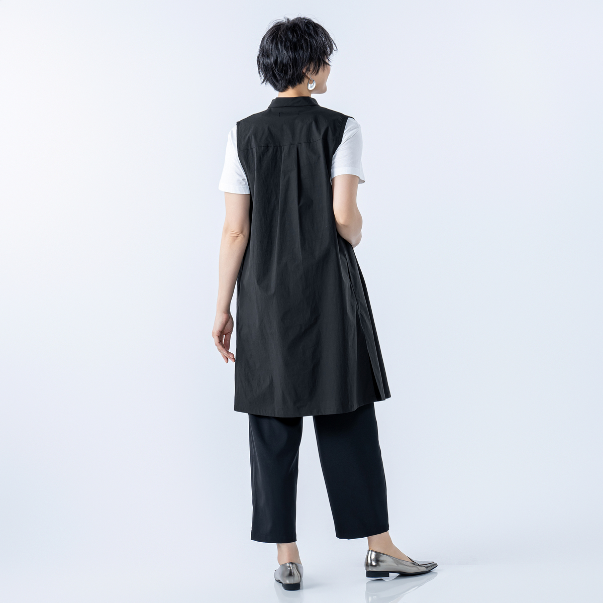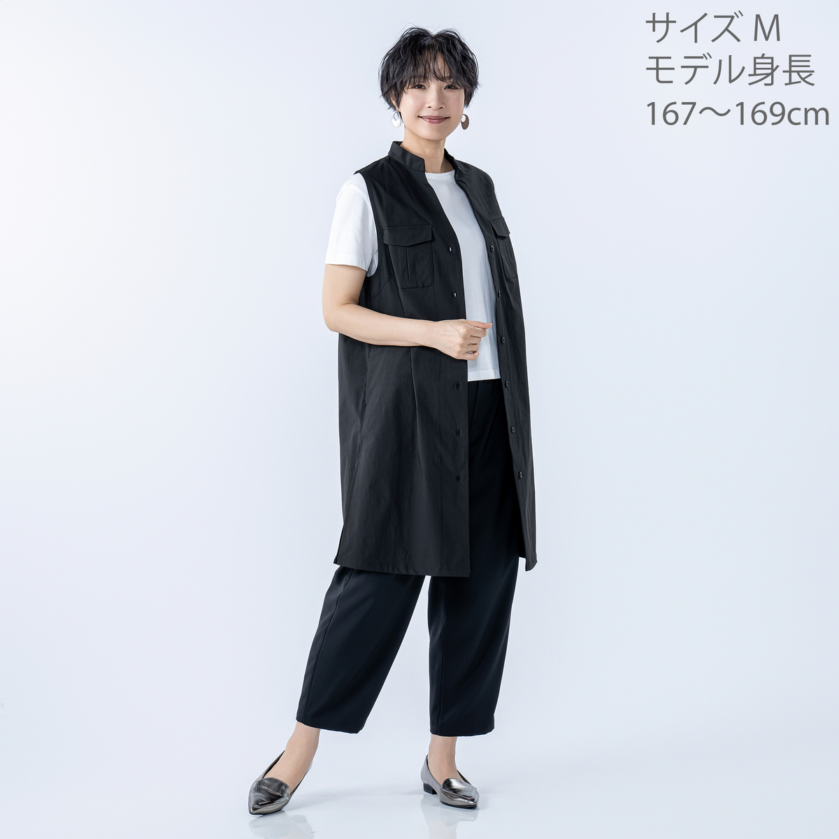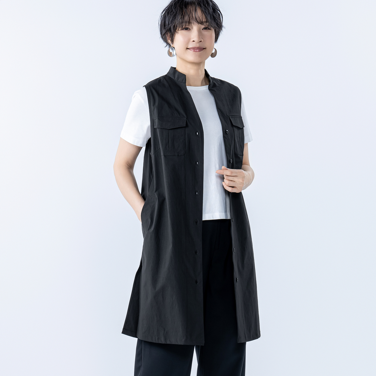 モードな着こなしが楽しめるサファリポケットジレ。全身を細く長く見せてくれるIラインシルエットです
