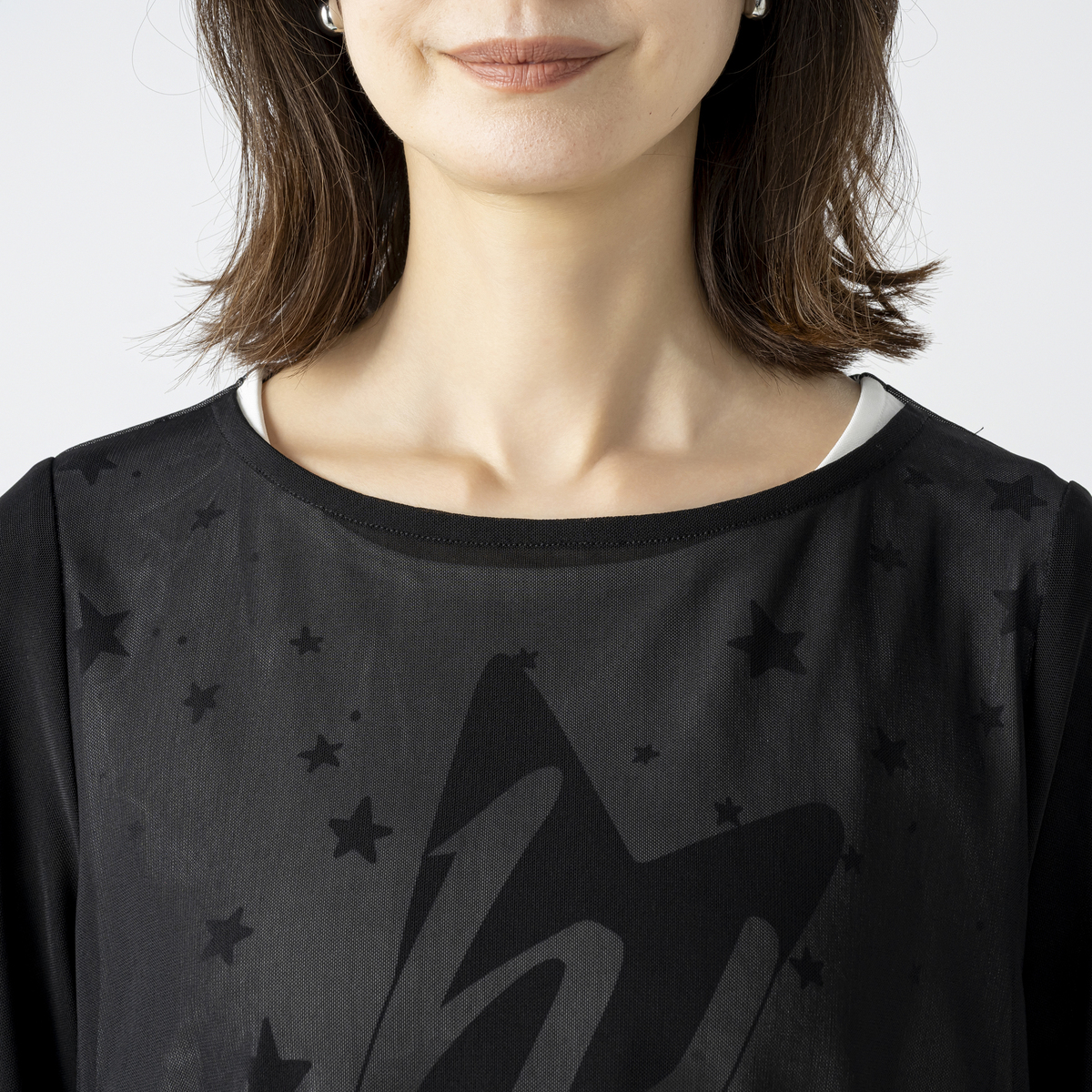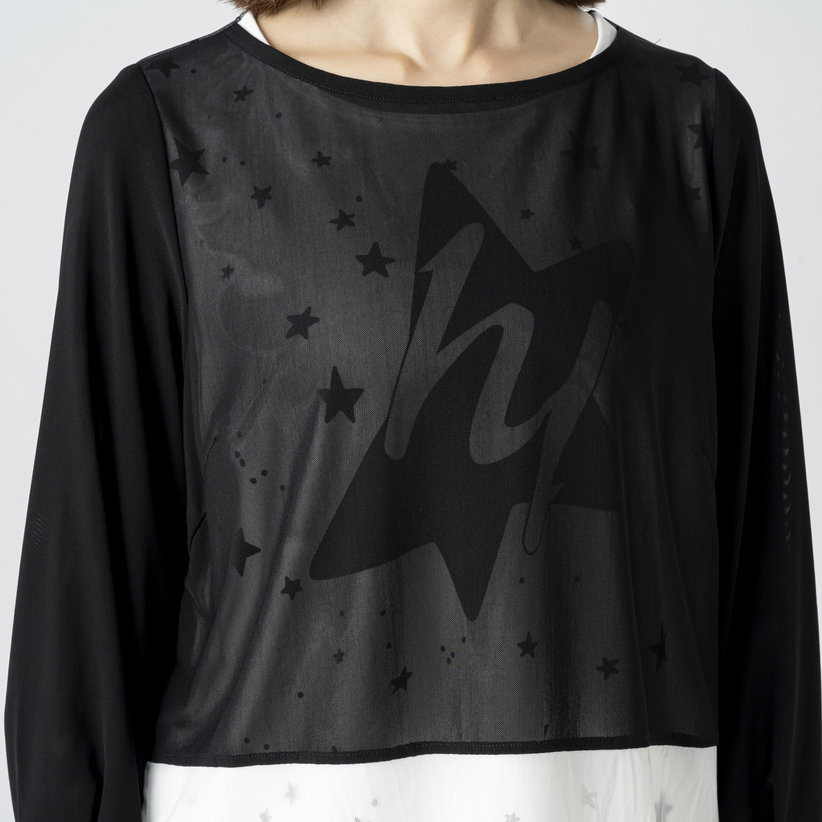 星を散りばめたプリントプルオーバーに、軽やかなチュールを重ねたレイヤードデザイン。遊び心のある一枚です