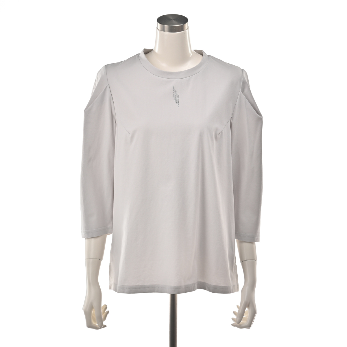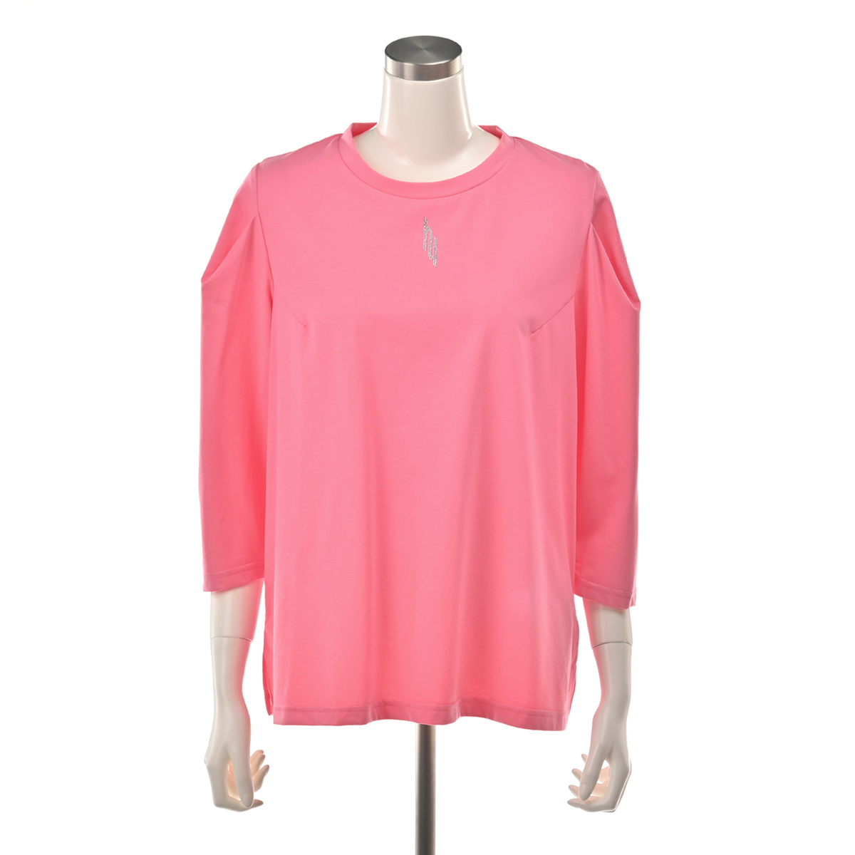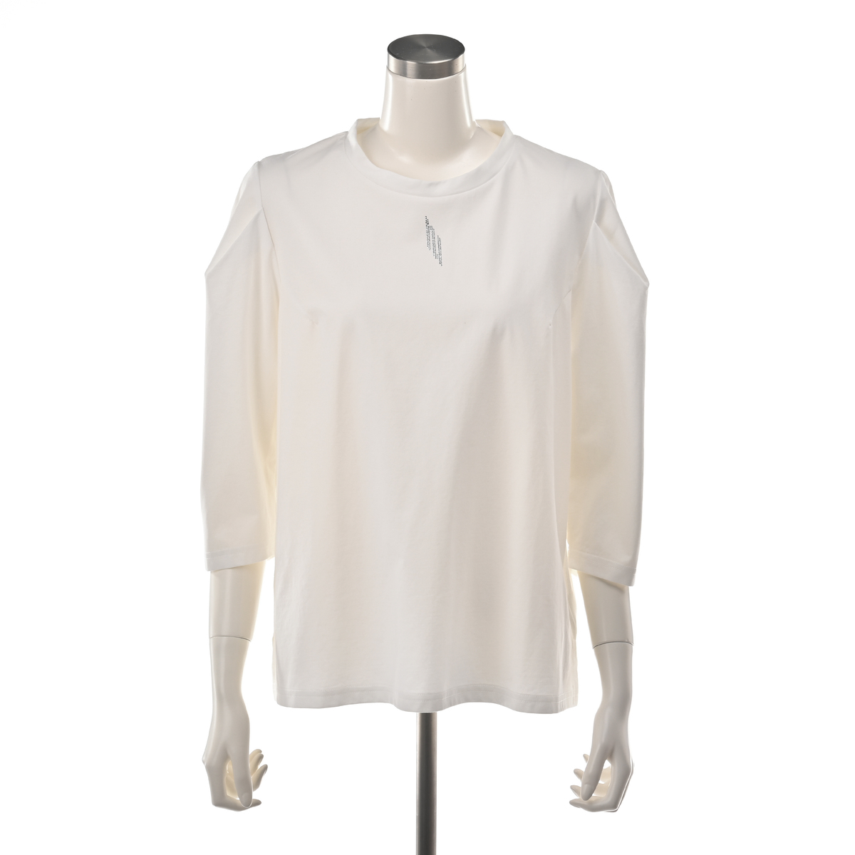 毛羽立ちの少ない高級感のあるシルケット素材のプルオーバー。立体的なタックスリーブが腕のラインを拾いにくく、シンプルながら華やかな印象を演出。衿元には輝くHYロゴを添え、顔まわりを明るく見せる上品なアクセントになります