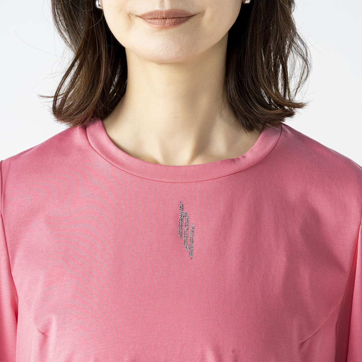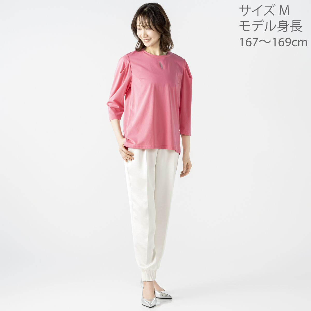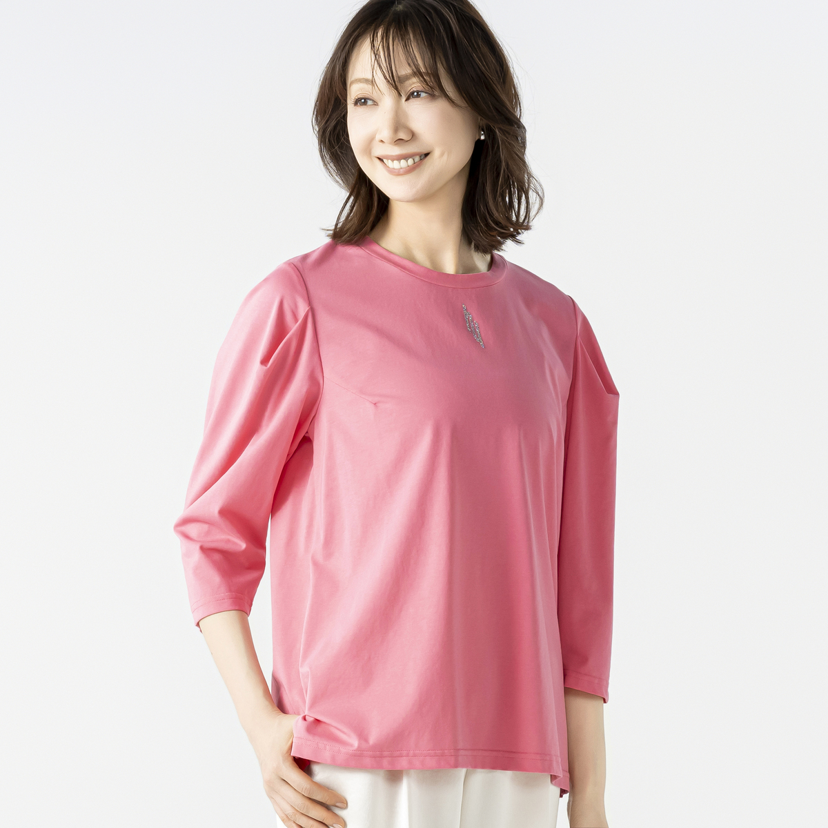 毛羽立ちの少ない高級感のあるシルケット素材のプルオーバー。立体的なタックスリーブが腕のラインを拾いにくく、シンプルながら華やかな印象を演出。衿元には輝くHYロゴを添え、顔まわりを明るく見せる上品なアクセントになります