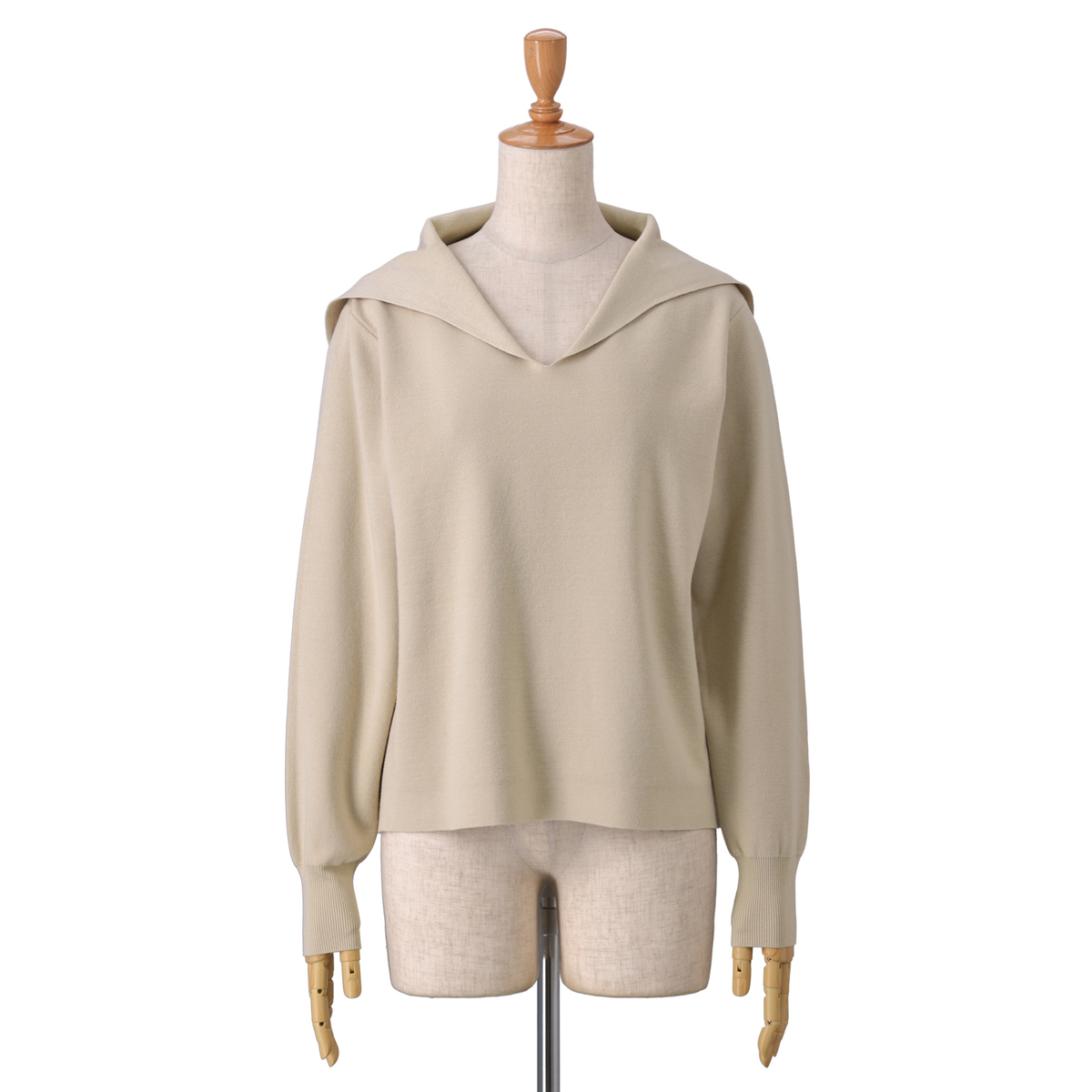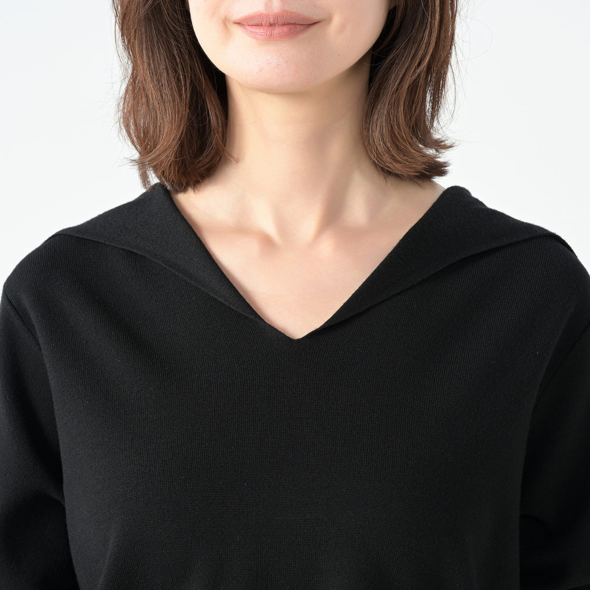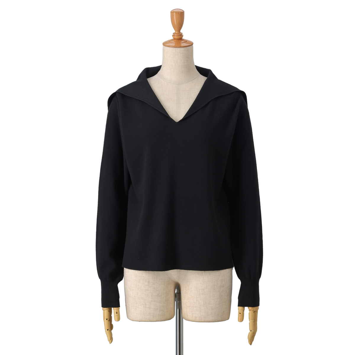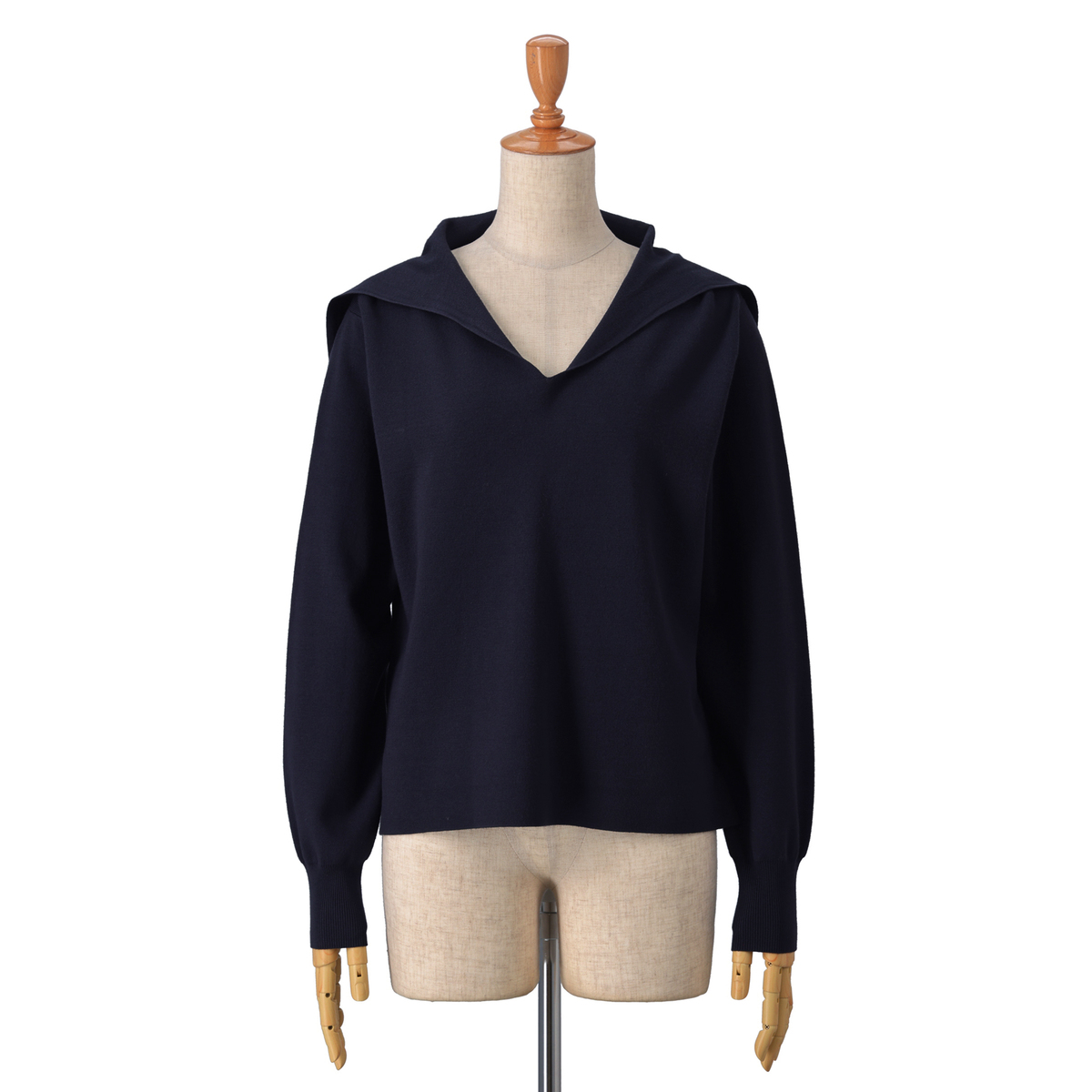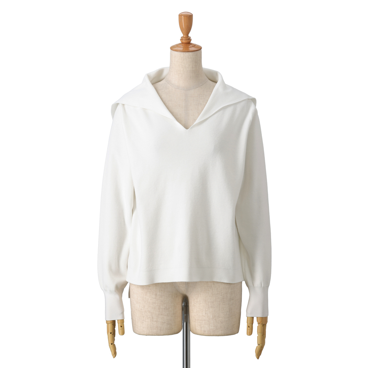 14Gハーフミラノ編みのセーラーカラーニット。セーラーカラーは前身頃から編み続きのデザインに。衿元はすっきりと美しく見え、上品な印象を演出します