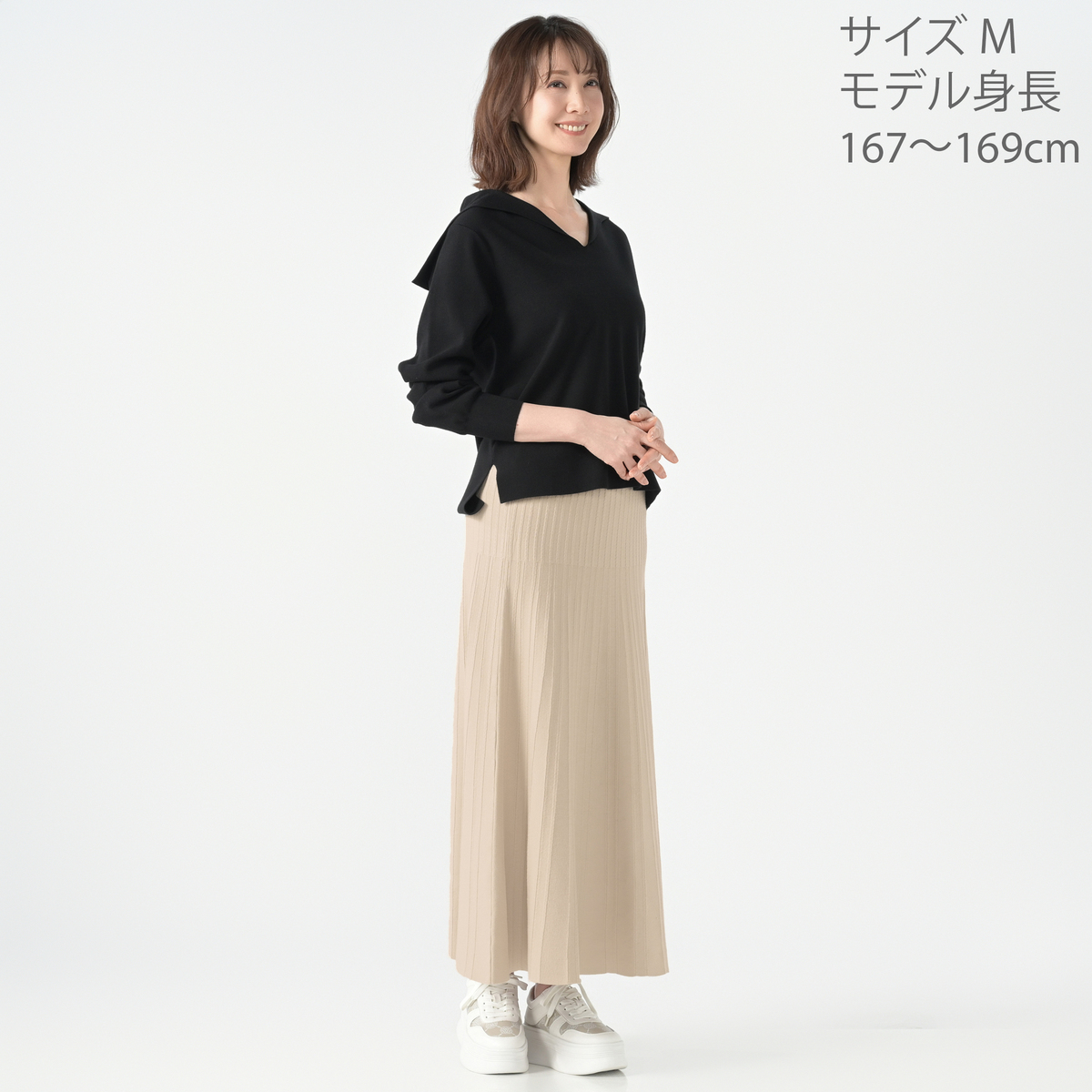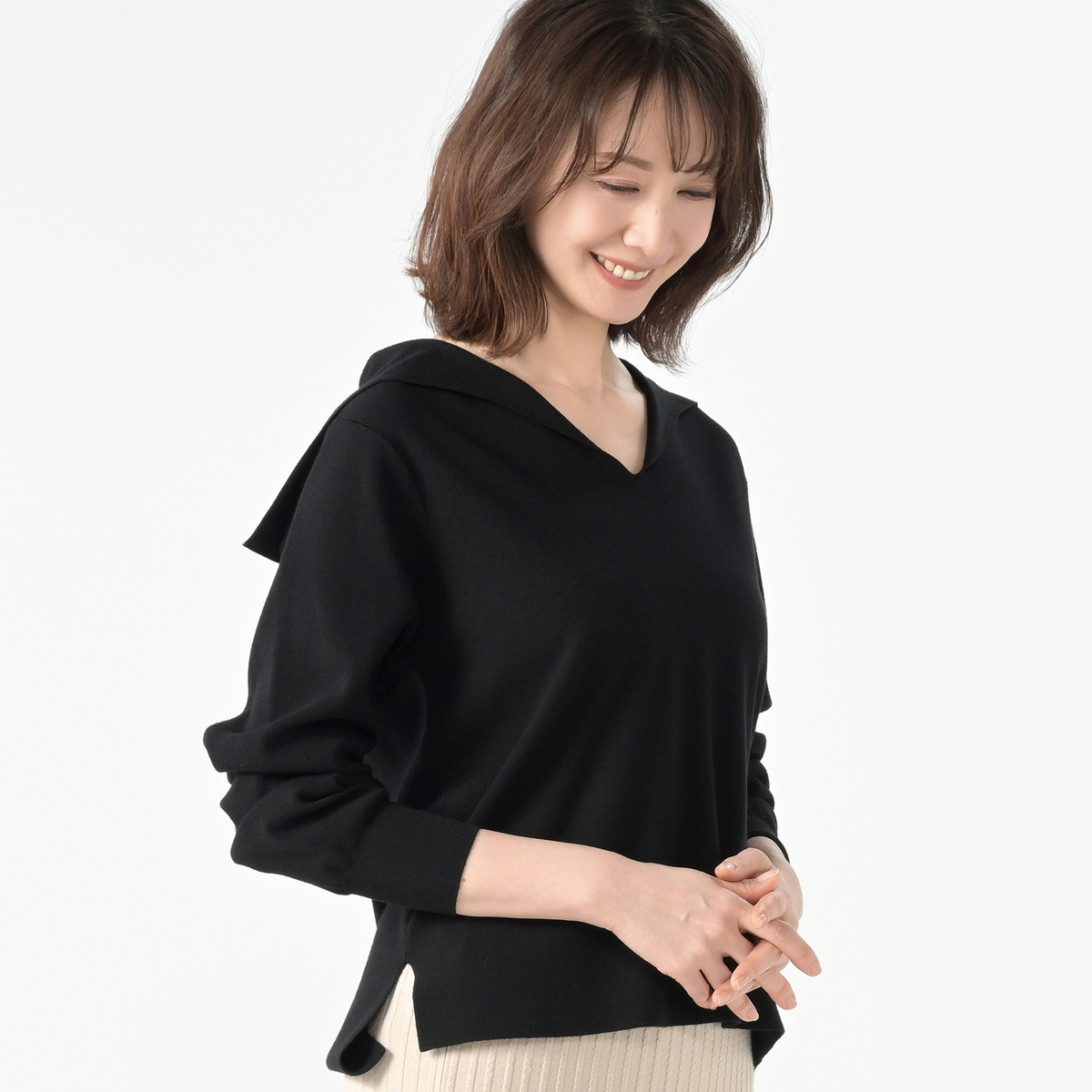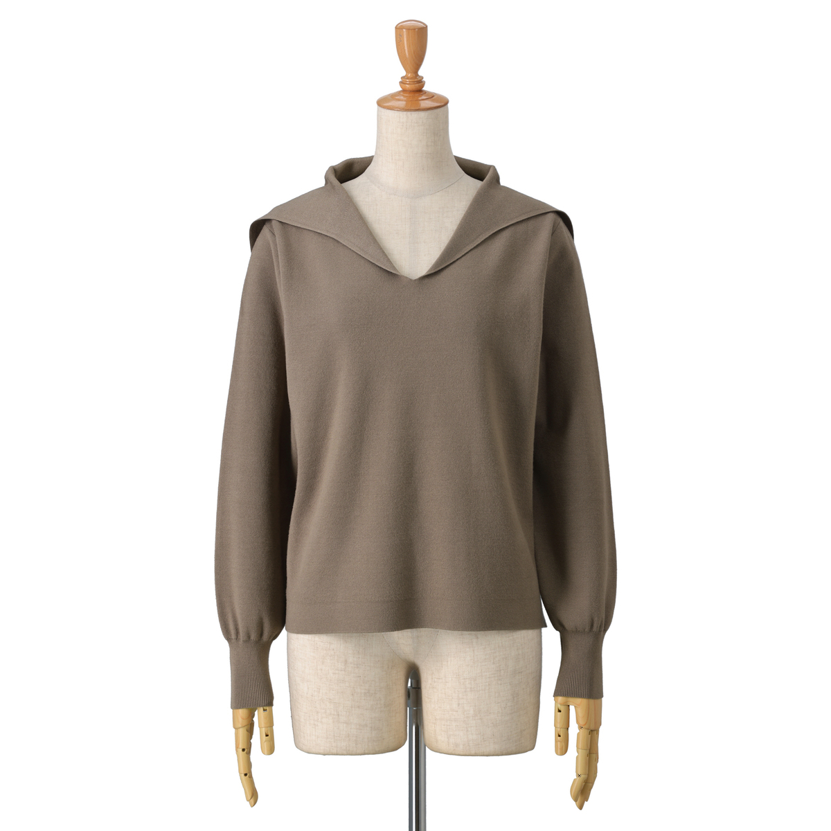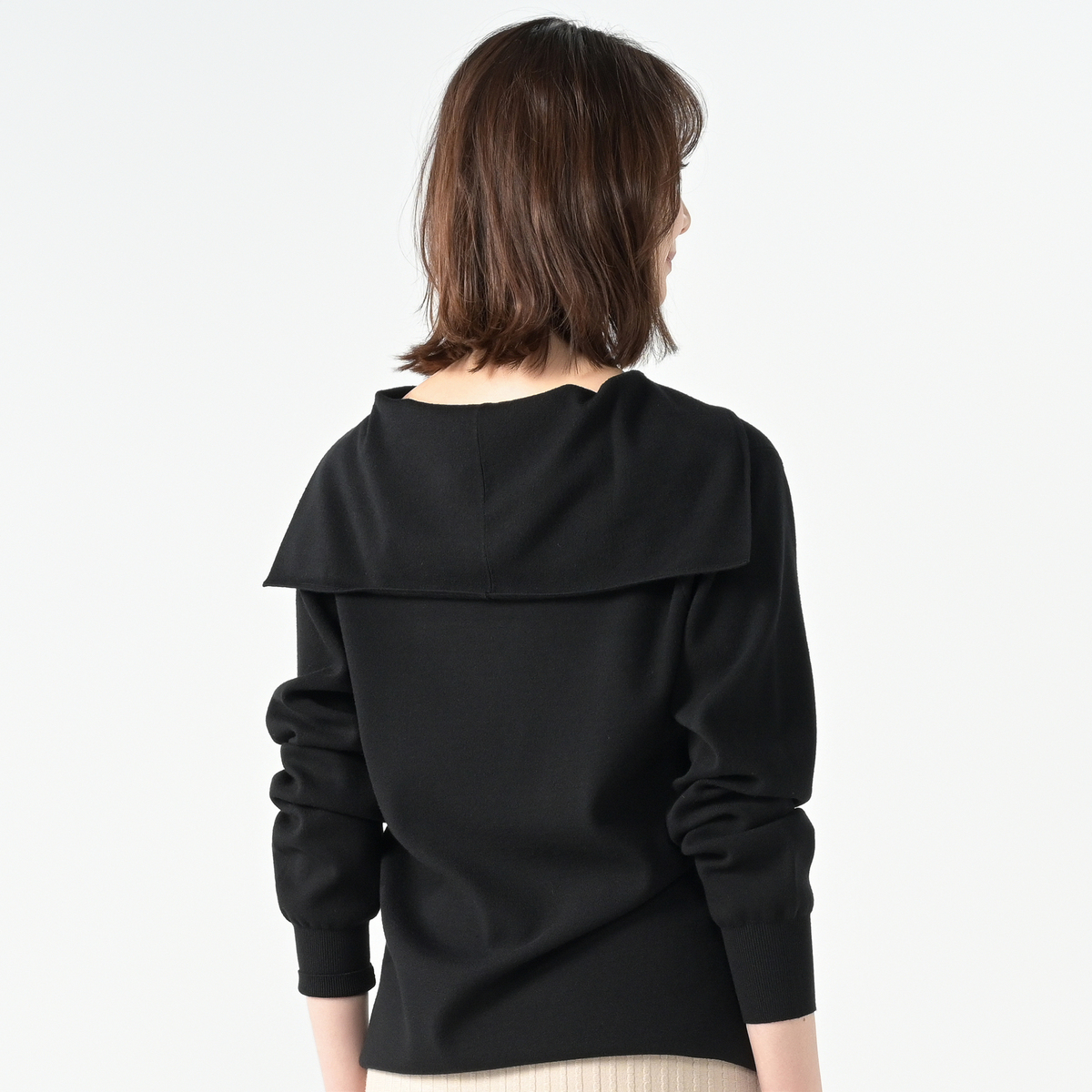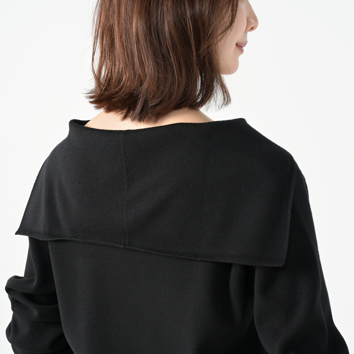 14Gハーフミラノ編みのセーラーカラーニット。セーラーカラーは前身頃から編み続きのデザインに。衿元はすっきりと美しく見え、上品な印象を演出します