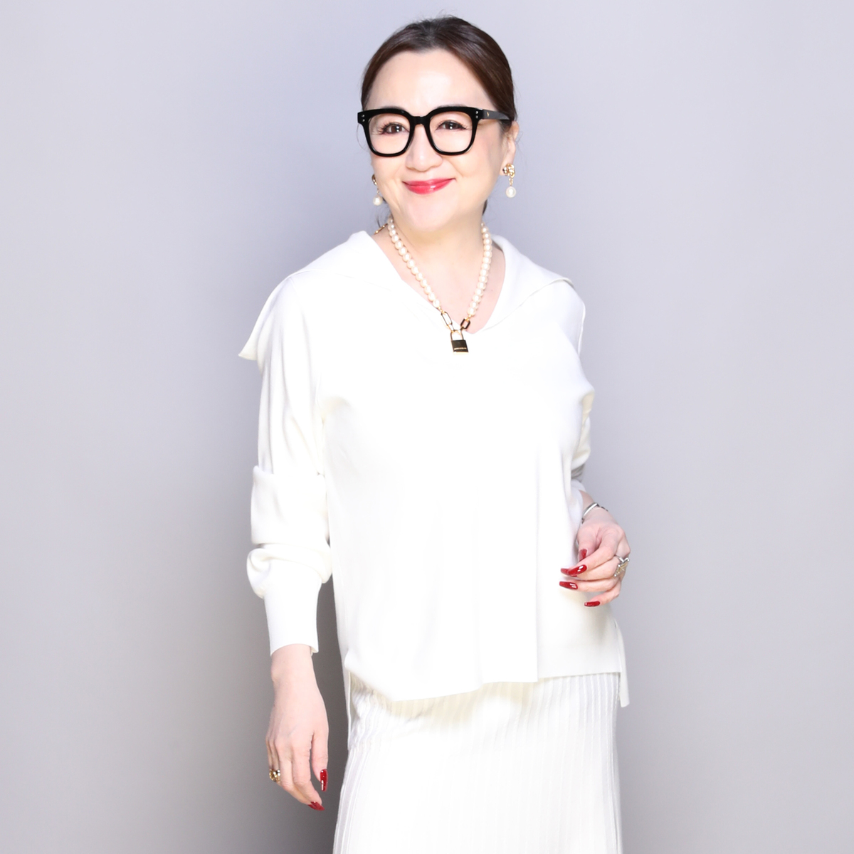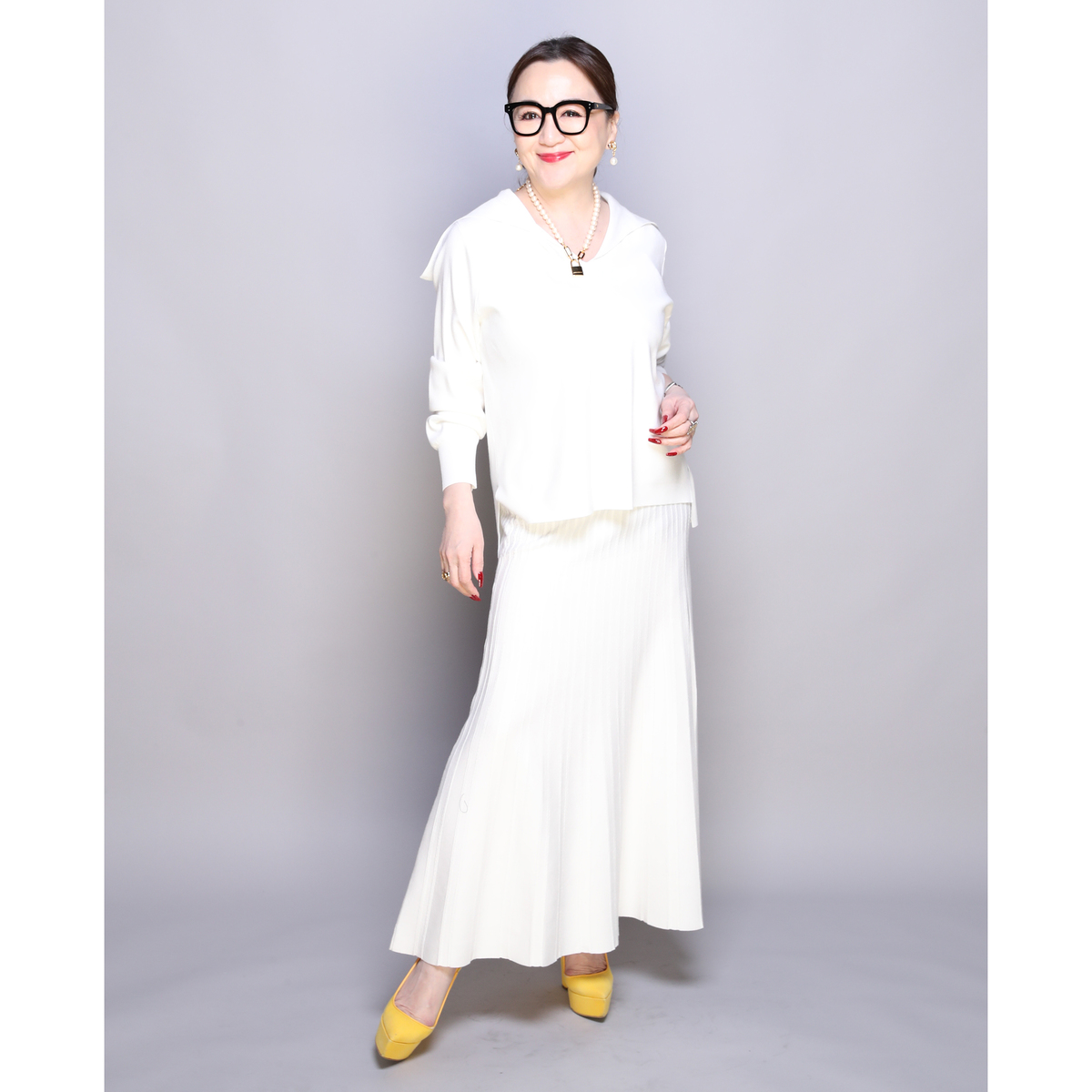 14Gハーフミラノ編みのセーラーカラーニット。セーラーカラーは前身頃から編み続きのデザインに。衿元はすっきりと美しく見え、上品な印象を演出します