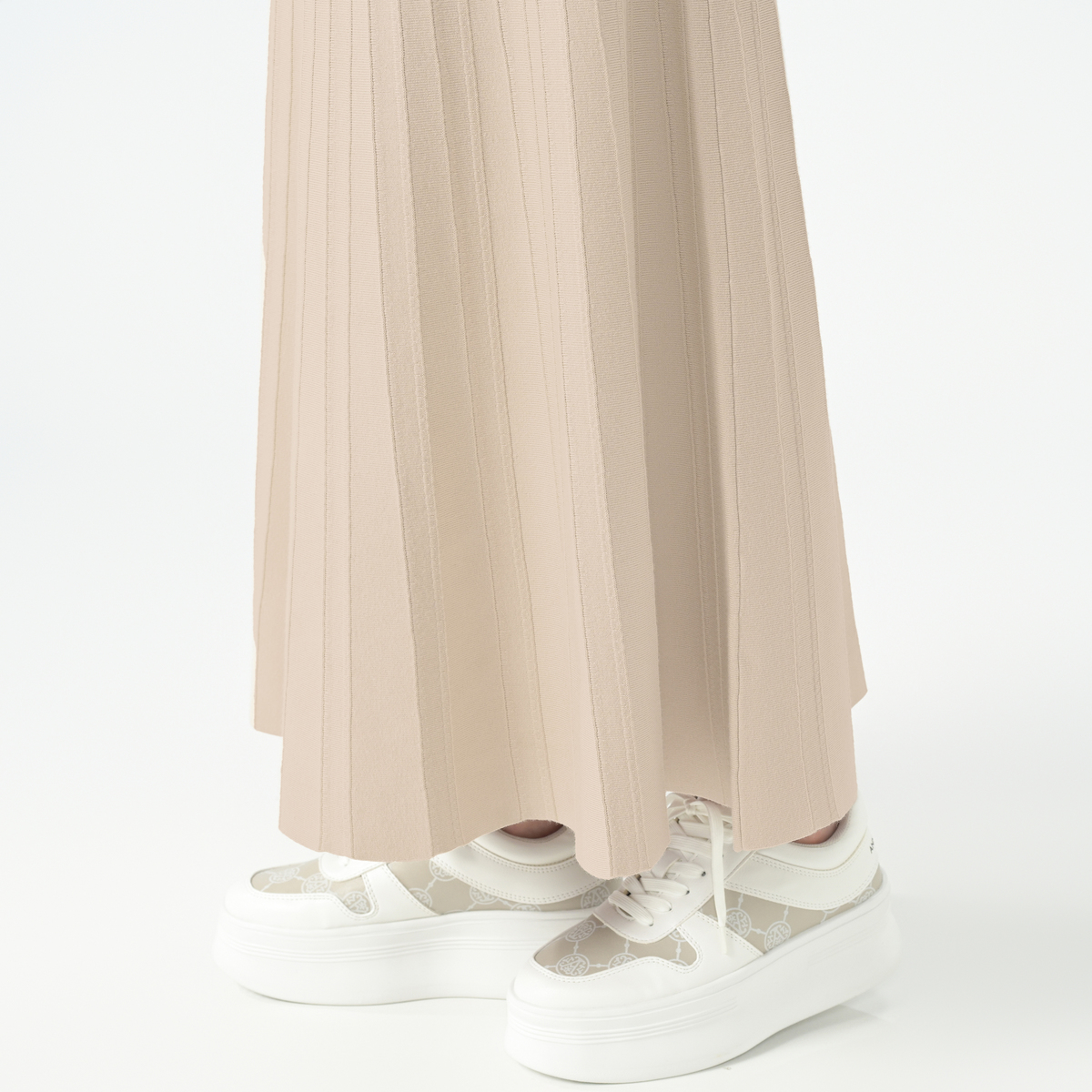 3種類の編み組織を組合せたテクニックニットスカートです。裾に向かって広がるフレアラインを引き返し編みで表現し、動きに合わせて美しいシルエットを描きます