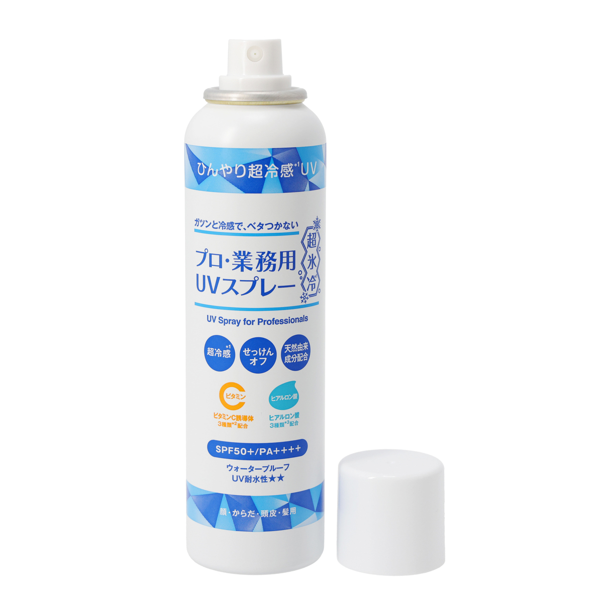 プロ・業務用シリーズから、顔・からだ・頭皮・髪に使えるUVスプレーをご紹介。SPF50+/PA++++、UV耐水性★★、ウォータープルーフで汗や水に強く、ベタつきにくいのもポイント。乳酸メンチル、メチルジイソプロピプロピオン酸アミドを加えた冷感成分(*1)を配合しています