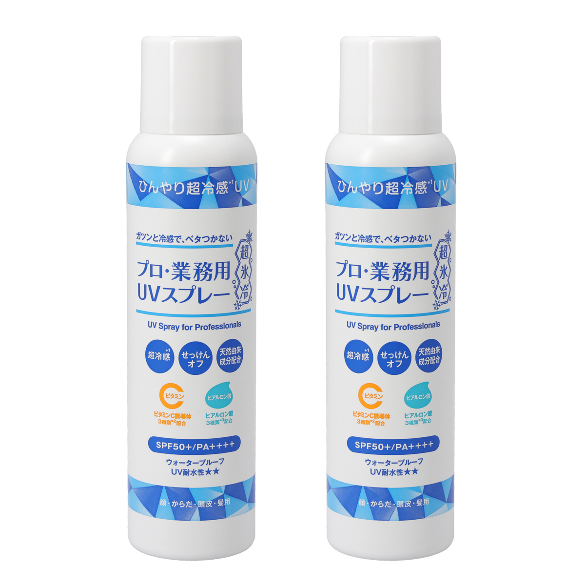 [商品内容] プロ・業務用UVスプレーE(90g)×2 ※SPF50+/PA++++ [使用方法] ・よく振ってから、缶をまっすぐ立てた状態でお肌から20cm前後離してムラなくスプレーしてください ・お顔に使用するときは一度てのひらに出してから少量ずつ伸ばしてください ・逆さまにしてもご使用いただけます [注意事項] ※同じ箇所に連続して3秒以上噴射しないでください ※2〜3時間で付け直してください ※噴射ガスを直接吸入しないようにご注意ください ※お肌に異常が生じていないかよく注意してご使用ください ※お肌に合わないときは、ご使用をおやめください。使用中、または使用後日光にあたって、はれ、かゆみ、刺激、色抜け(白斑等)や黒ずみ等の以上が生じた場合には、使用を中止し、皮膚科専門医等へご相談をおすすめします。そのまま化粧品類の使用を続けますと悪化することがあります ※傷やはれもの、しっしん等、異常のある部位にはお使いにならないでください ※目に入ったときは直ちに水または、ぬるま湯で洗い流してください ※目や粘着付近では使用しないでください ※使用後は必ずしっかりとキャップを閉めてください ※缶を横向きにしたまま使用しないでください。ガスだけが抜けて最後まで使用できなくなる場合があります ※衣類にかからないようにご注意ください。洗濯の際は塩素系漂白剤のご使用はお止めください ※乳幼児の手の届けない場所に保管してください ※捨てるときは、火気のない屋外で噴射音が消えてるまでボタンを押し、ガスを抜き、市町村の廃棄方法に従い処分してください <火気と高温に注意> ※高圧ガスを使用した可燃性の製品であり、危険なため、下記の注意を守ること 1:炎や火気の近くで使用しないこと 2:火気を使用している室内で大量に使用しないこと 3:高温にすると破裂の危険があるため、直射日光の当たる所や火気等の近くなど温度が40℃以上となる所に置かないこと 4:火の中に入れないこと 5:使い切って捨てること 高圧ガス:LPG 【日本製】 [成分] LPG、水、シクロペンタシロキサン、パルミチン酸エチルヘキシル、水添ポリイソブテン、メトキシケイヒ酸エチルヘキシル、ポリメチルシルセスキオキサン、テトラヘキシルデカン酸アスコルビル、アスコルビルグルコシド、リン酸アスコルビルMg、ヒアルロン酸Na、加水分解ヒアルロン酸、アセチルヒアルロン酸Na、メントキシプロバンジオール、メントール、乳酸メンチル、メチルジイソプロピルプロピオン酸アミド、 シクロヘキサン-1.4-ジカルボン酸ビスエトキシジグリコール、ユキノシタエキス、オウゴン根エキス、ヒマワリ種子油、セイヨウシナノキ花/葉エキス、アセロラ果実エキス、アルガニアスピノサ核油、チャ葉エキス、ユズ果実エキス、グリチルリチン酸2K、BG、ジエチルアミノヒドロキシベンゾイル安息香酸ヘキシル、オクトクリレン、ビスエチルヘキシルオキシフェノールメトキシフェニルトリアジン、トリメチルシロキシケイ酸、オクテニルコハク酸デンプンAI、PEG-10ジメチコン、 PEG/PPG-19/19ジメチコン、ジステアルジモニウムヘクトライト、ペンチレングリコール、フェノキシエタノール、セイヨウハッカ油