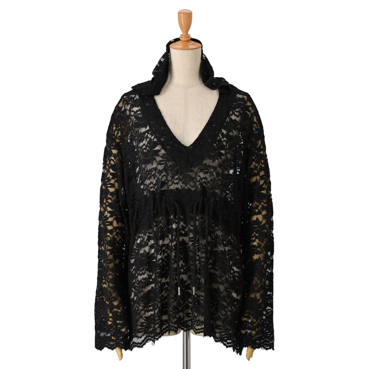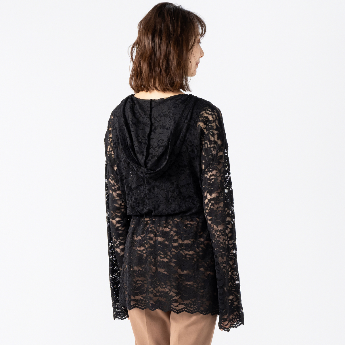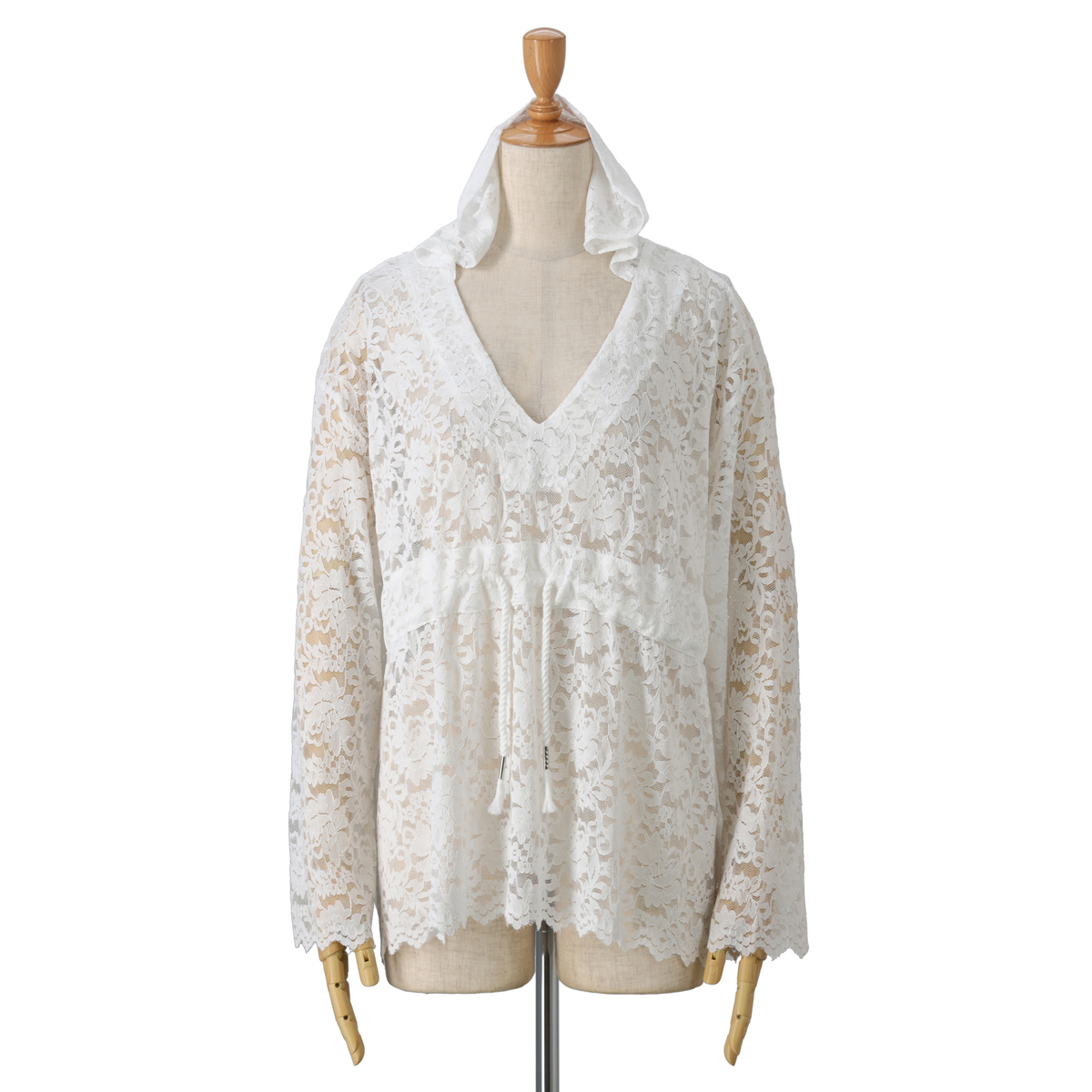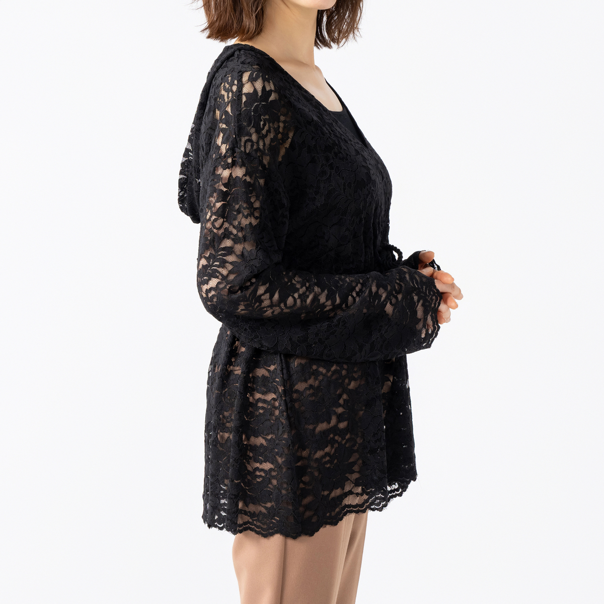 繊細な花柄レースを全面に使用したフーディープルオーバー。フード付きで甘さを抑え、カジュアルな雰囲気も楽しめます。中にタンクトップやキャミソールを合わせれば透け感を活かしたレイヤードコーデが楽しめます