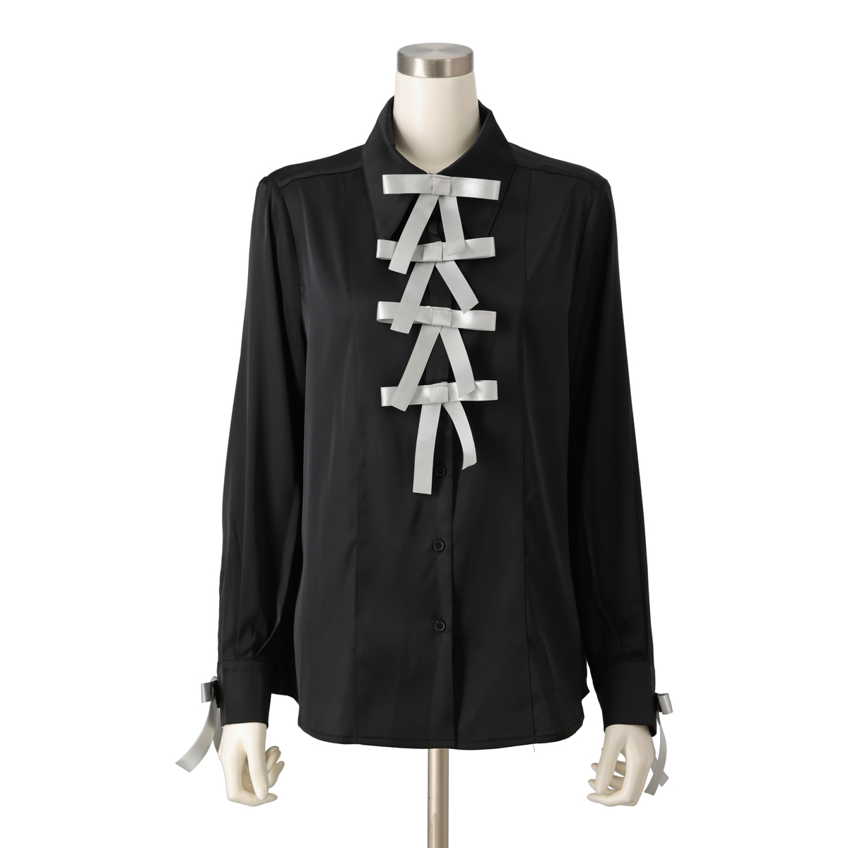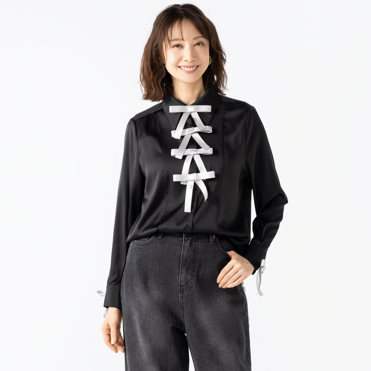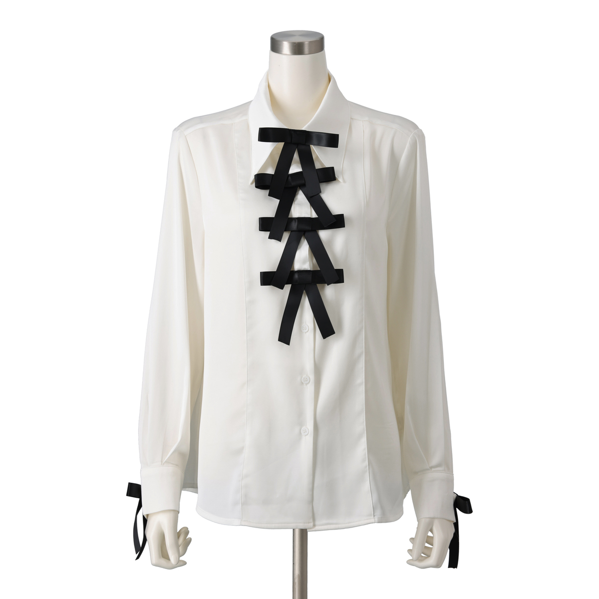 フロントのリボンが目を惹くブラウス。きちんと見えと華やかさを両立した一枚です。リボンは4つ1セットで取り外しができ、コーデに合わせてシンプルにしたり、華やかにしたりアレンジが楽しめます