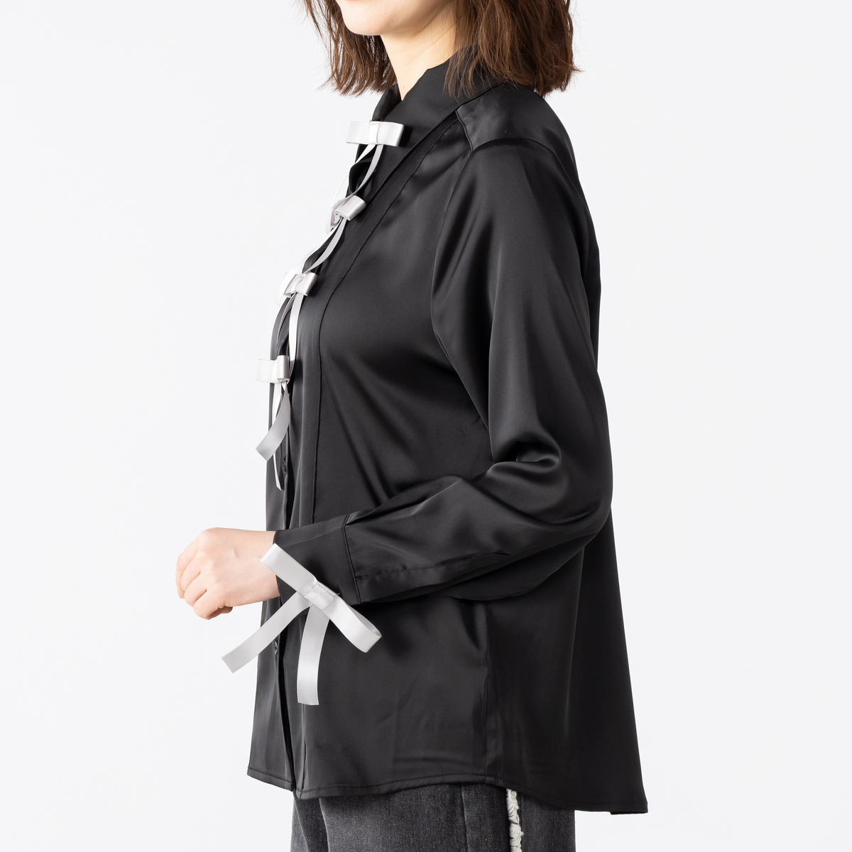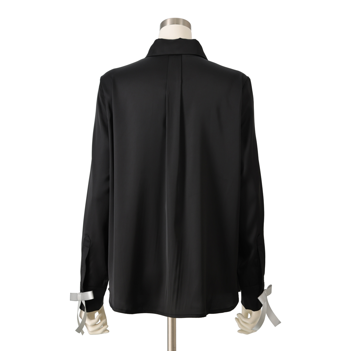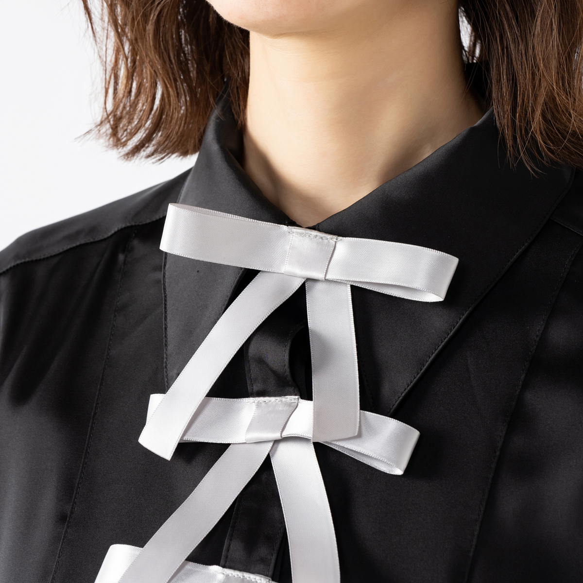袖口のリボンは取り外して襟元に付け替え可能。リボンはブローチタイプではなくボタンホールを使って留める仕様のため生地を傷める心配がありません