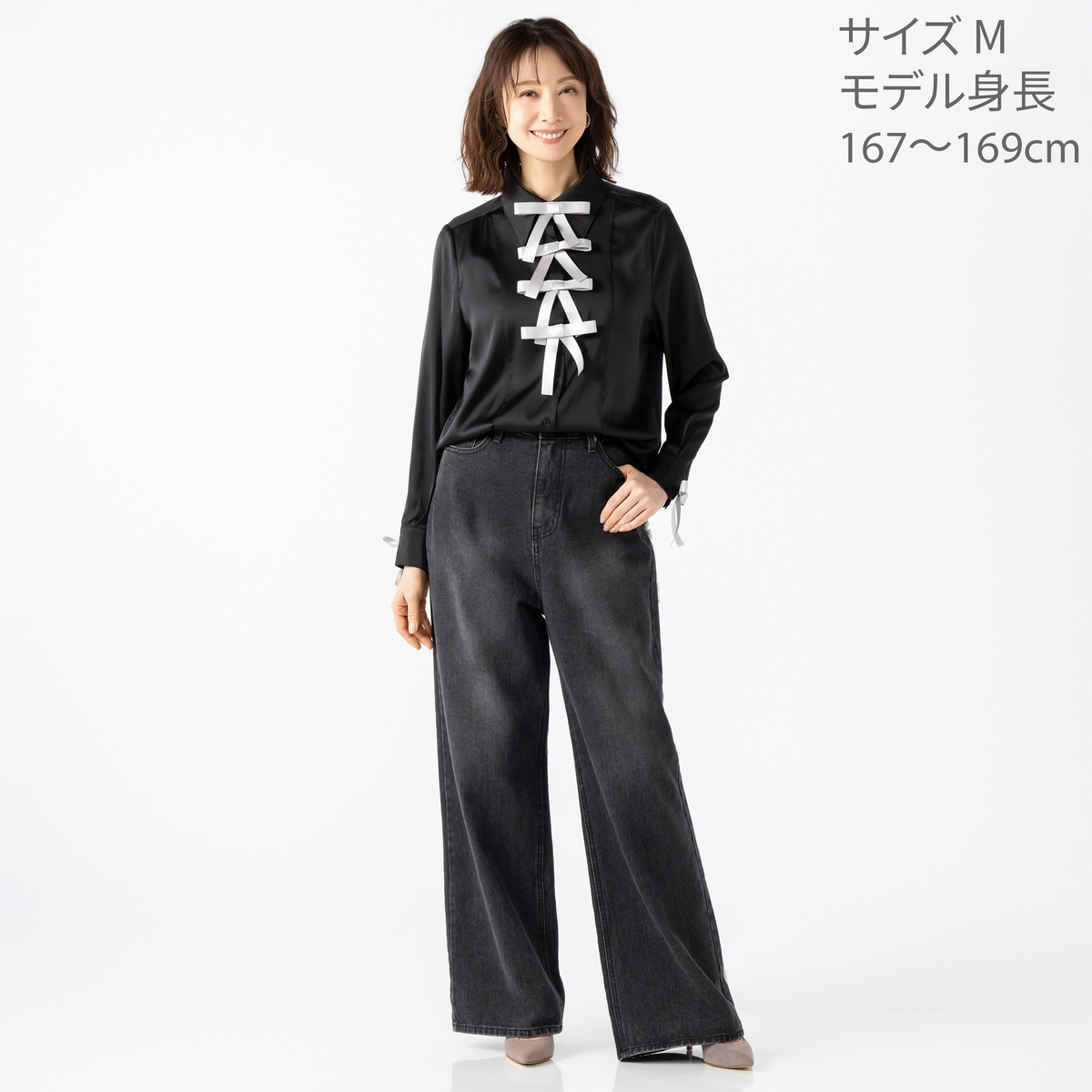 程よくゆとりのあるシルエットで身体のラインを拾いにくく、自然に体型をカバー。縦に配置されたリボンデザインなので甘くなりすぎず、縦ラインを強調してすっきりとした印象で着こなせます