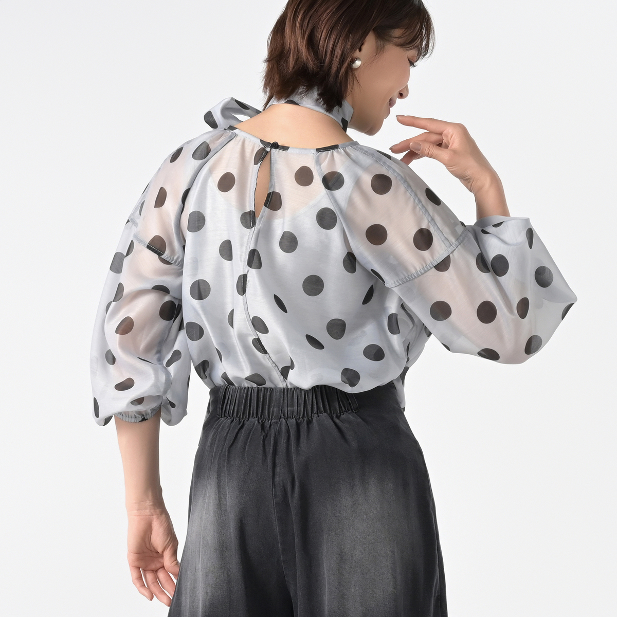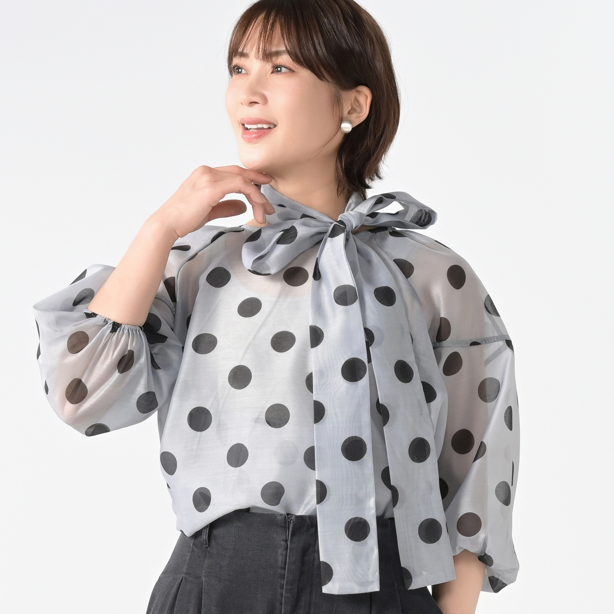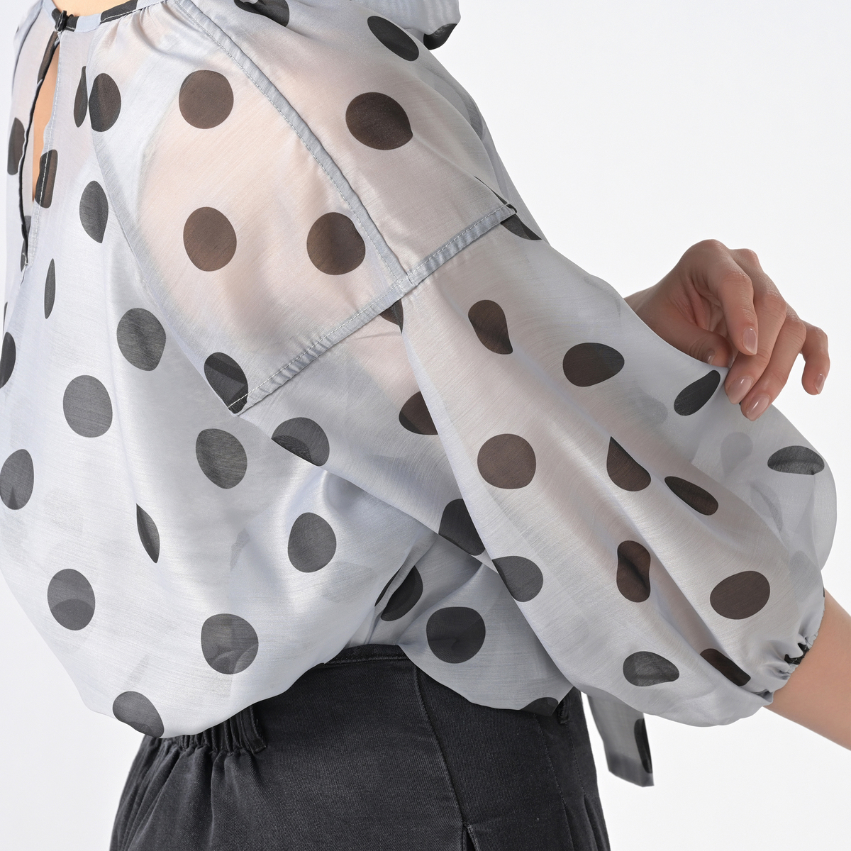 透け感のあるシアー素材に大胆なドットプリントを施したブラウス。ふんわりとしたシルエットがさりげなく体型をカバーし、ボリュームスリーブが華奢に見せてくれます