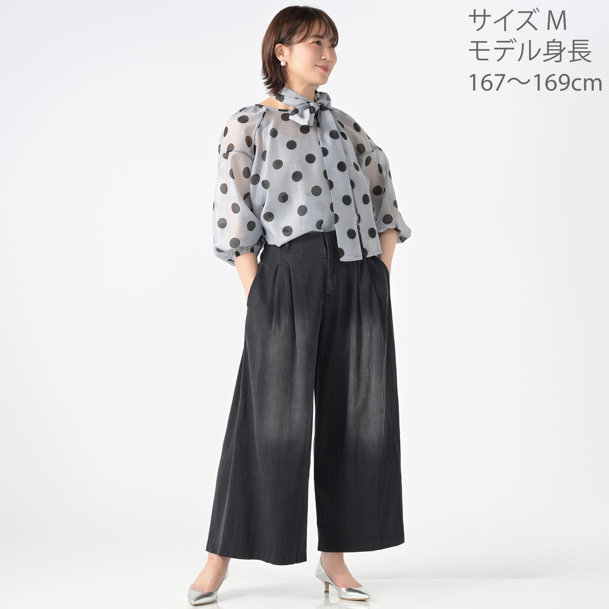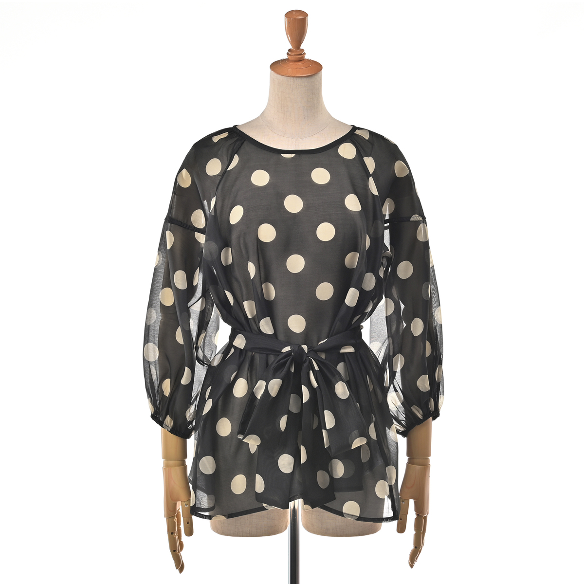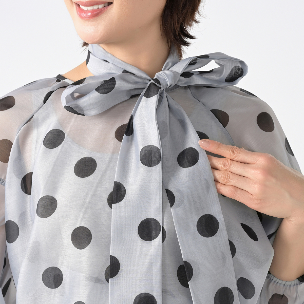 透け感のあるシアー素材に大胆なドットプリントを施したブラウス。ふんわりとしたシルエットがさりげなく体型をカバーし、ボリュームスリーブが華奢に見せてくれます
