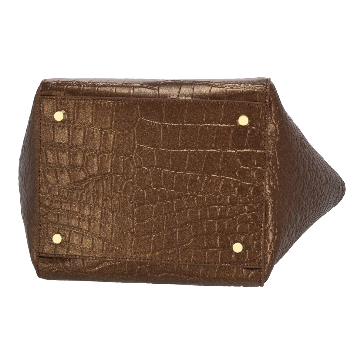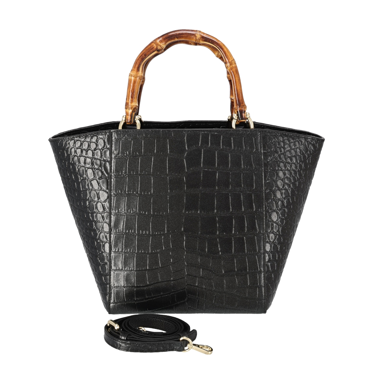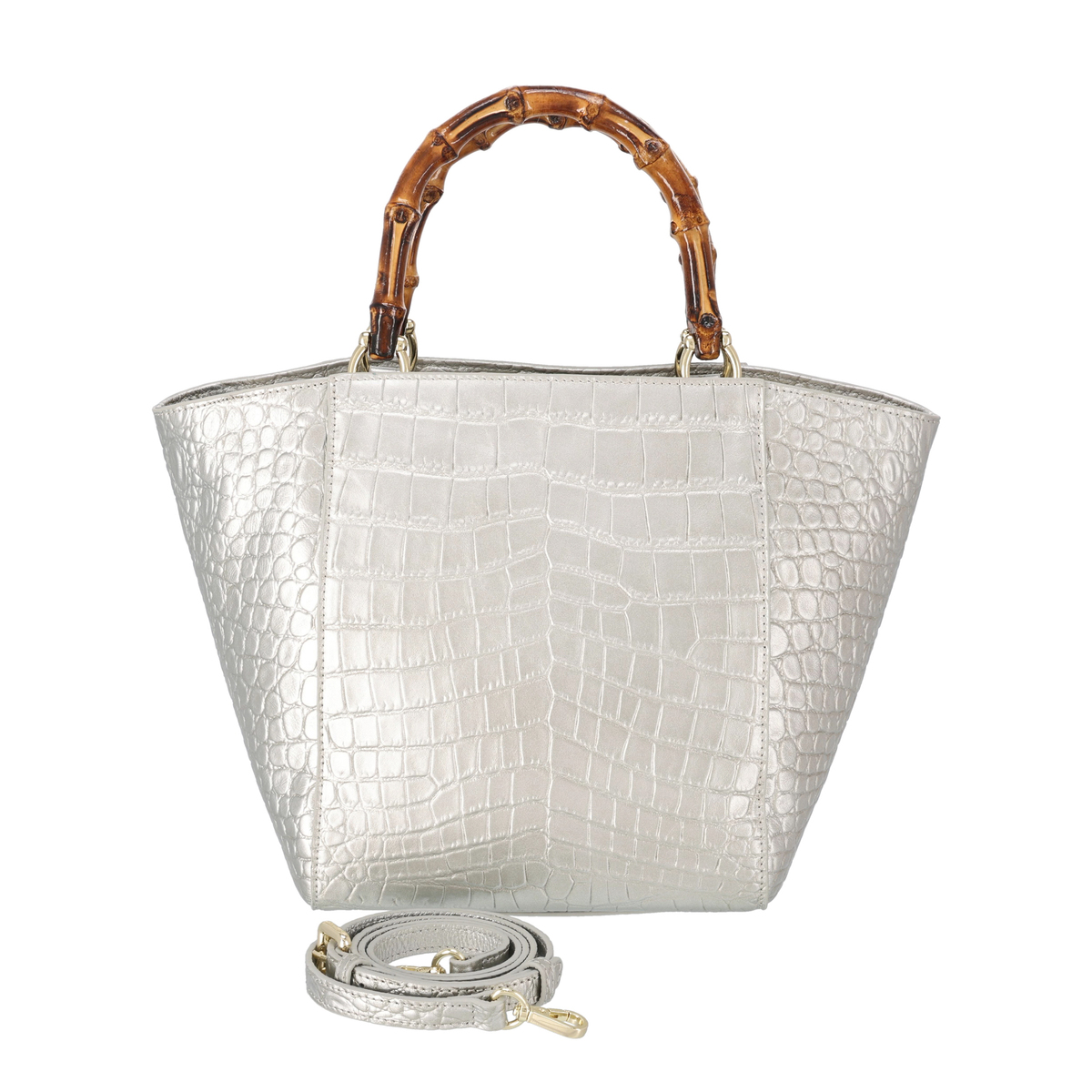 ラメ入りのクロコエンボス牛革を用いたスクエアバッグです。凹凸がはっきりとしたエンボスが高級感を引き立てるデザイン。ソフト感があり、大きめサイズながら約570gの軽さで日常使いにもおすすめです