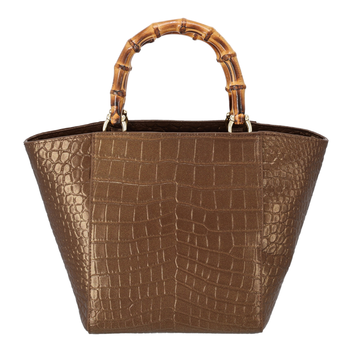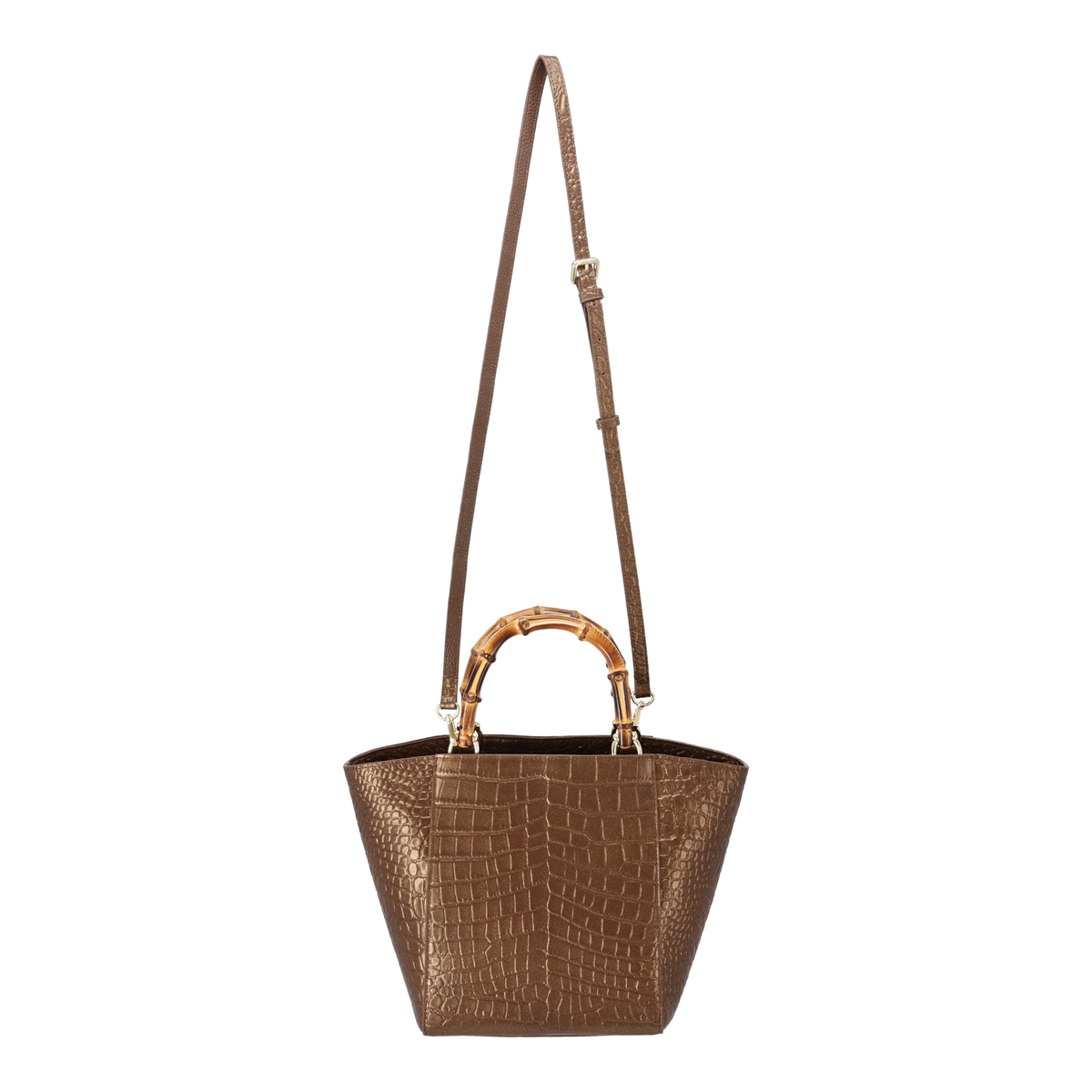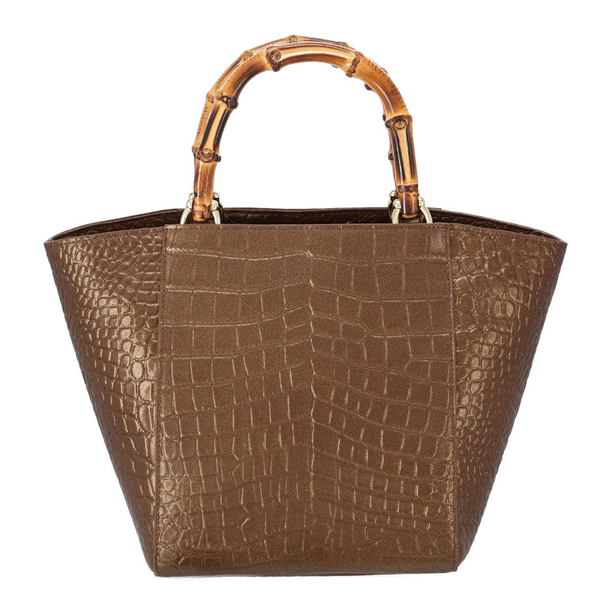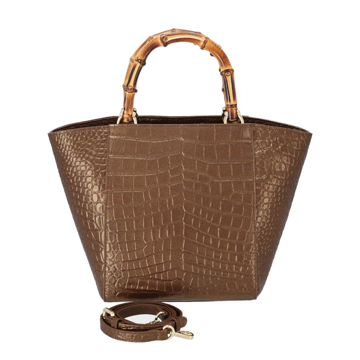ラメ入りのクロコエンボス牛革を用いたスクエアバッグです。凹凸がはっきりとしたエンボスが高級感を引き立てるデザイン。ソフト感があり、大きめサイズながら約570gの軽さで日常使いにもおすすめです